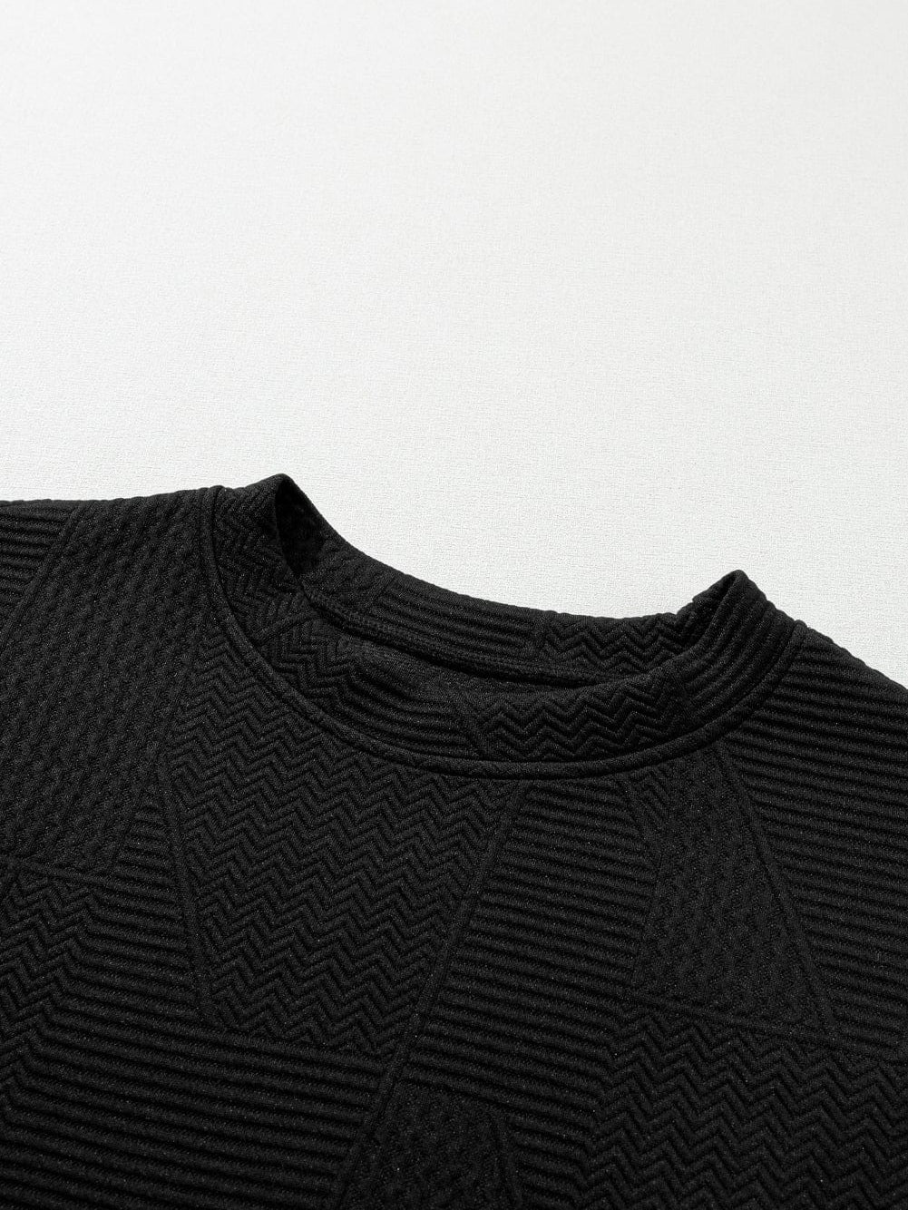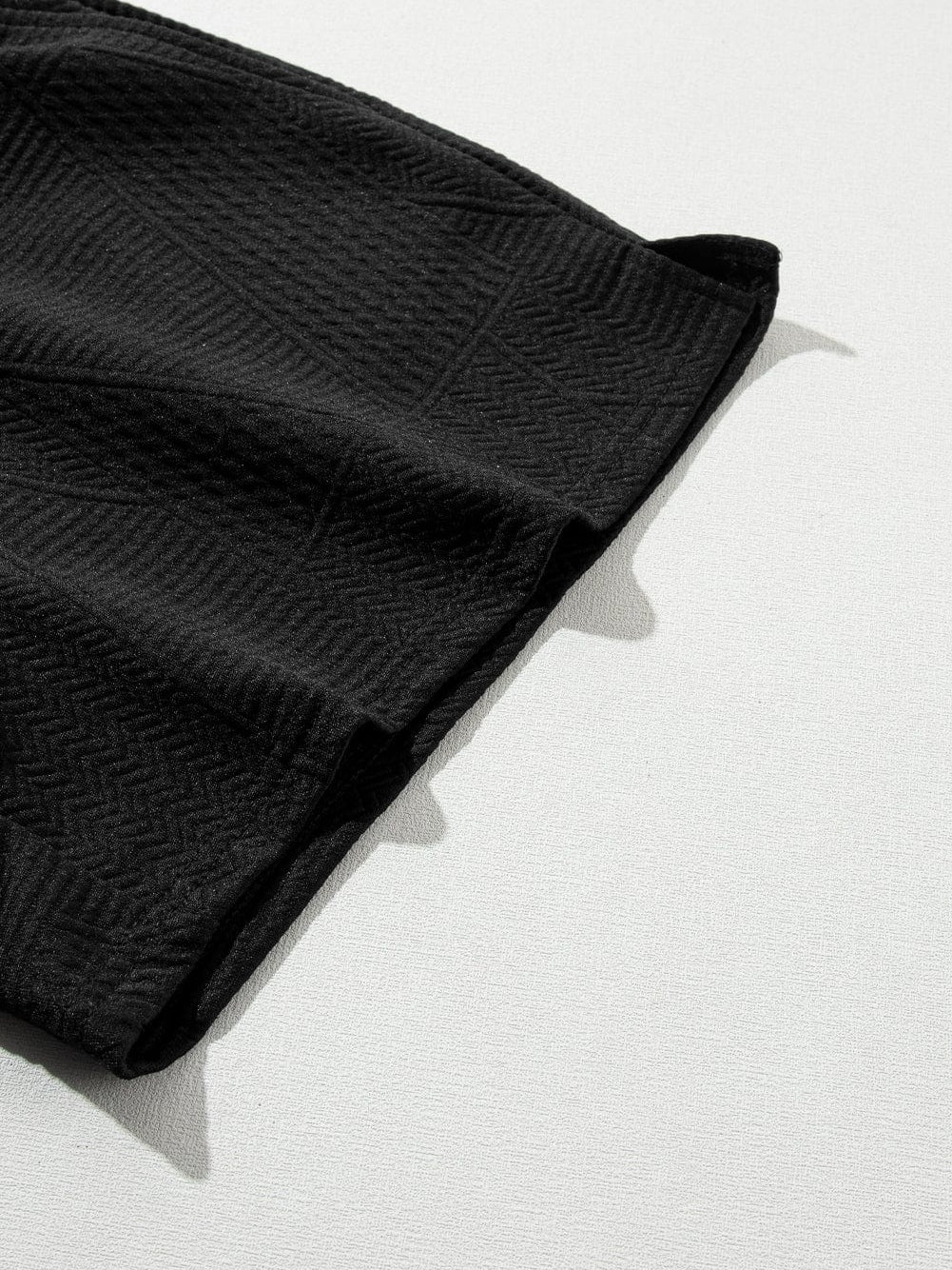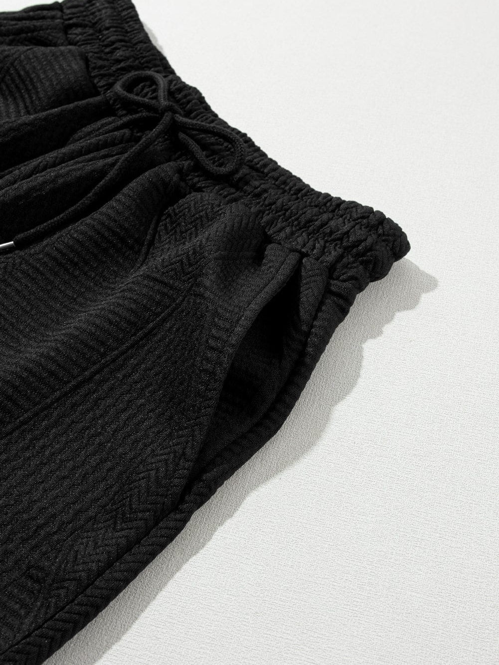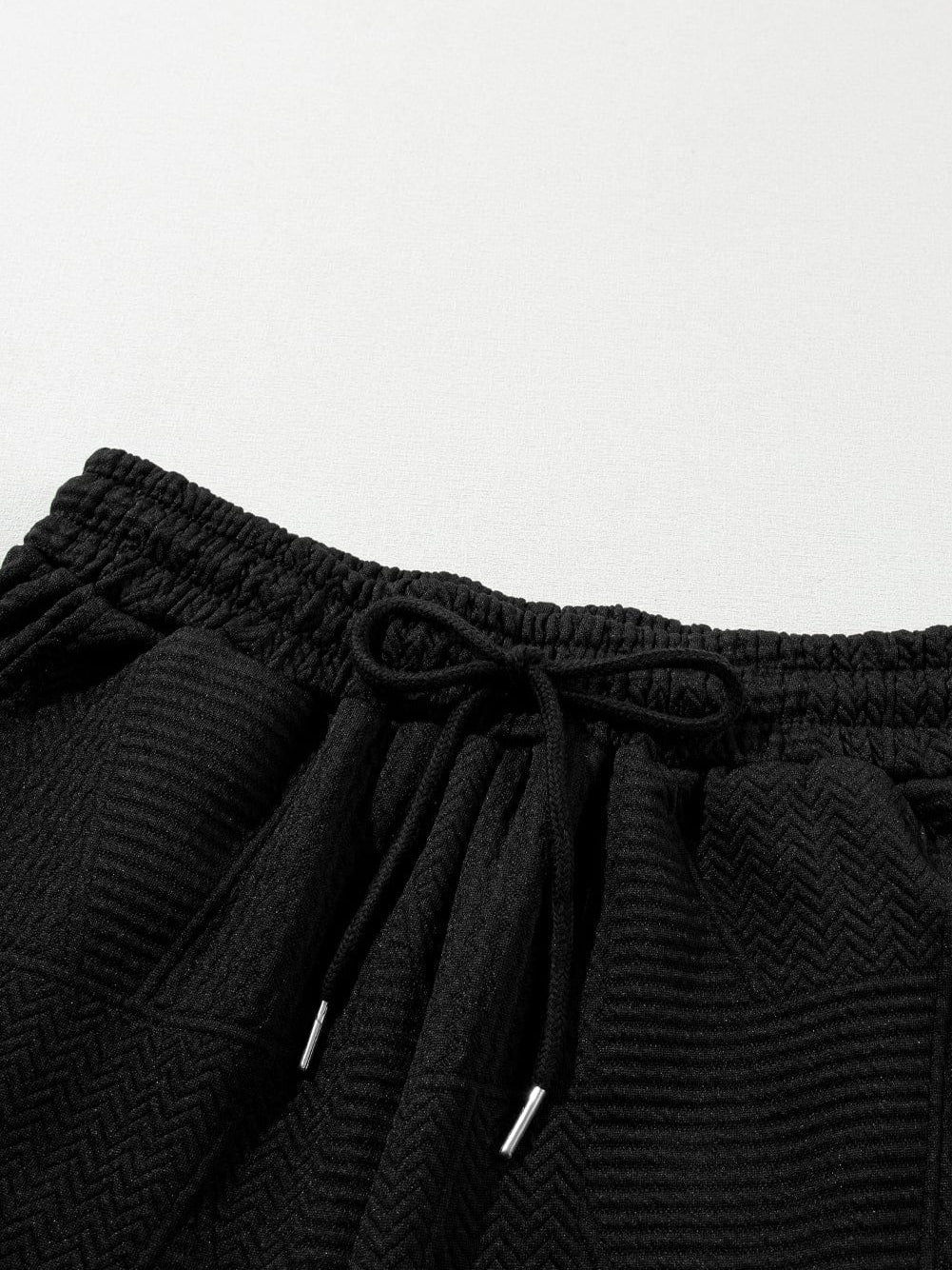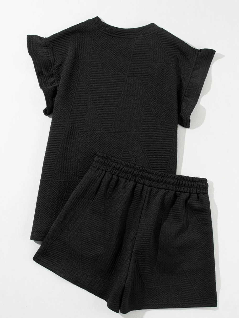 Black Ruffle Shoulder Two-Piece Set with Drawstring Shorts and Quilted Fabric
