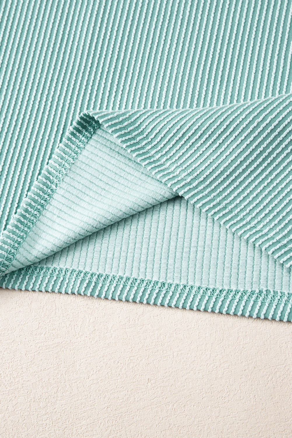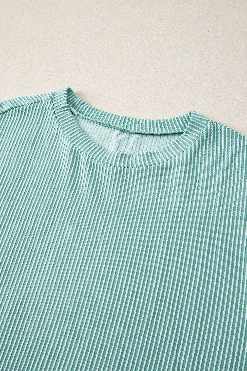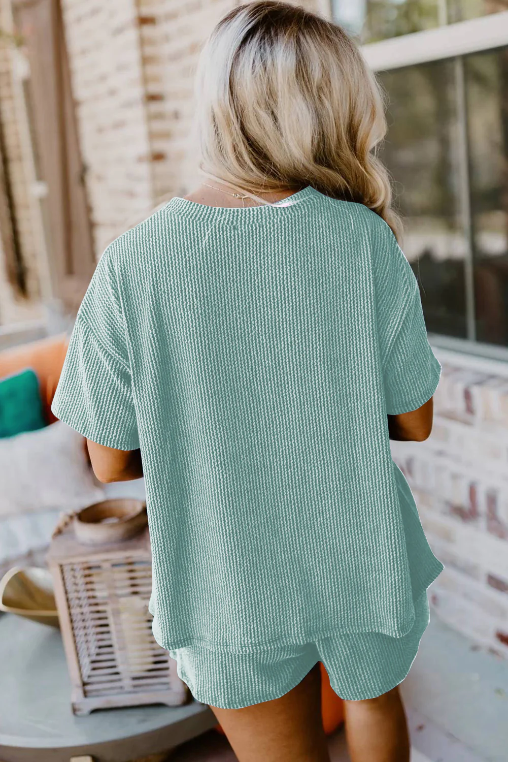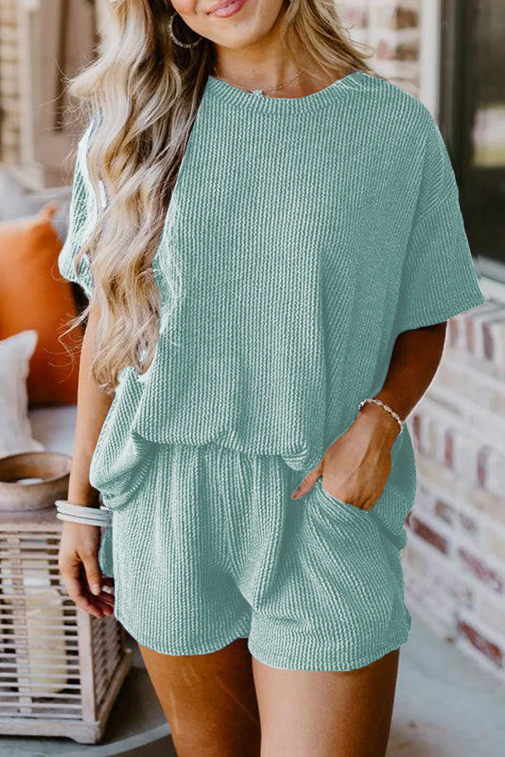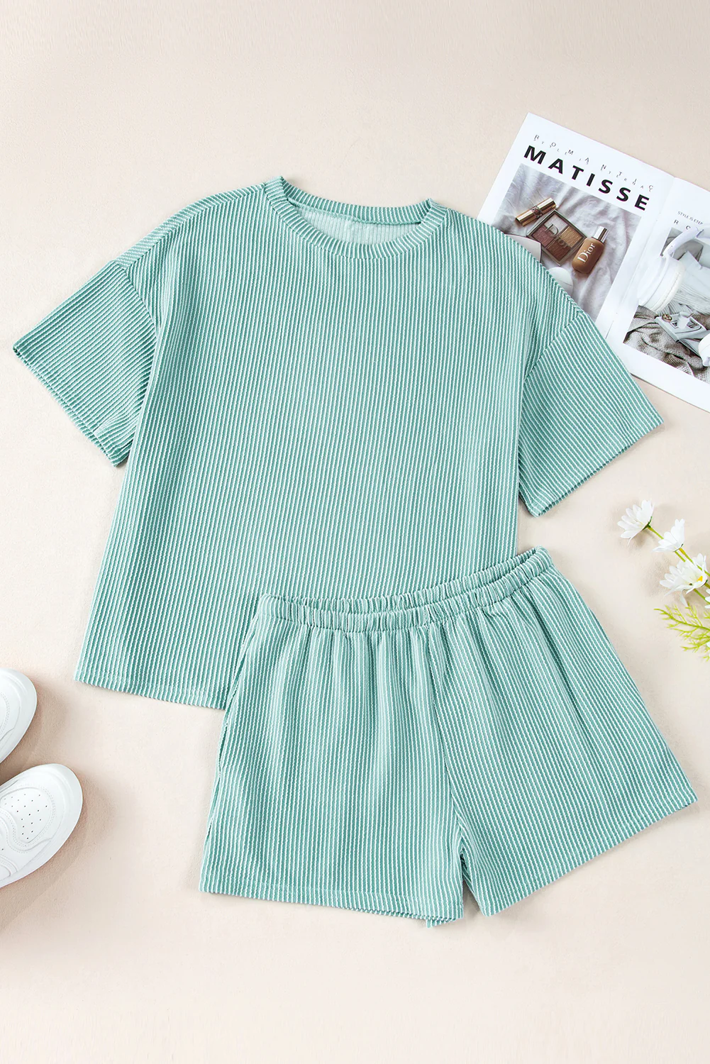 Jungle Green Ribbed Textured Knit Loose Fit Tee and Shorts Set