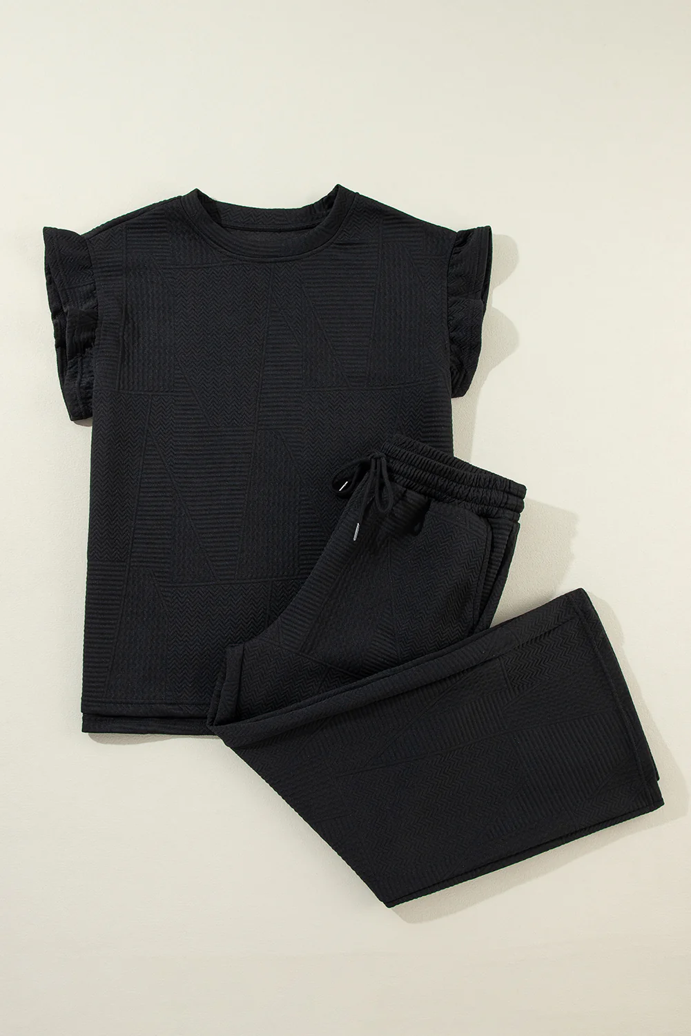Black Ruffled Sleeve Summer Top and Cropped Loose Pants Set