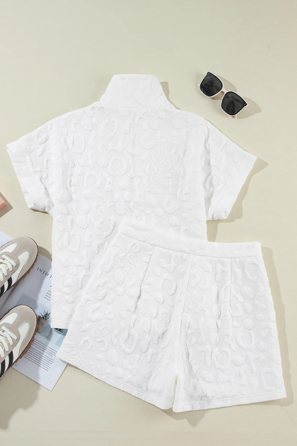 White Leopard Jacquard Quarter Zip Tee and Shorts Set