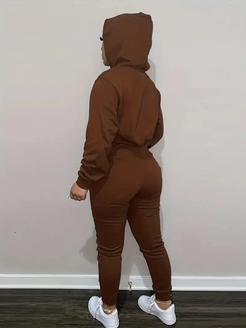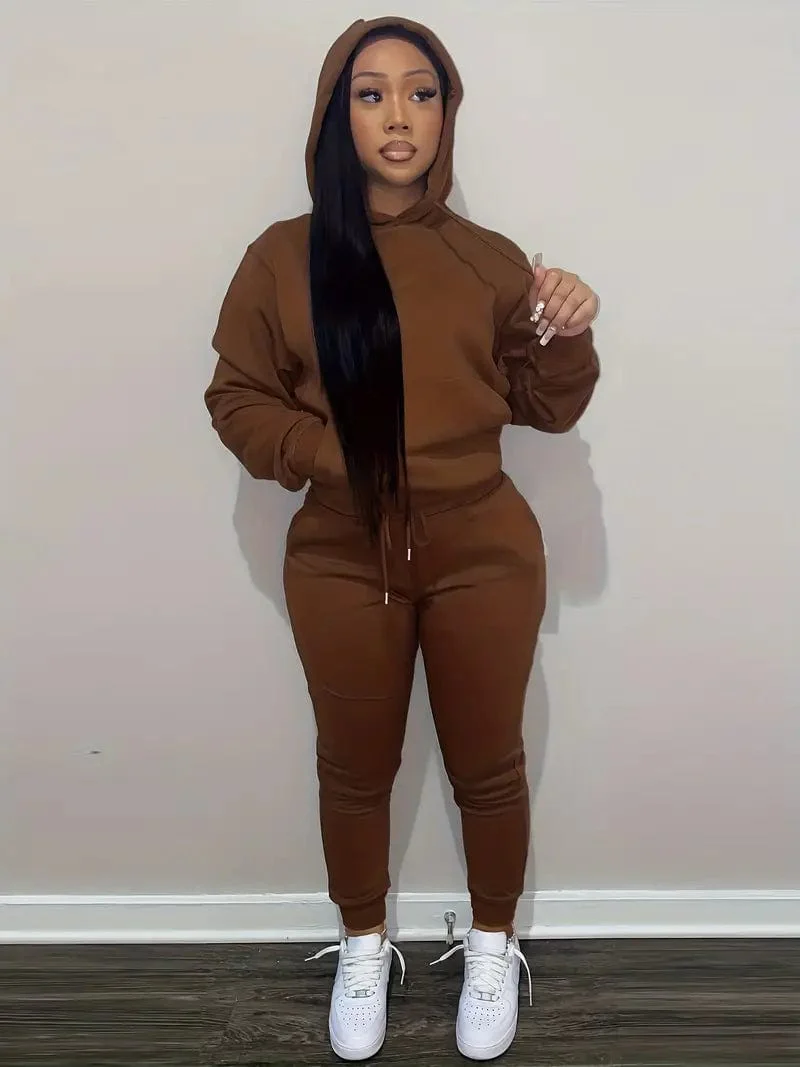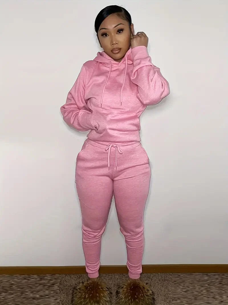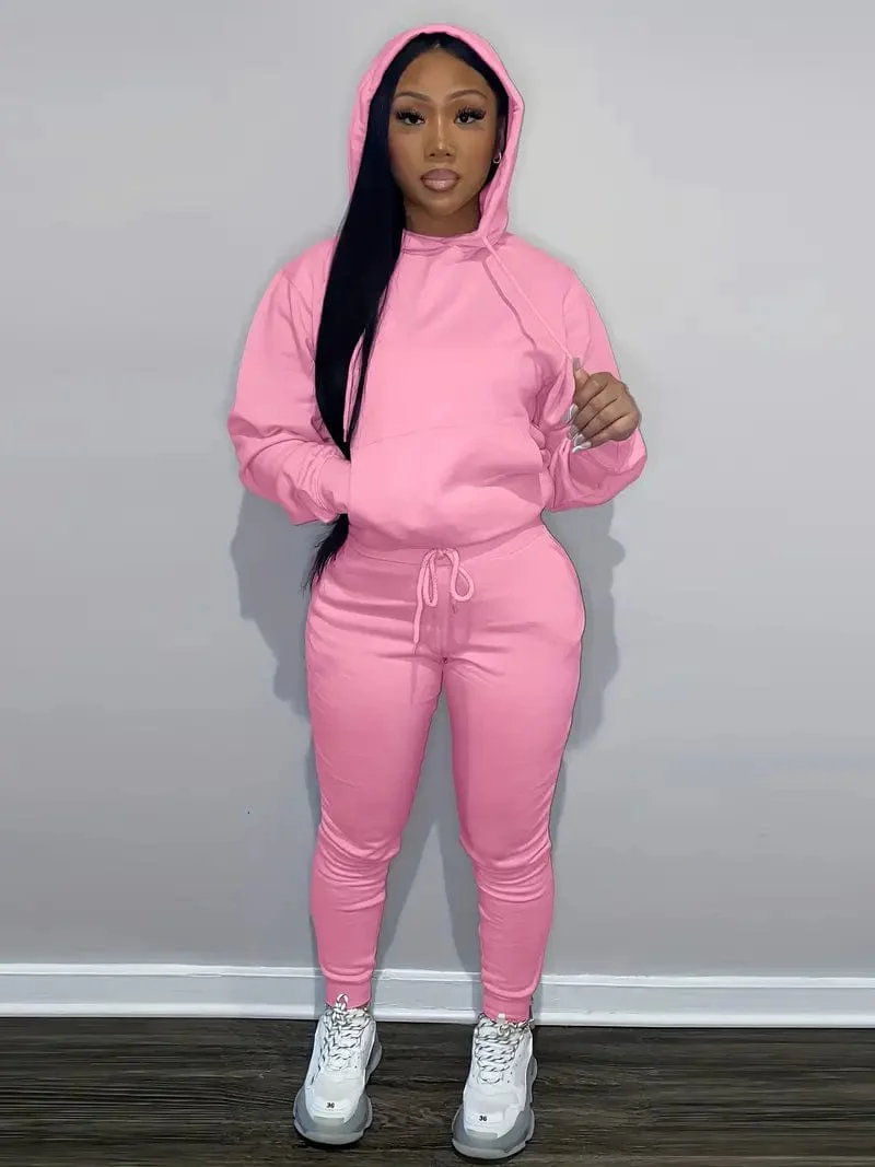 Solid Hooded Long Sleeve Tops Drawstring Pants Outdoor Sports Set