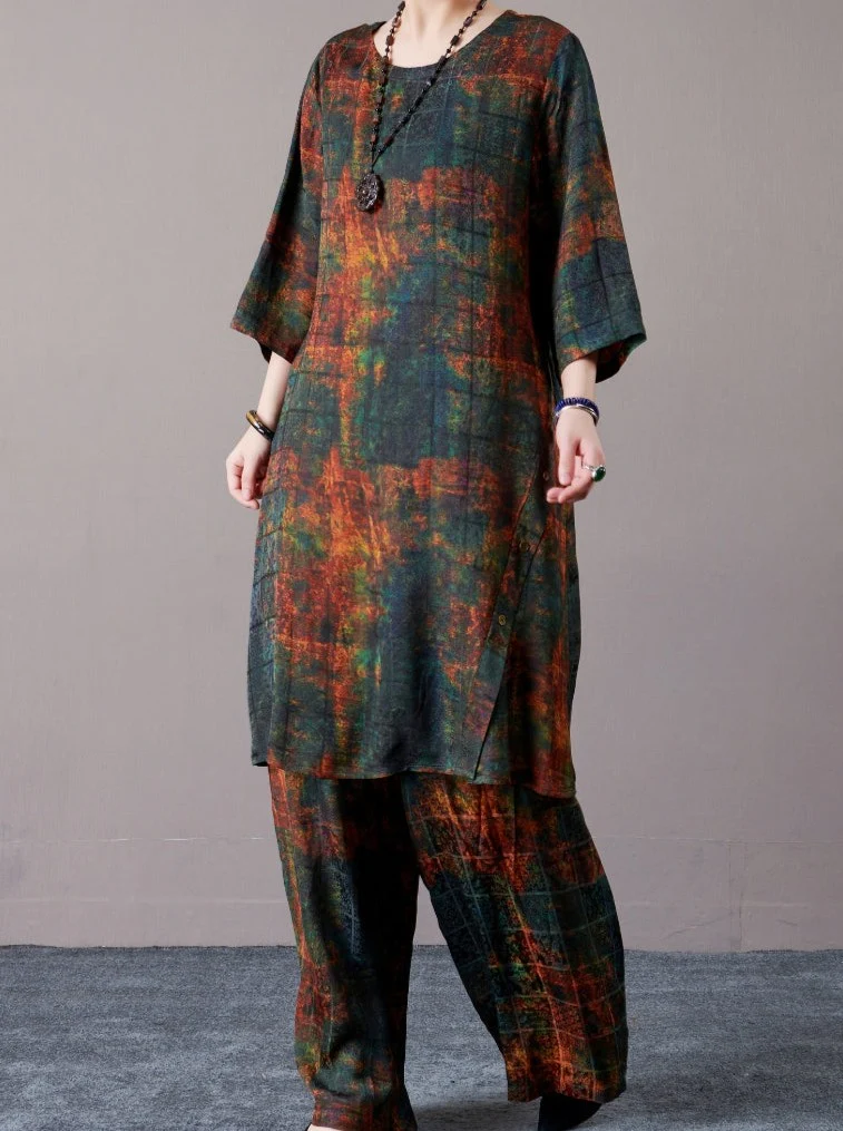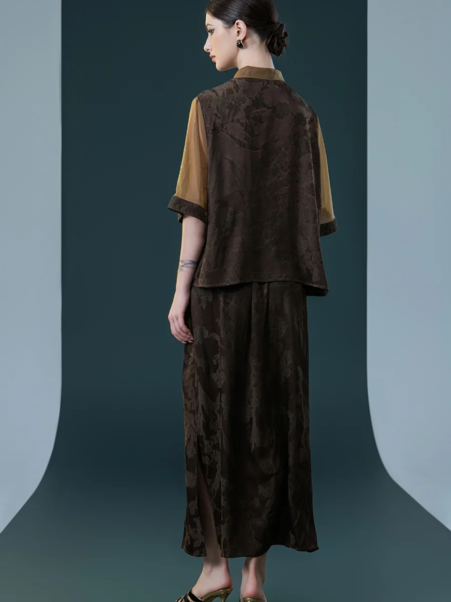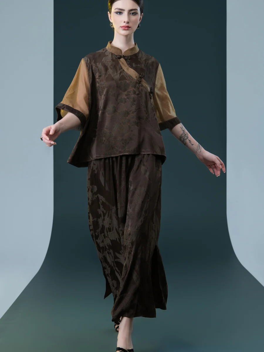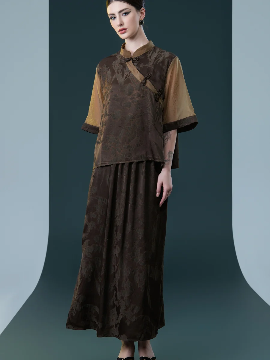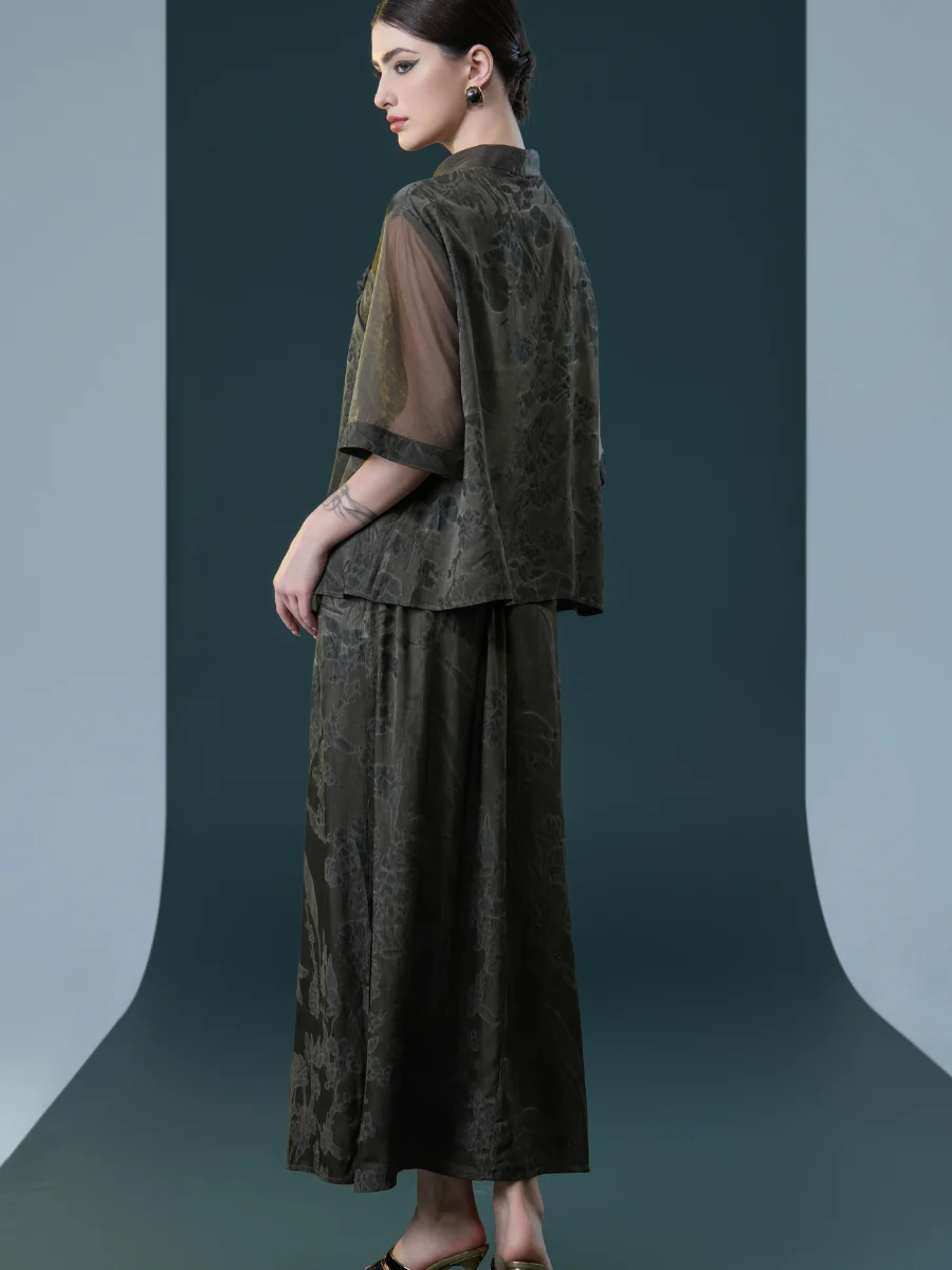Vintage-Inspired Olive Green Floral Set with Mandarin Collar