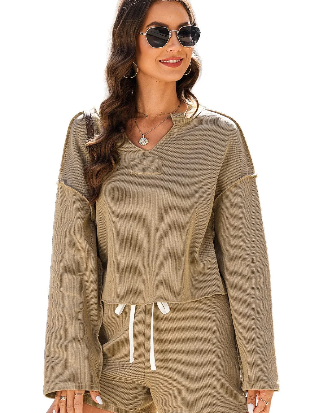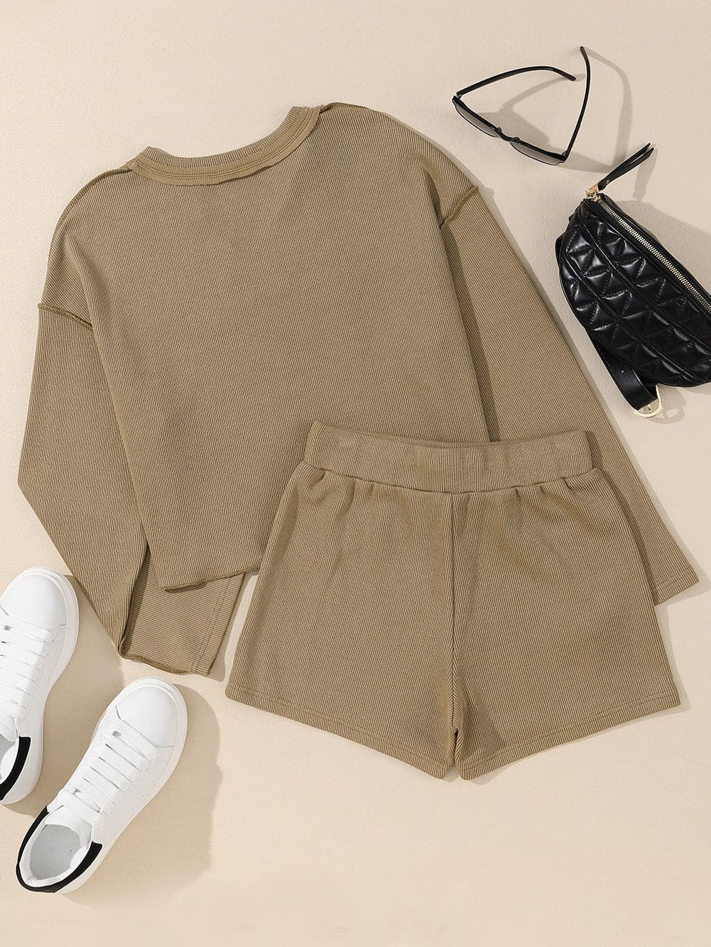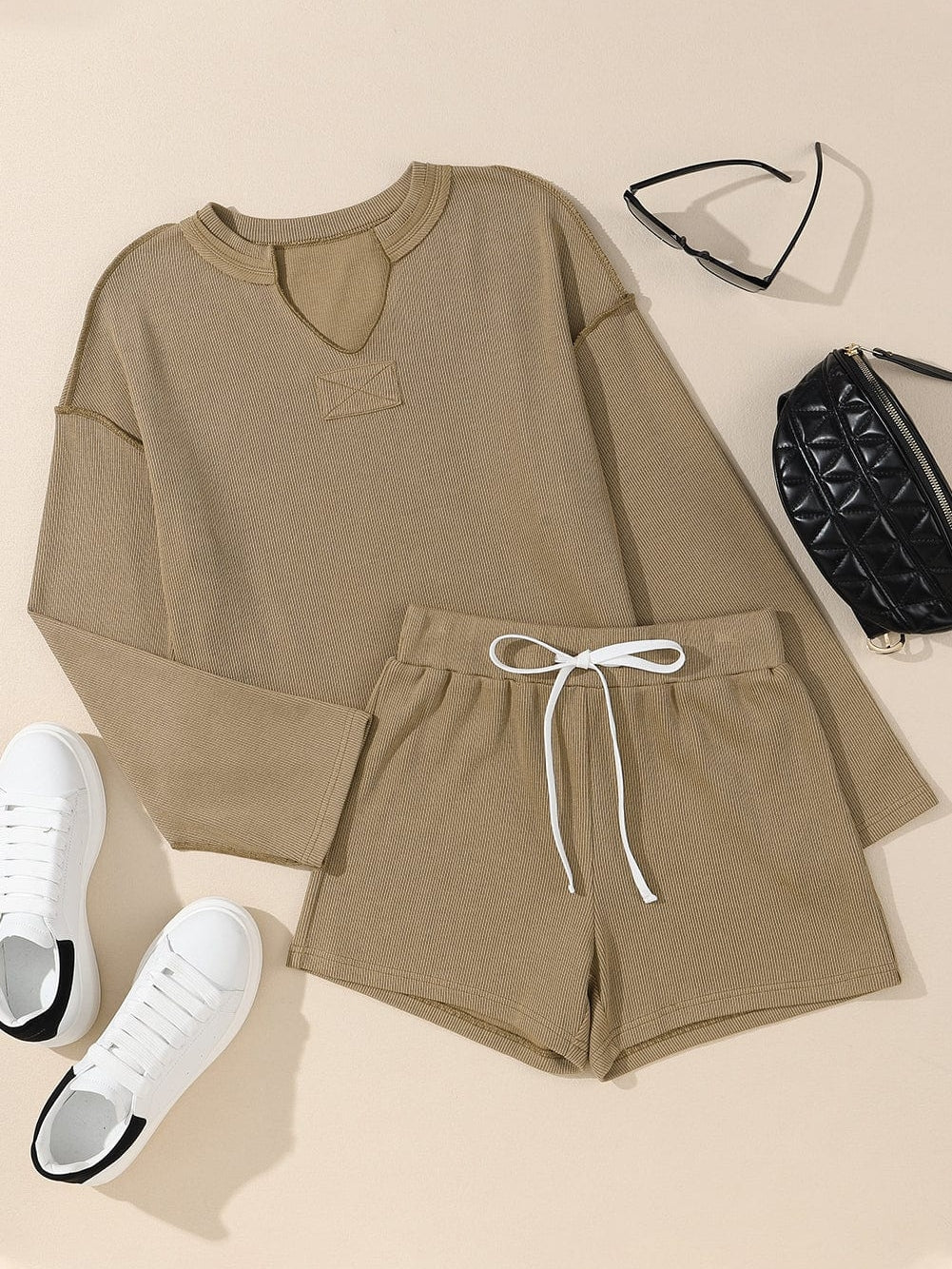 Cozy Khaki Sweater Set with Drawstring Shorts