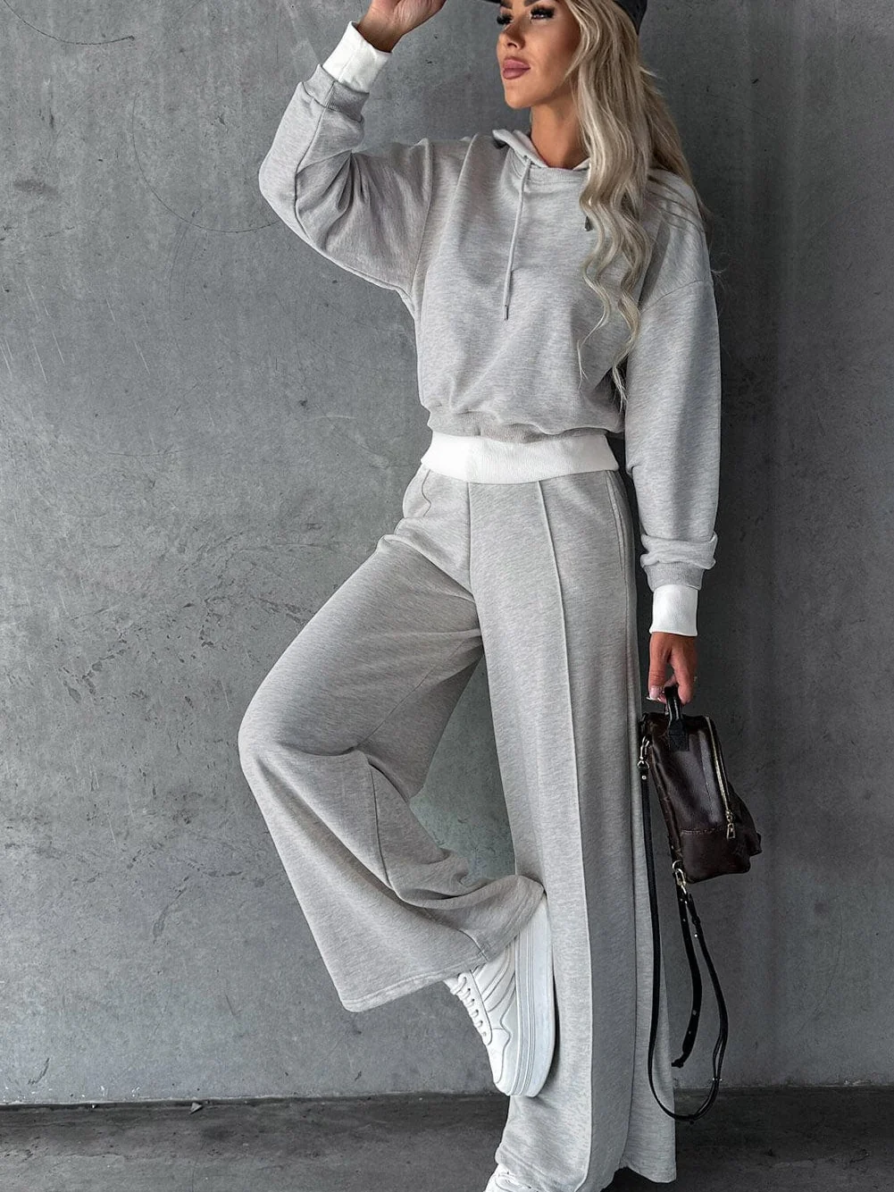 Beige Cropped Hoodie and Wide Leg Pants Lounge Set