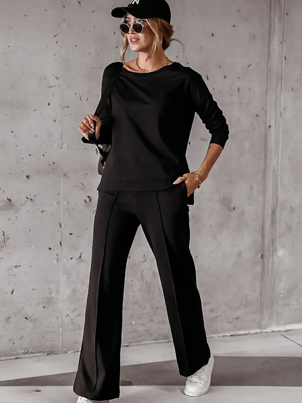 Chic Black Two-Piece Casual Ensemble with Seam Detail Pants