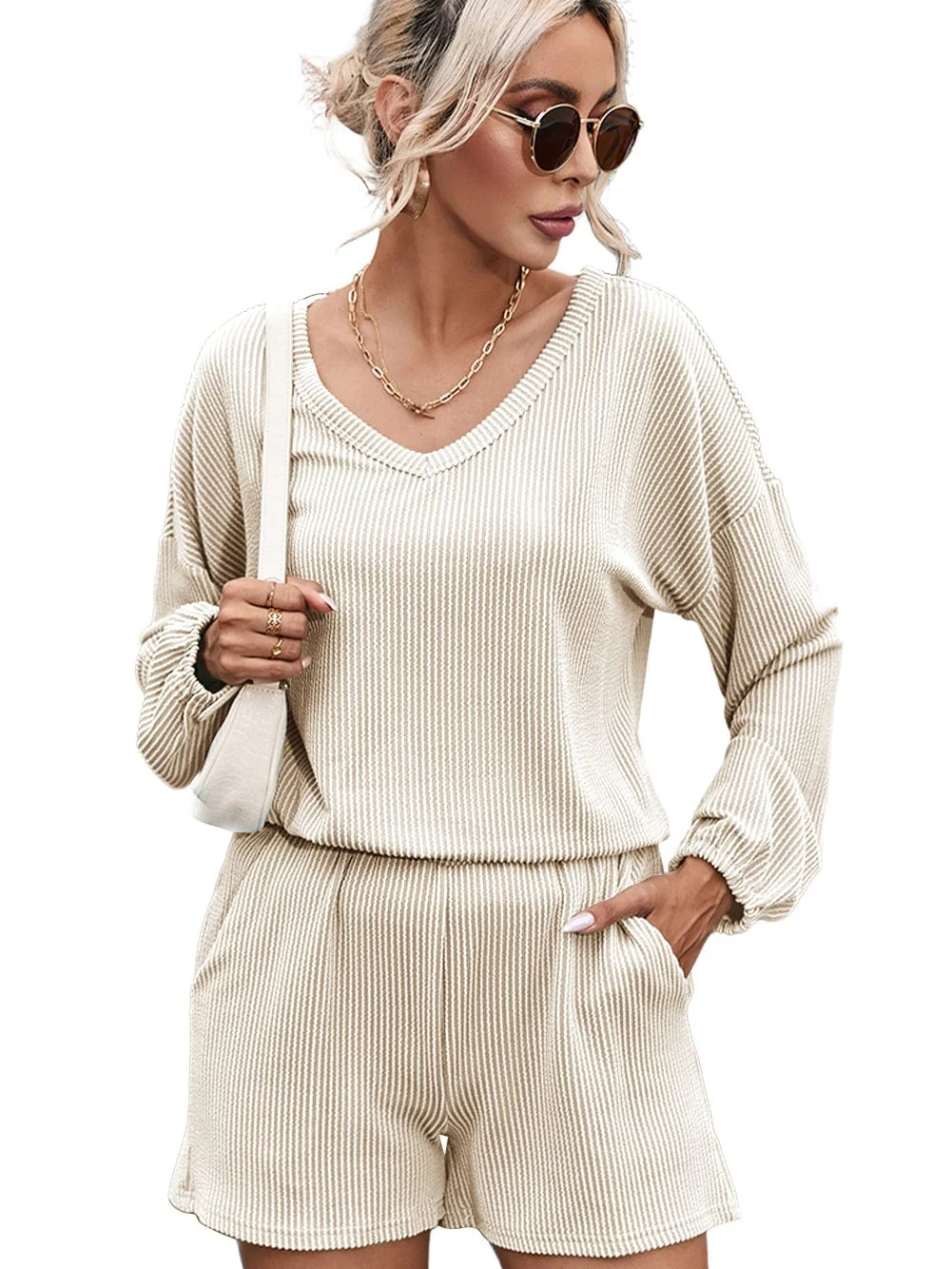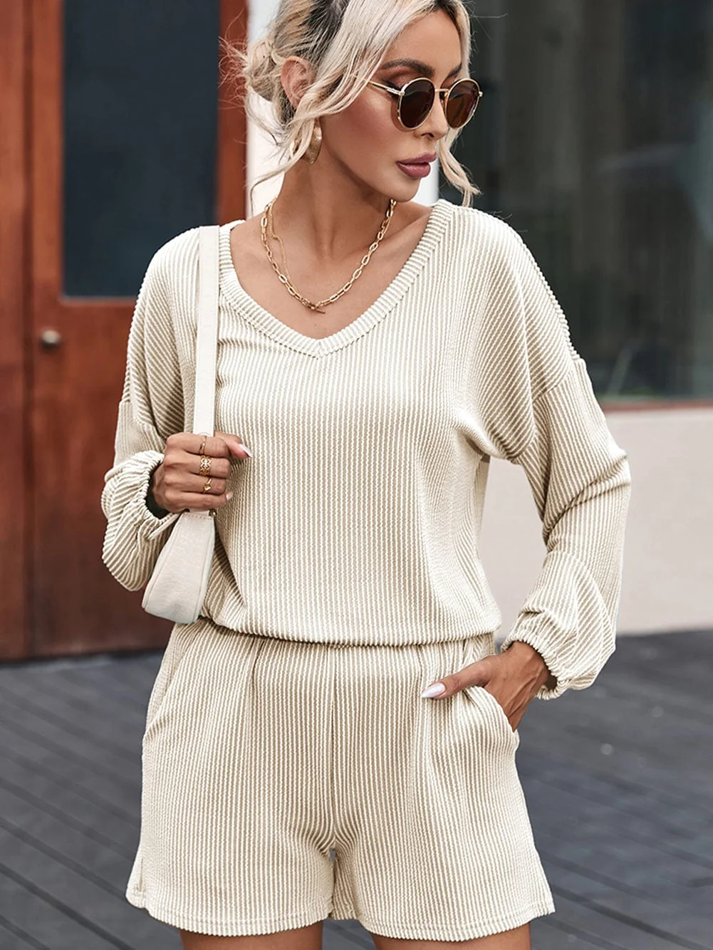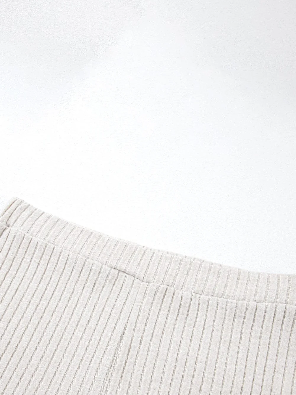 Beige Ribbed Slouchy Top and Shorts Set with Pockets