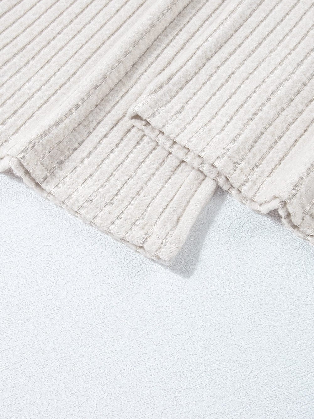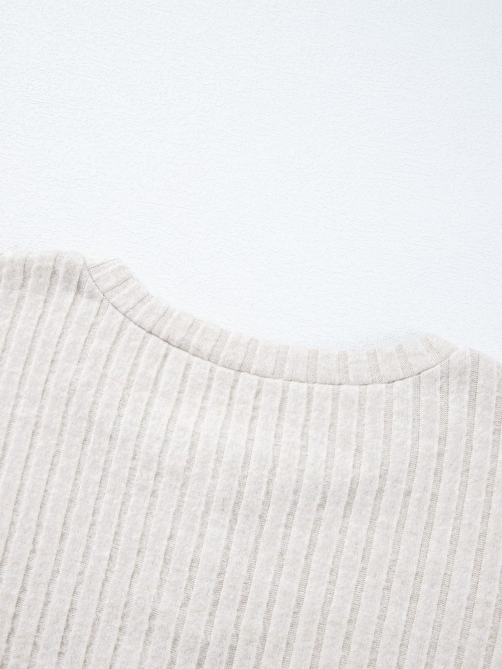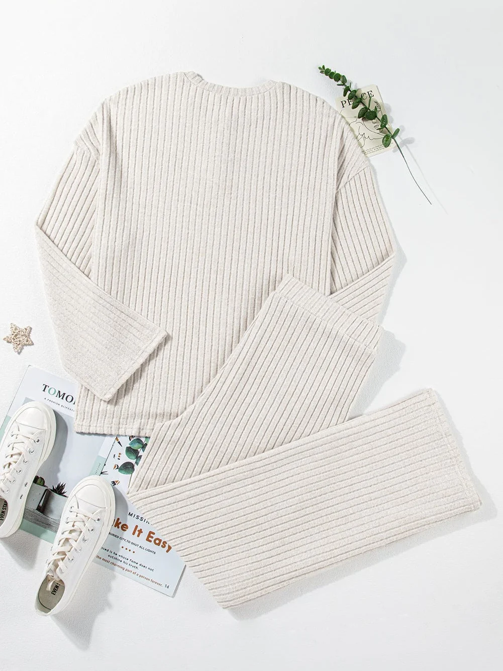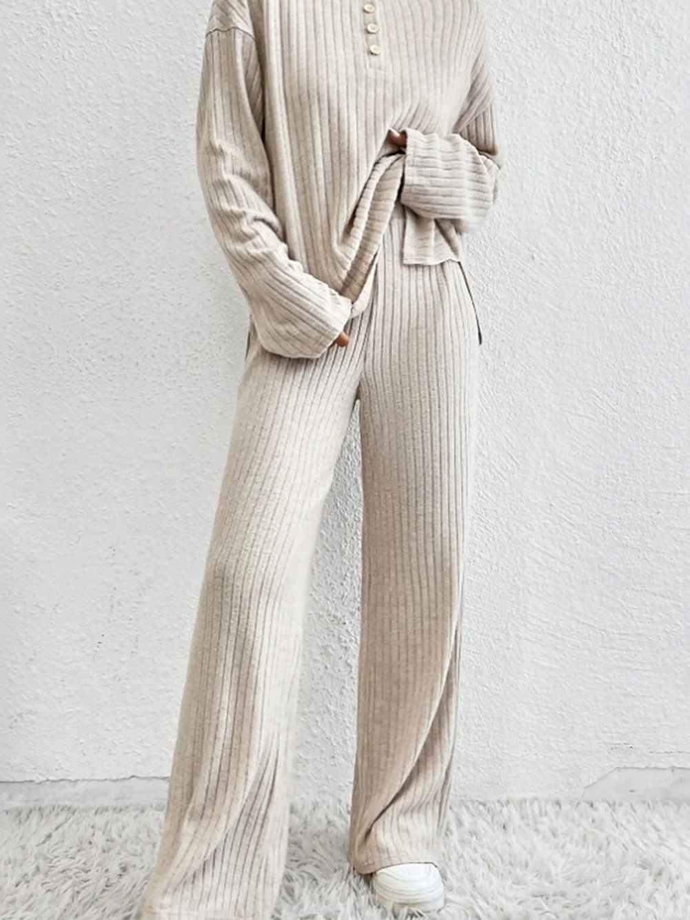 Cozy Beige Ribbed Knit Henley Top and Wide Leg Pants Ensemble