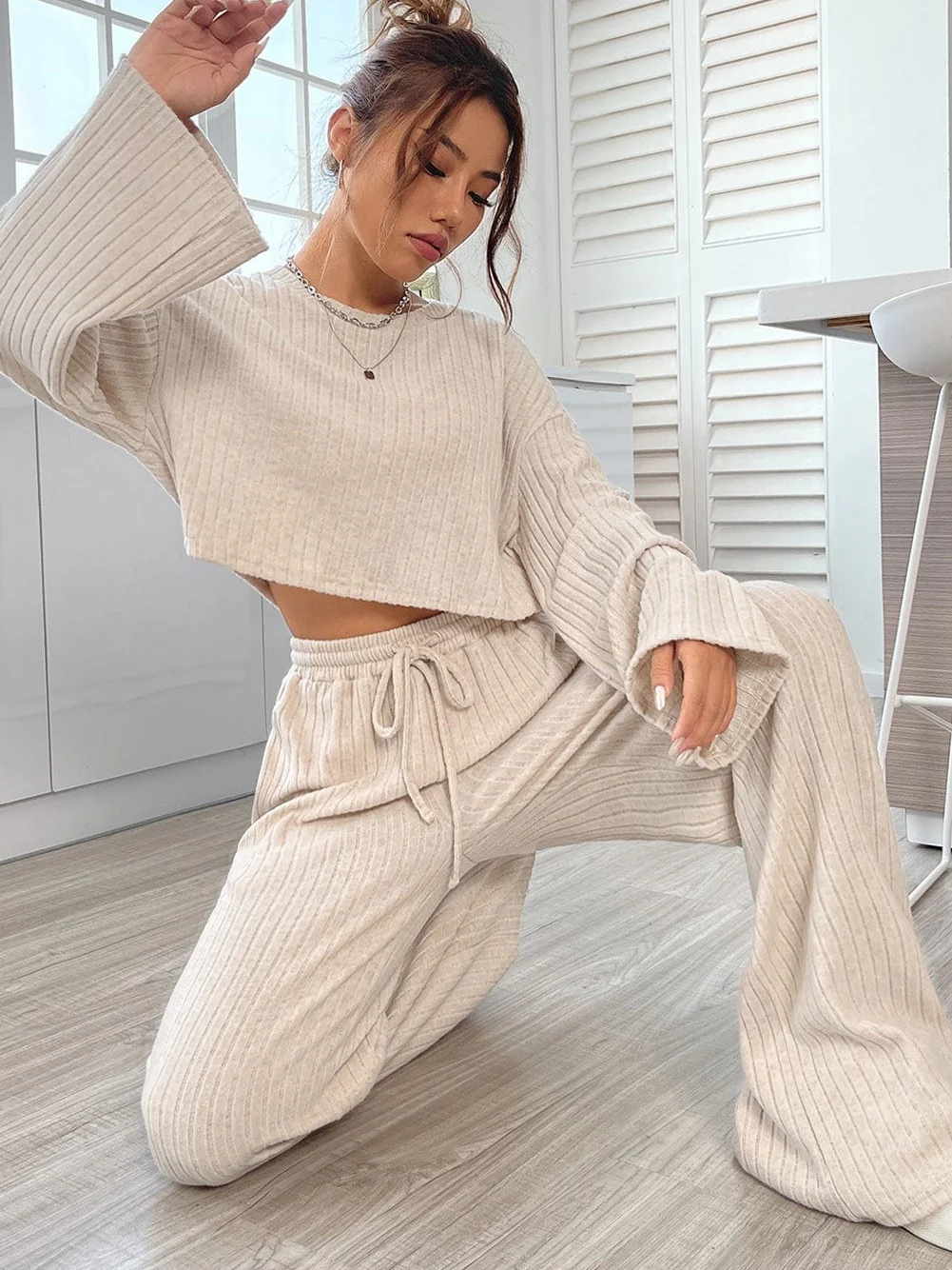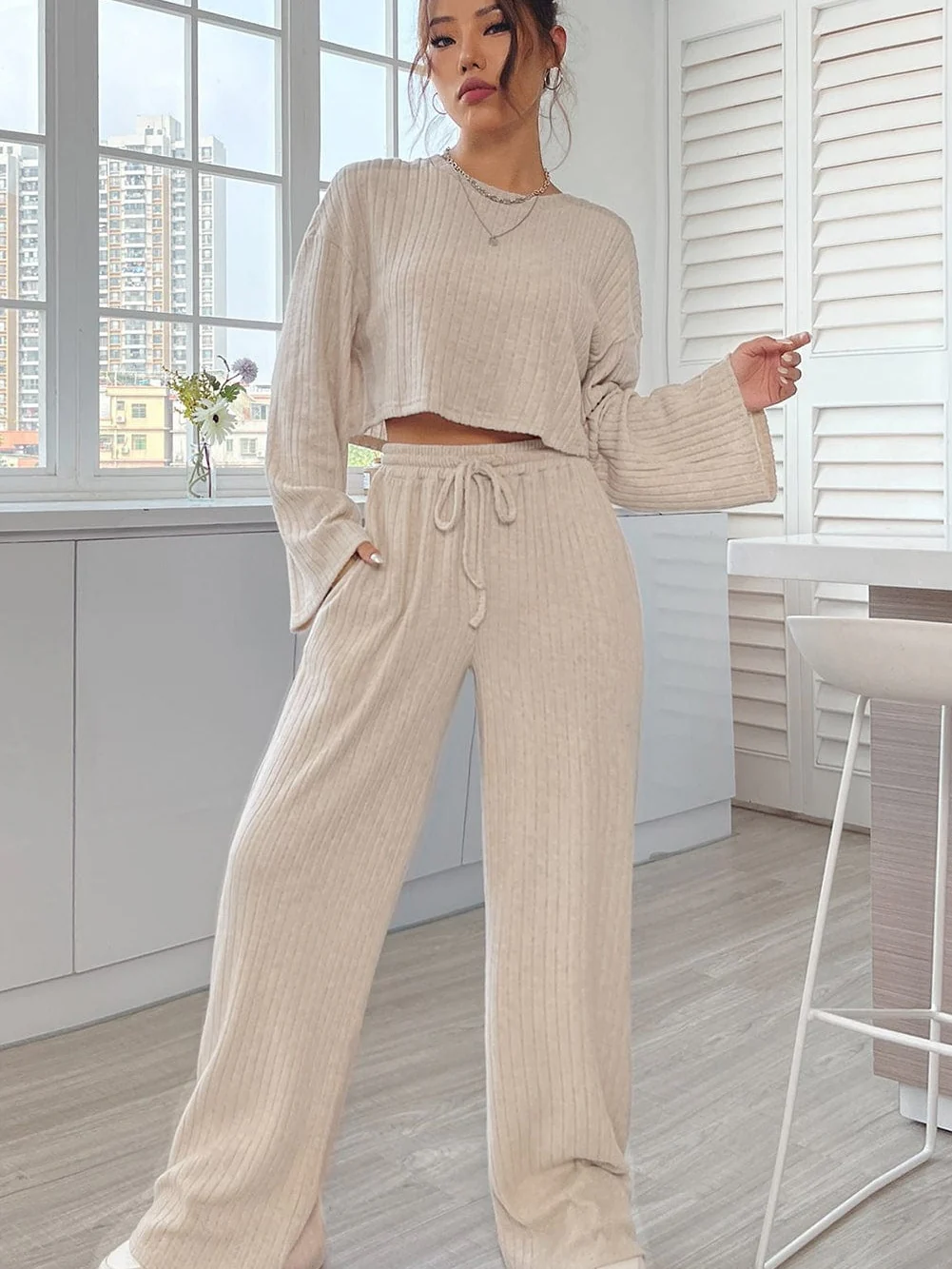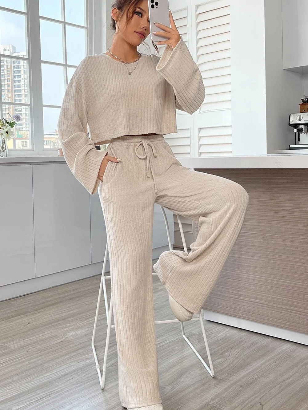 Cozy Beige Ribbed Knit Henley Top and Wide Leg Pants Ensemble