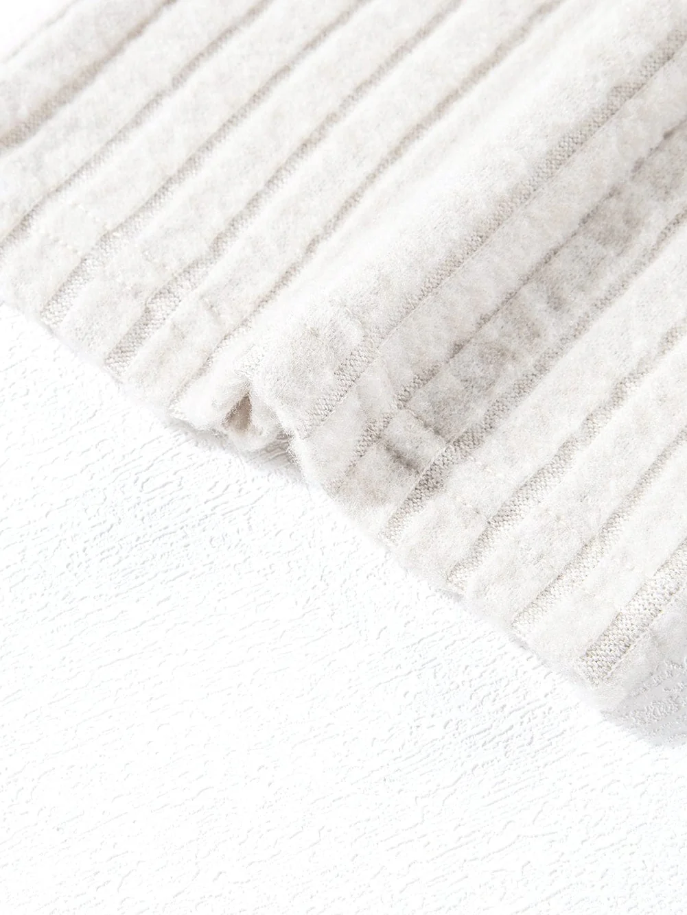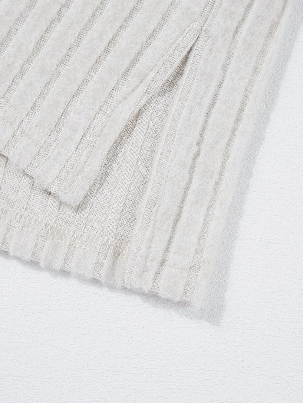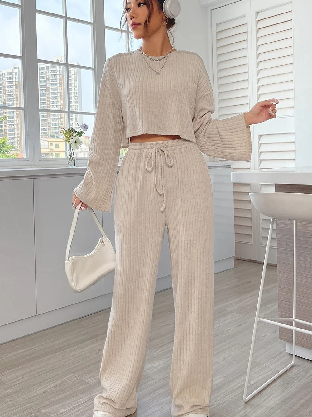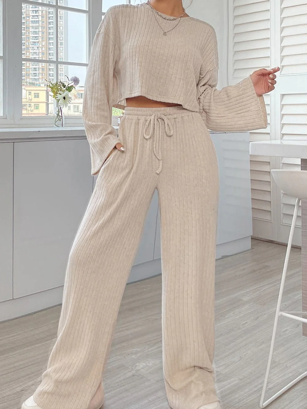 Cozy Beige Ribbed Knit Henley Top and Wide Leg Pants Ensemble