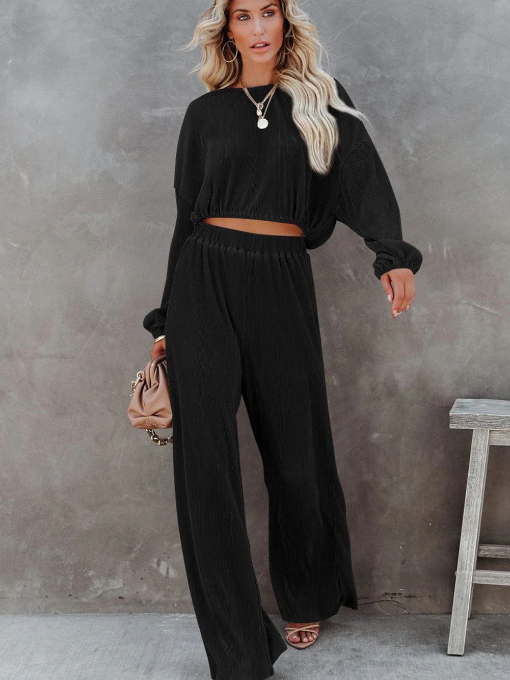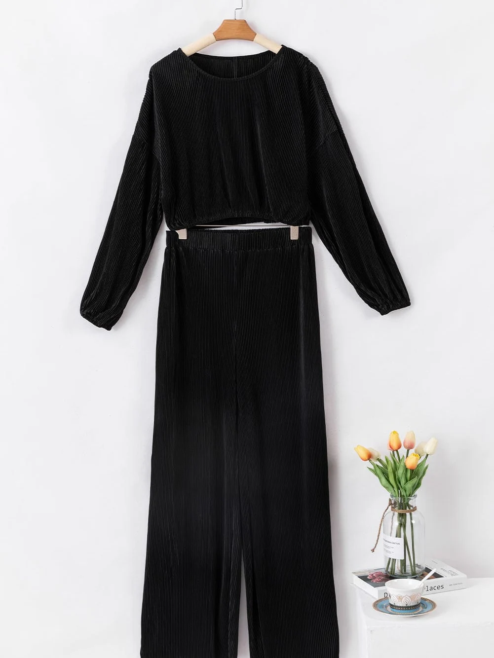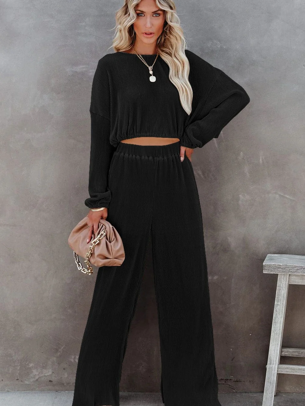 Black Ribbed Two-Piece Cropped Top and High Waist Pants Set