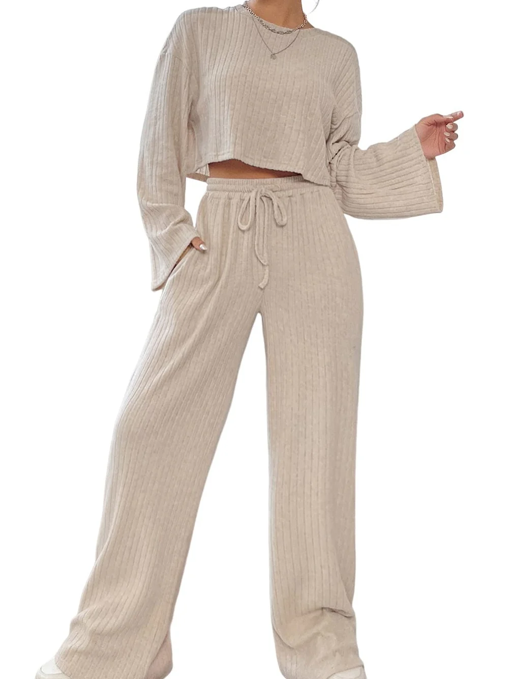 Khaki Ribbed Knit Bell Sleeve Matching Pants Lounge Set