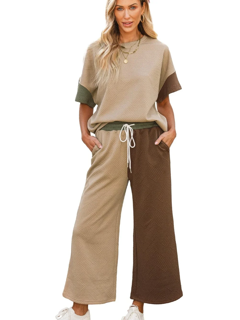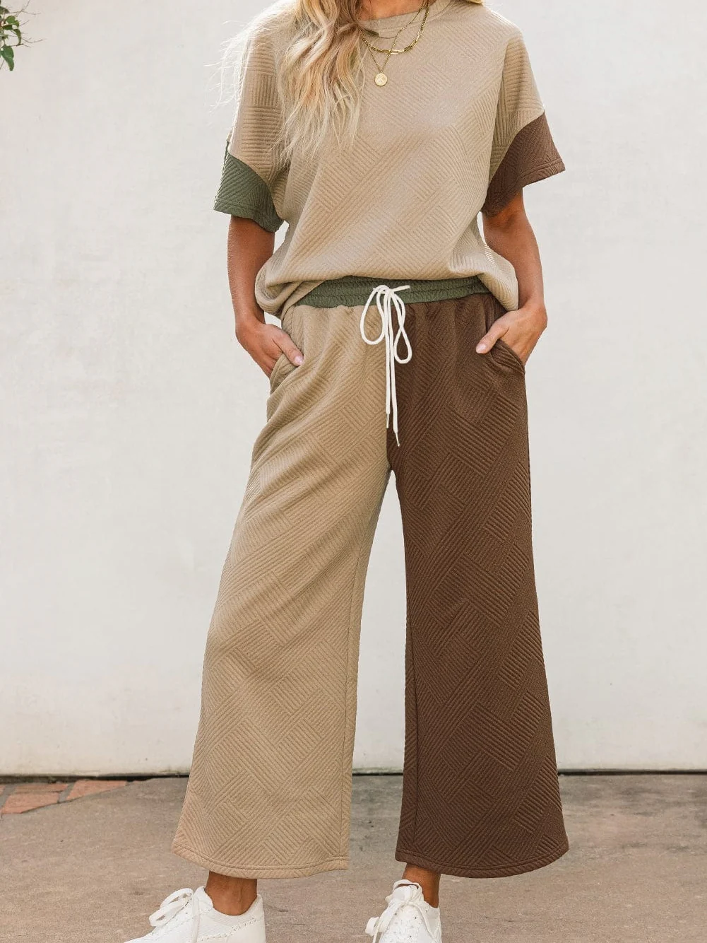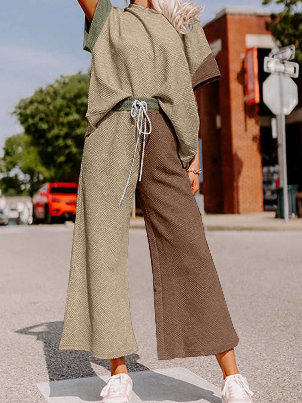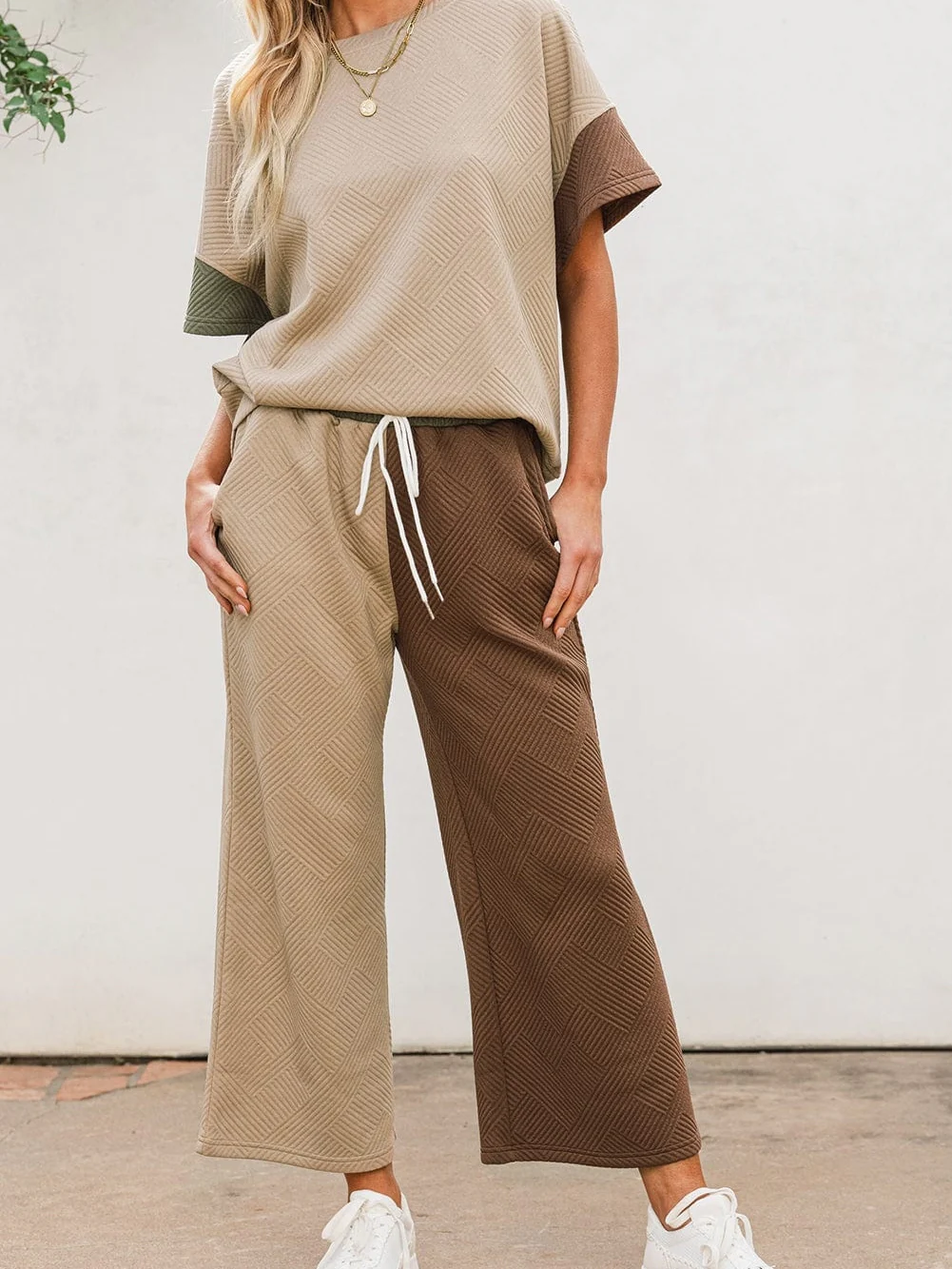 Colorblock Ribbed Textured Tee and Wide Leg Pants Set