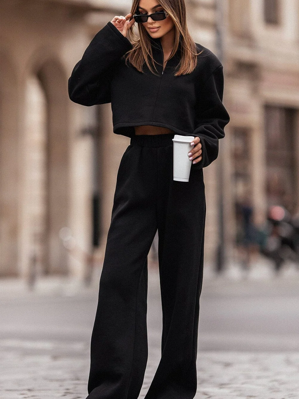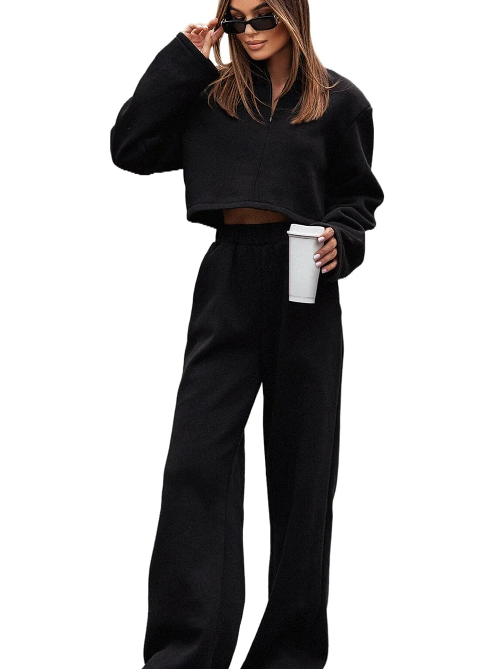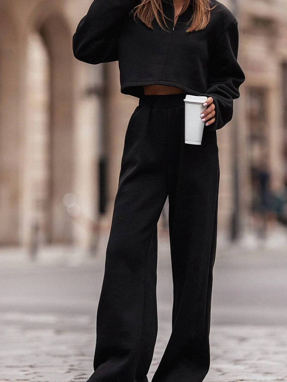 Sleek Black Zippered Collared Top and Wide Leg Pants Ensemble