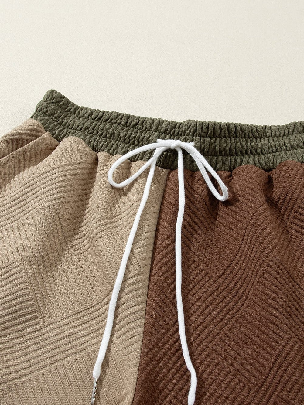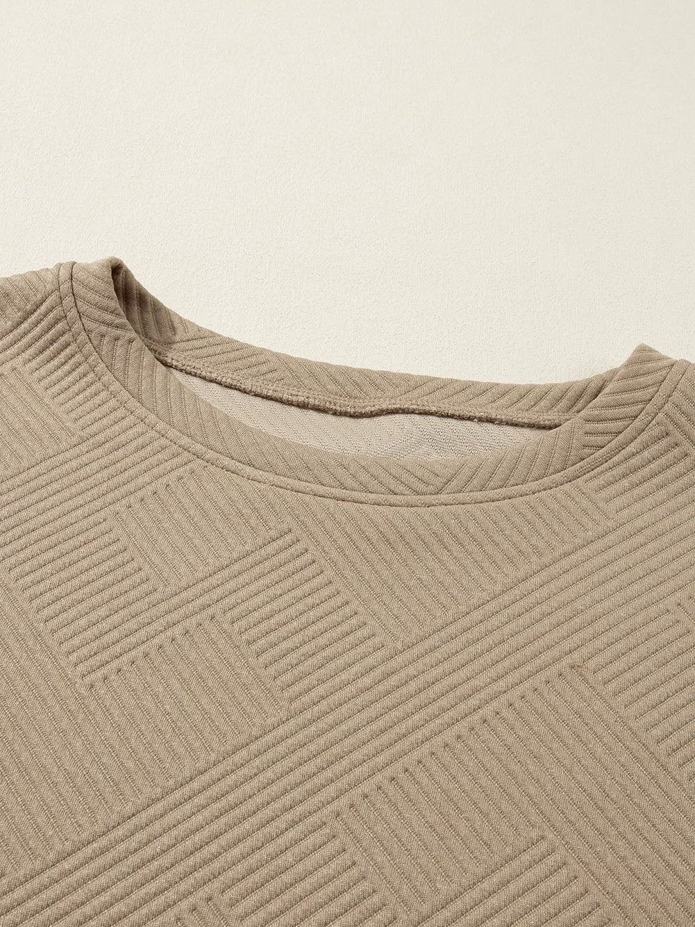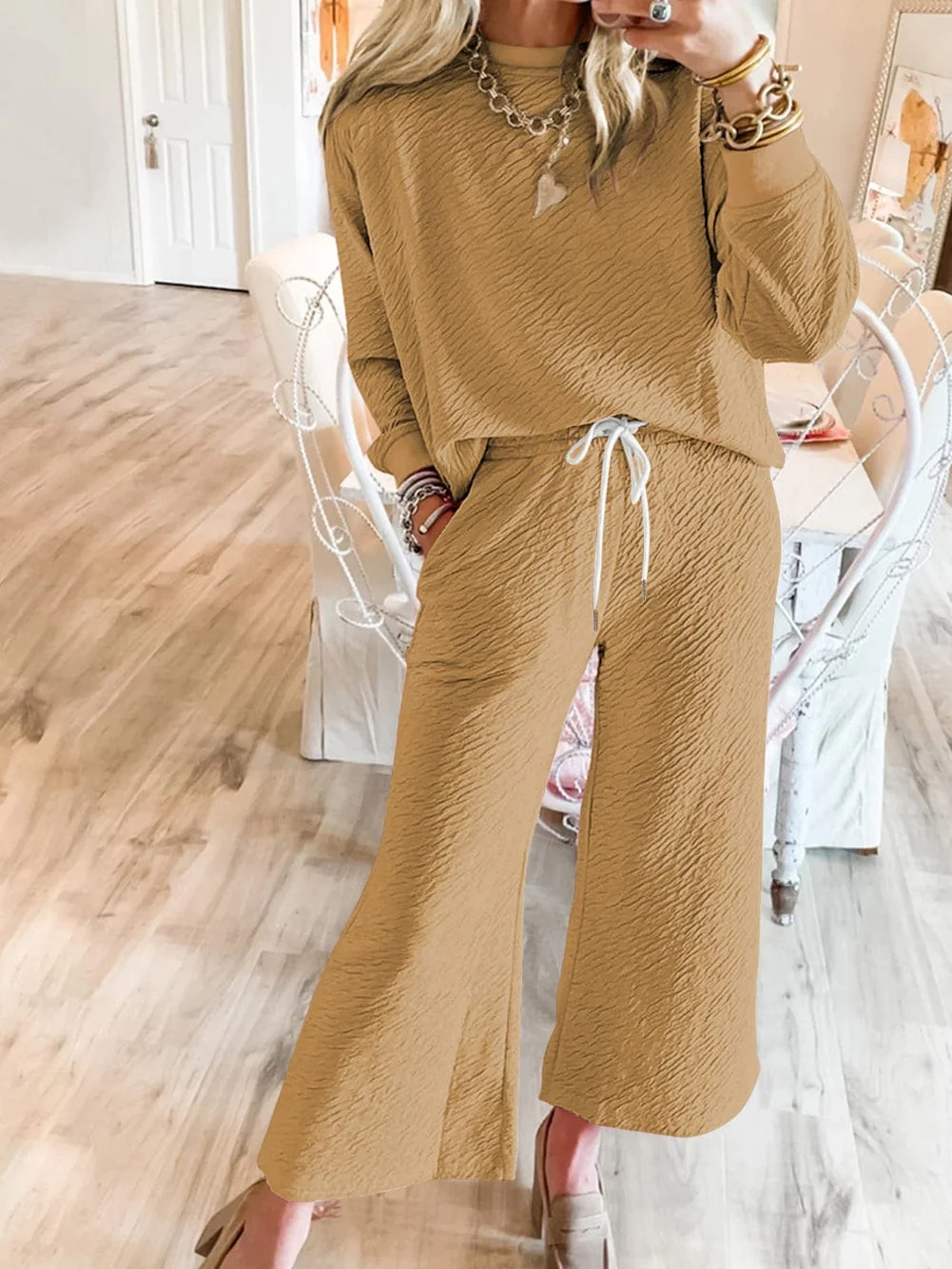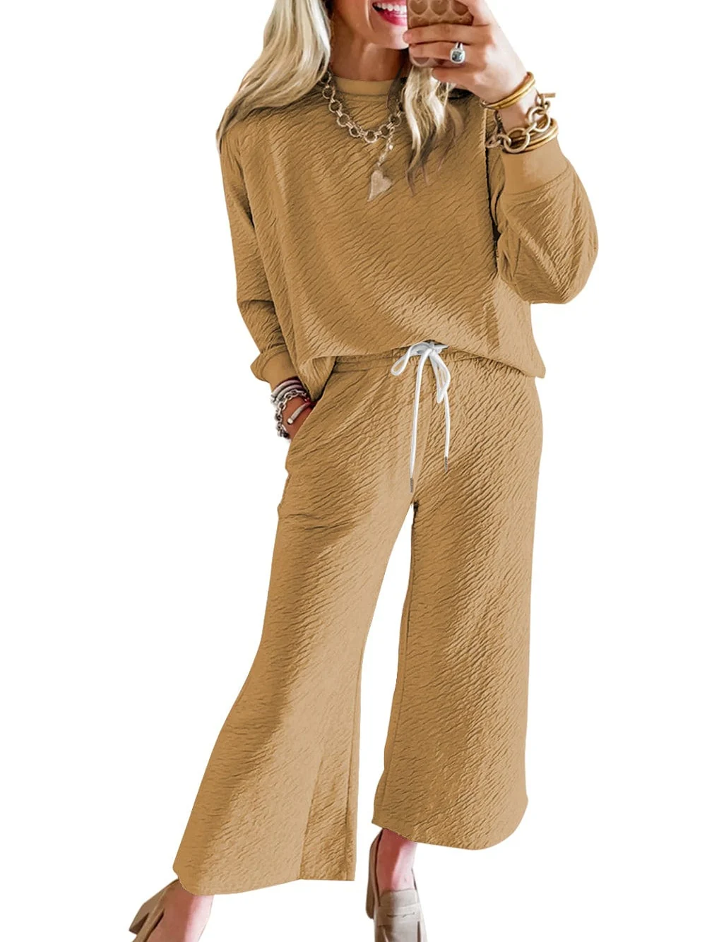 French Beige Textured Lounge Set with Long Sleeve Top and Drawstring Pants