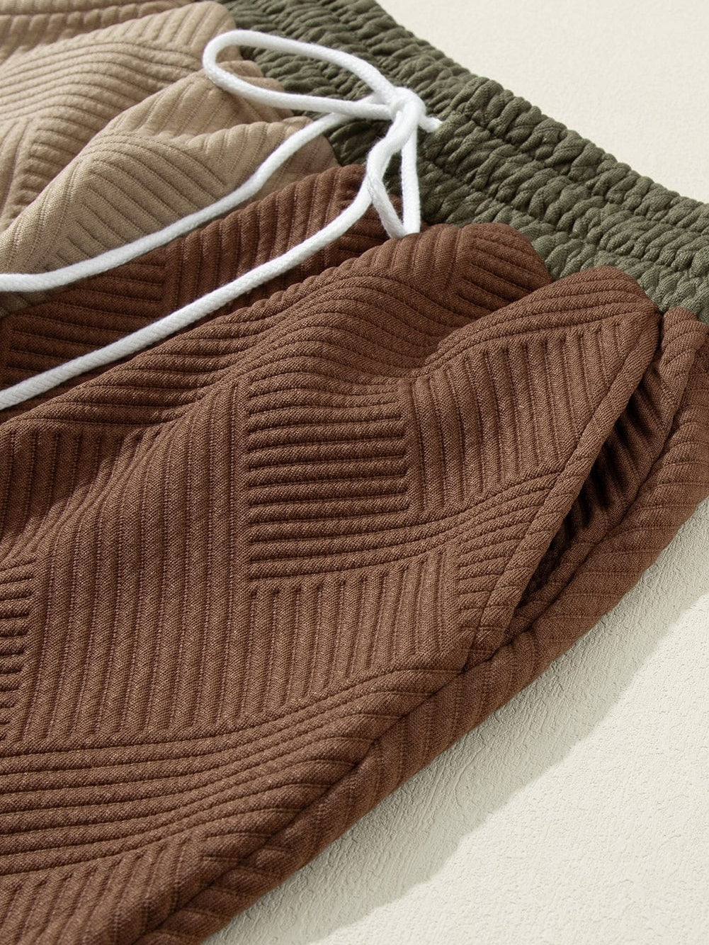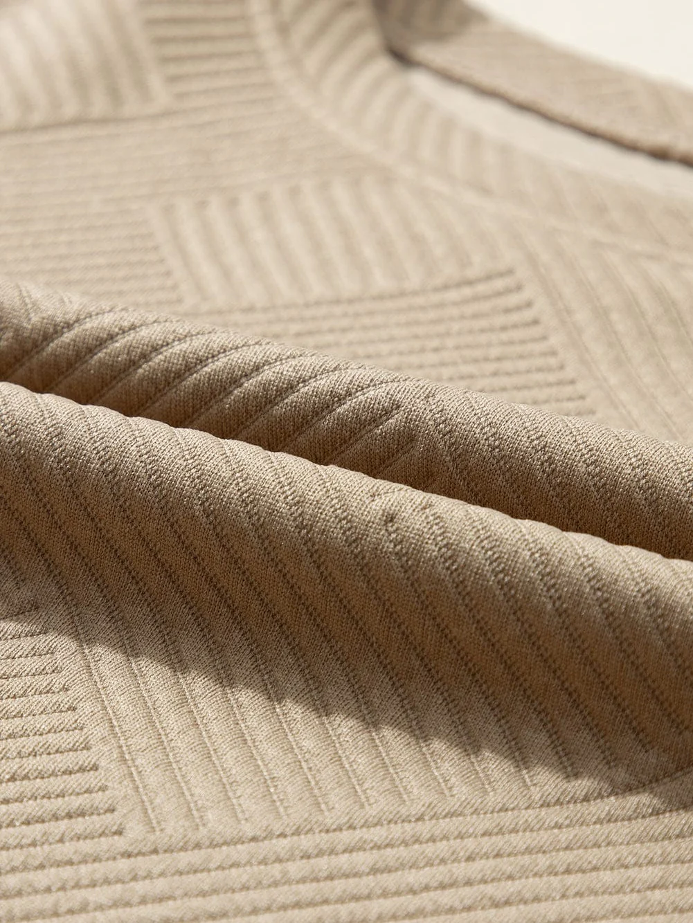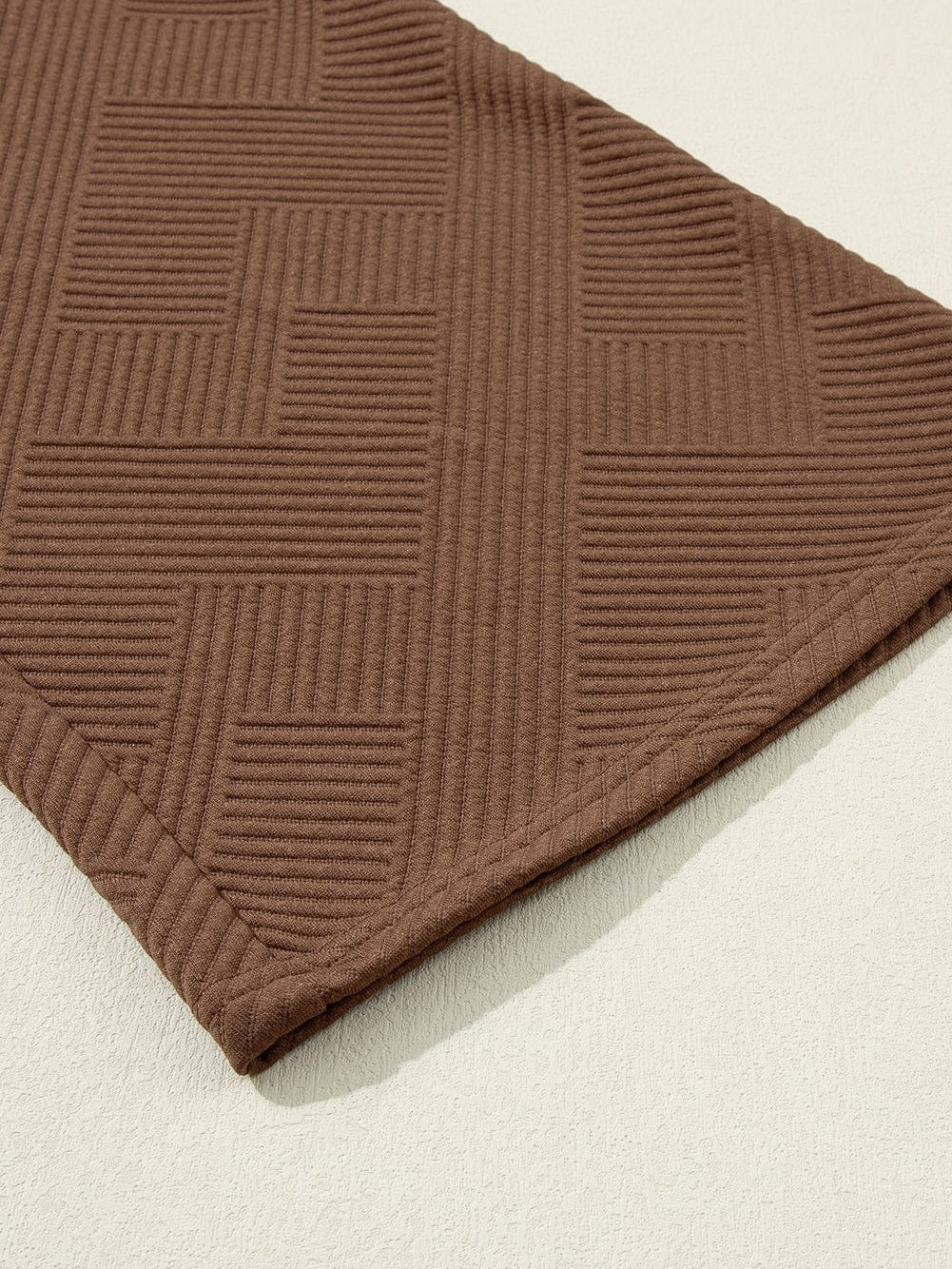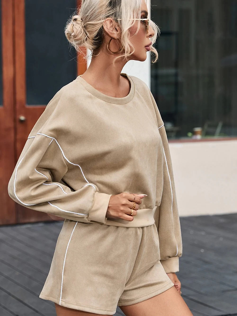 French Beige Textured Lounge Set with Long Sleeve Top and Drawstring Pants