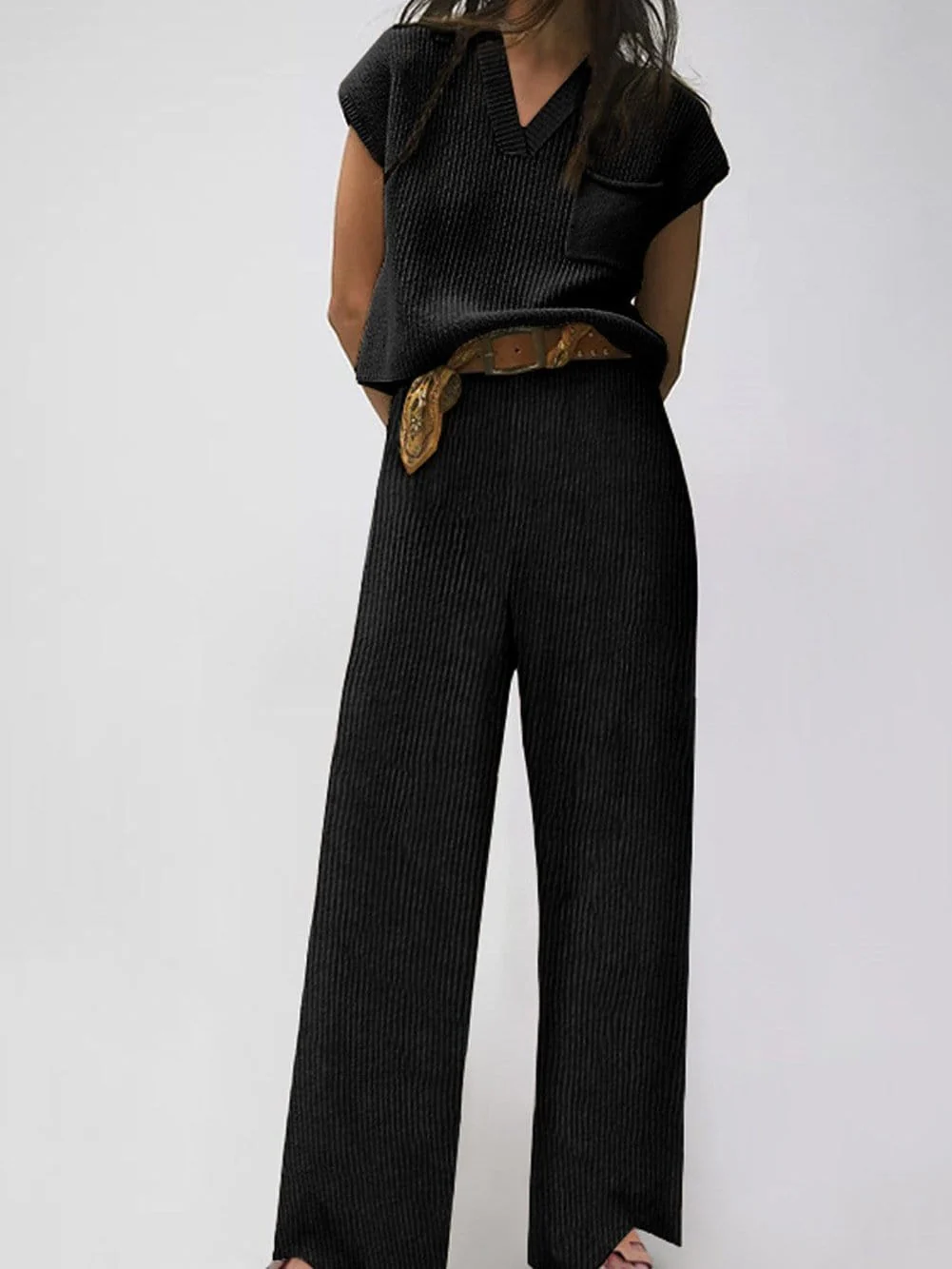 Cozy Black Knit V-Neck Sweater and Wide-Leg Pants Ensemble
