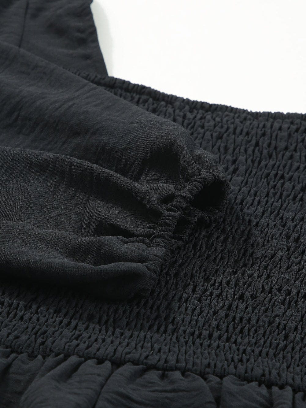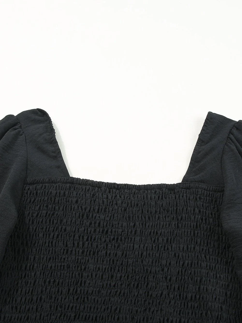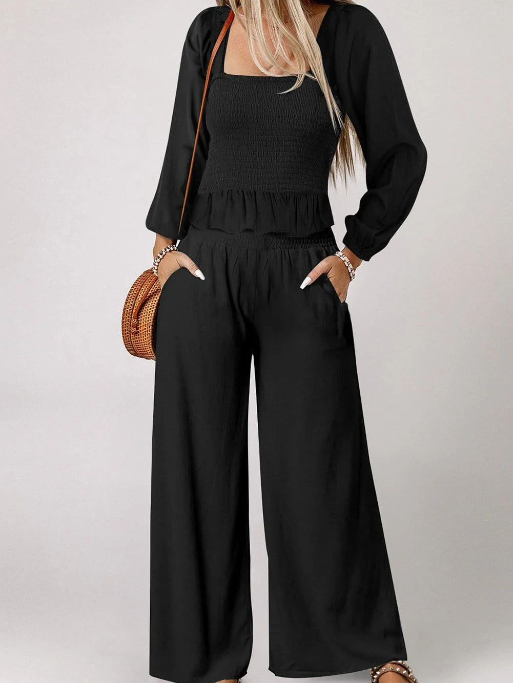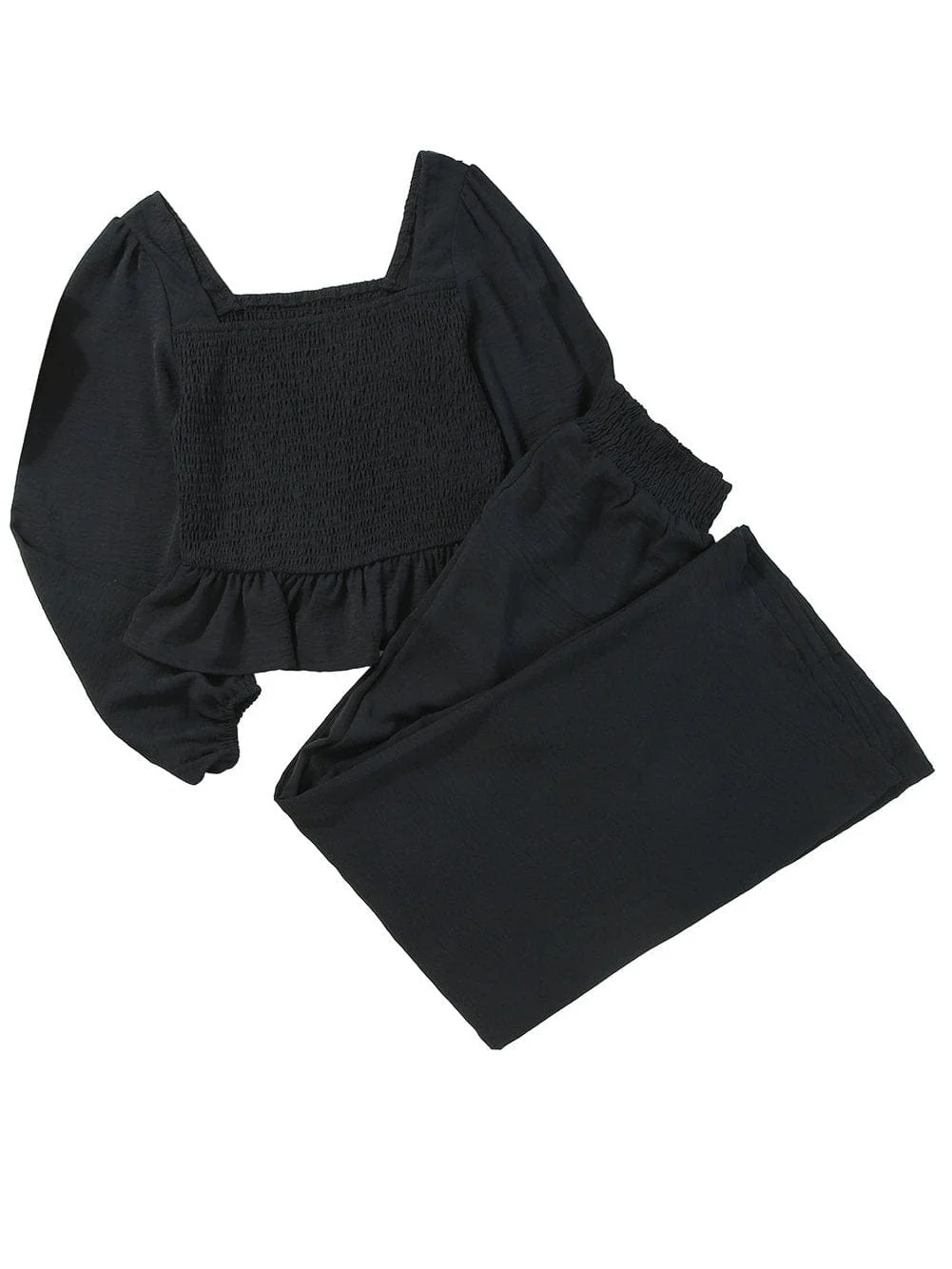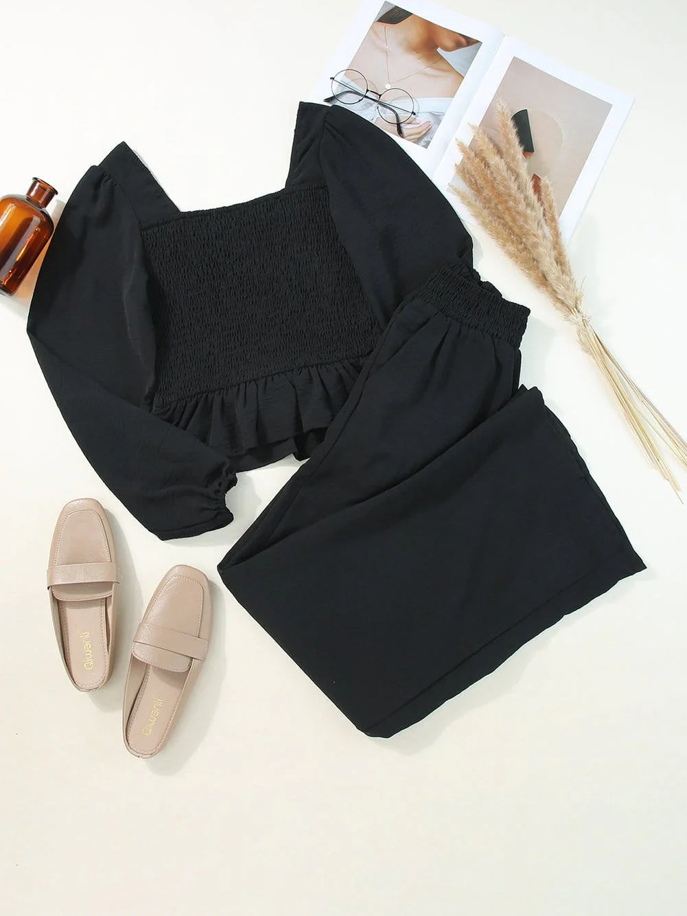 Elegant Black Square Neck Peplum Top and Wide Leg Pants Ensemble
