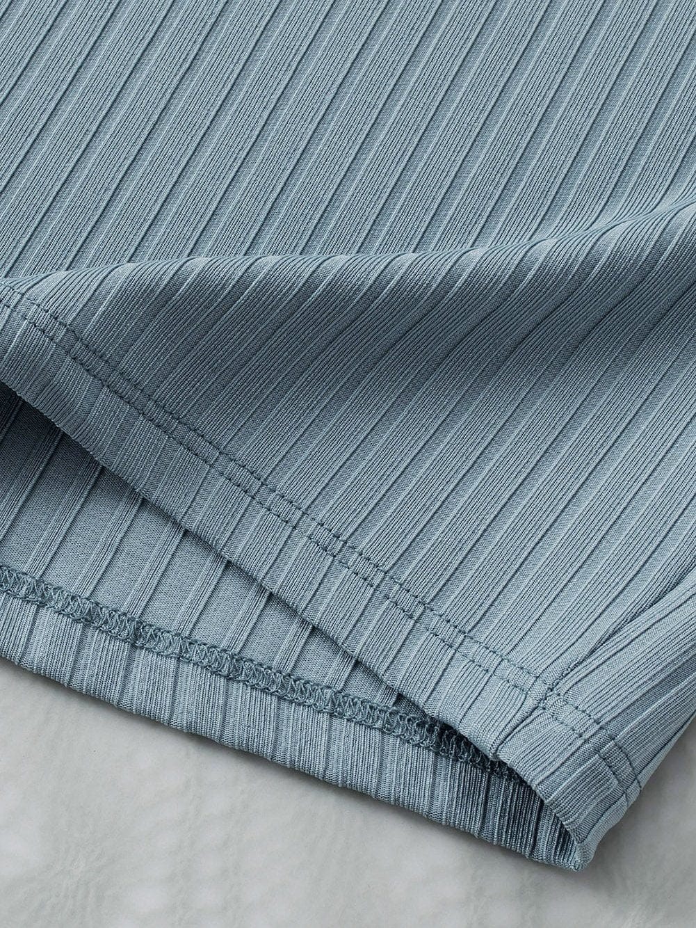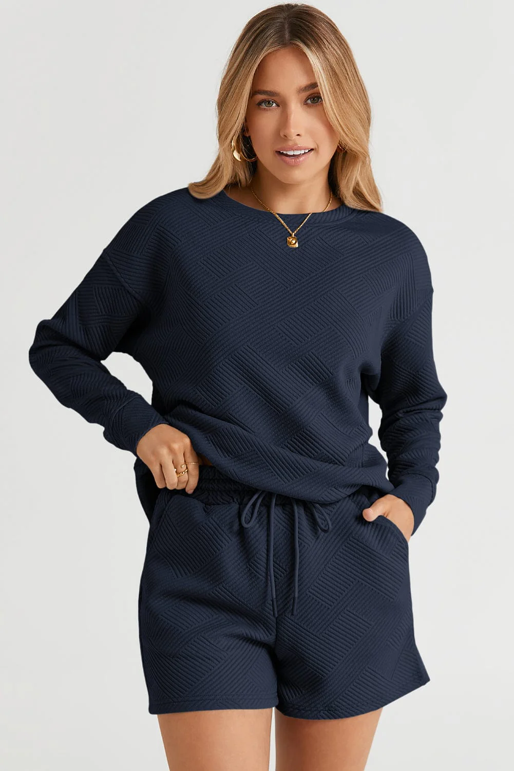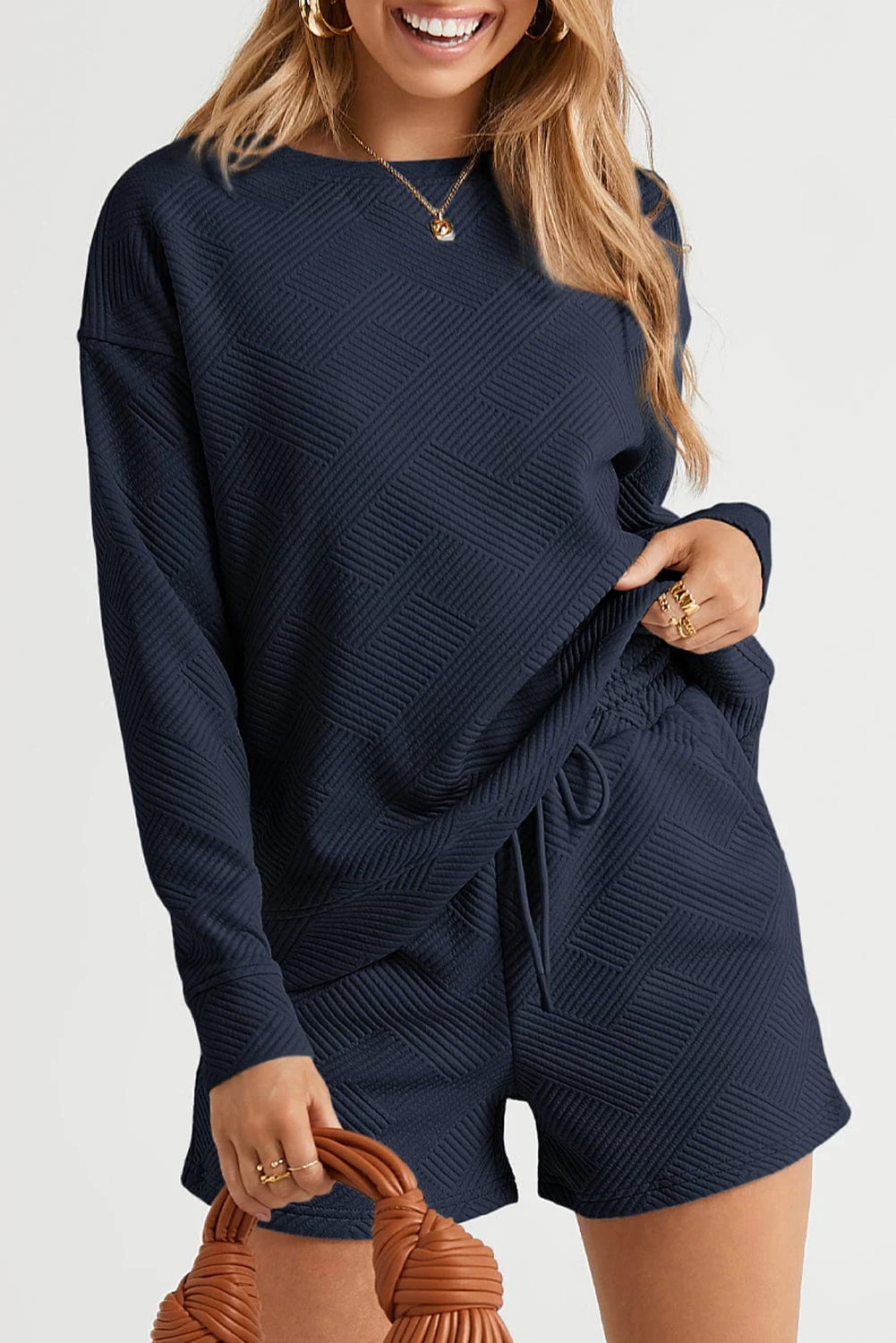 Cozy Blue Ribbed Long Sleeve Lounge Set with Drawstring Shorts