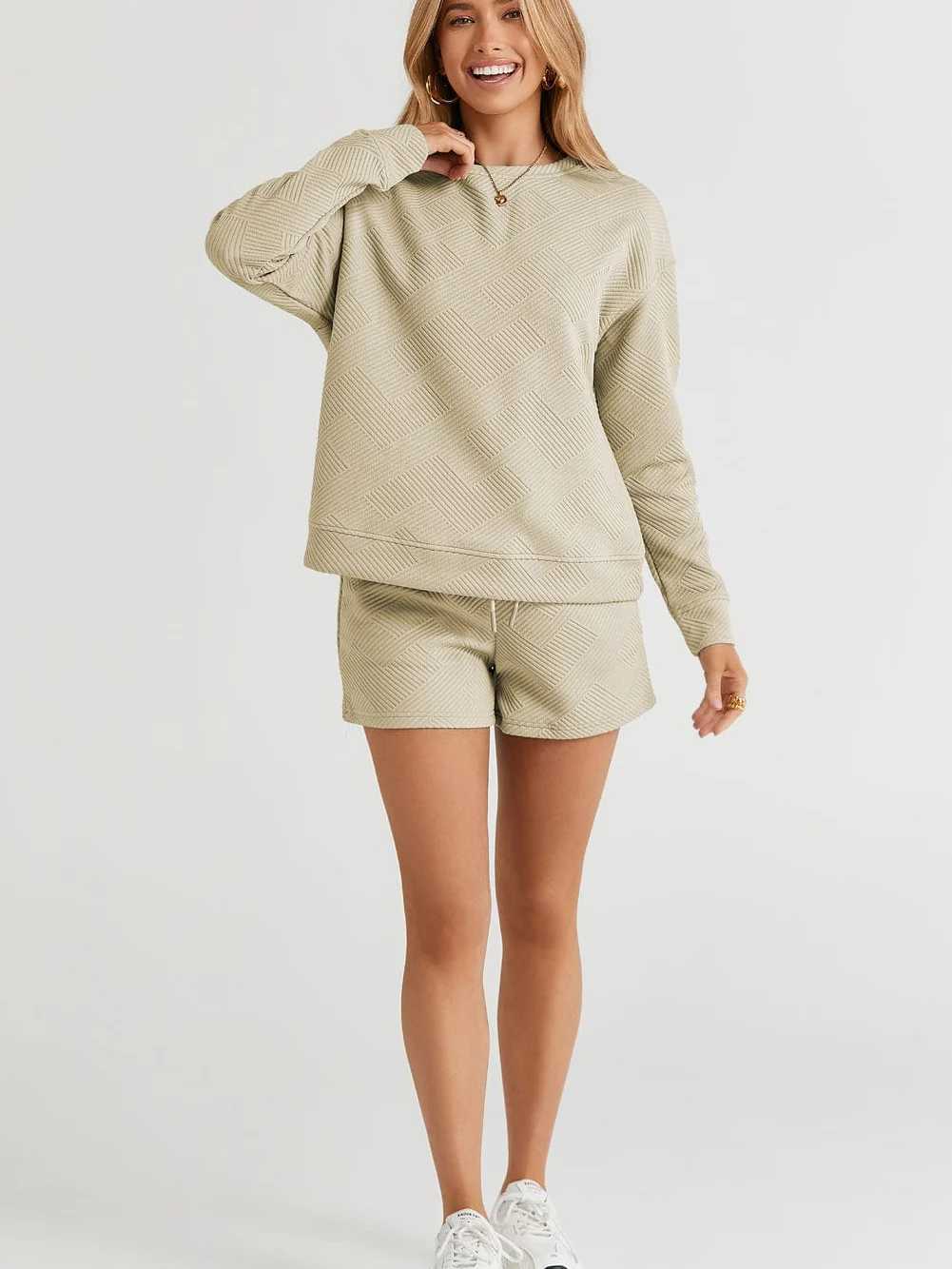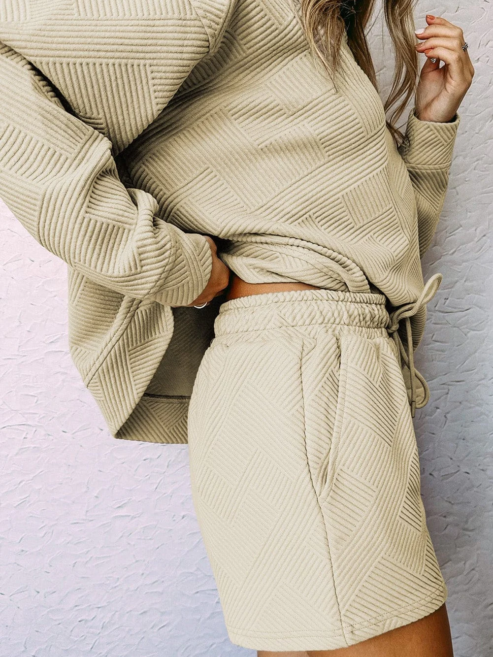 Cozy Apricot Ribbed Lounge Set with Long Sleeves and Drawstring Shorts