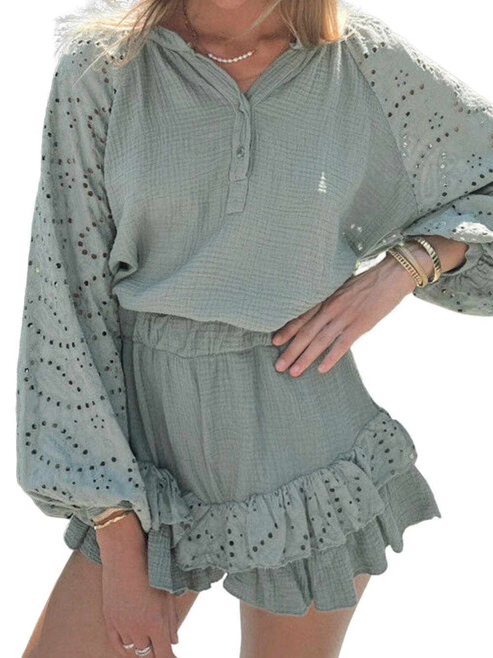 Green Eyelet Embroidered Ruffle Sleeve Top and Shorts Set
