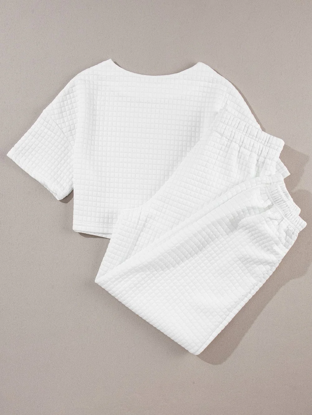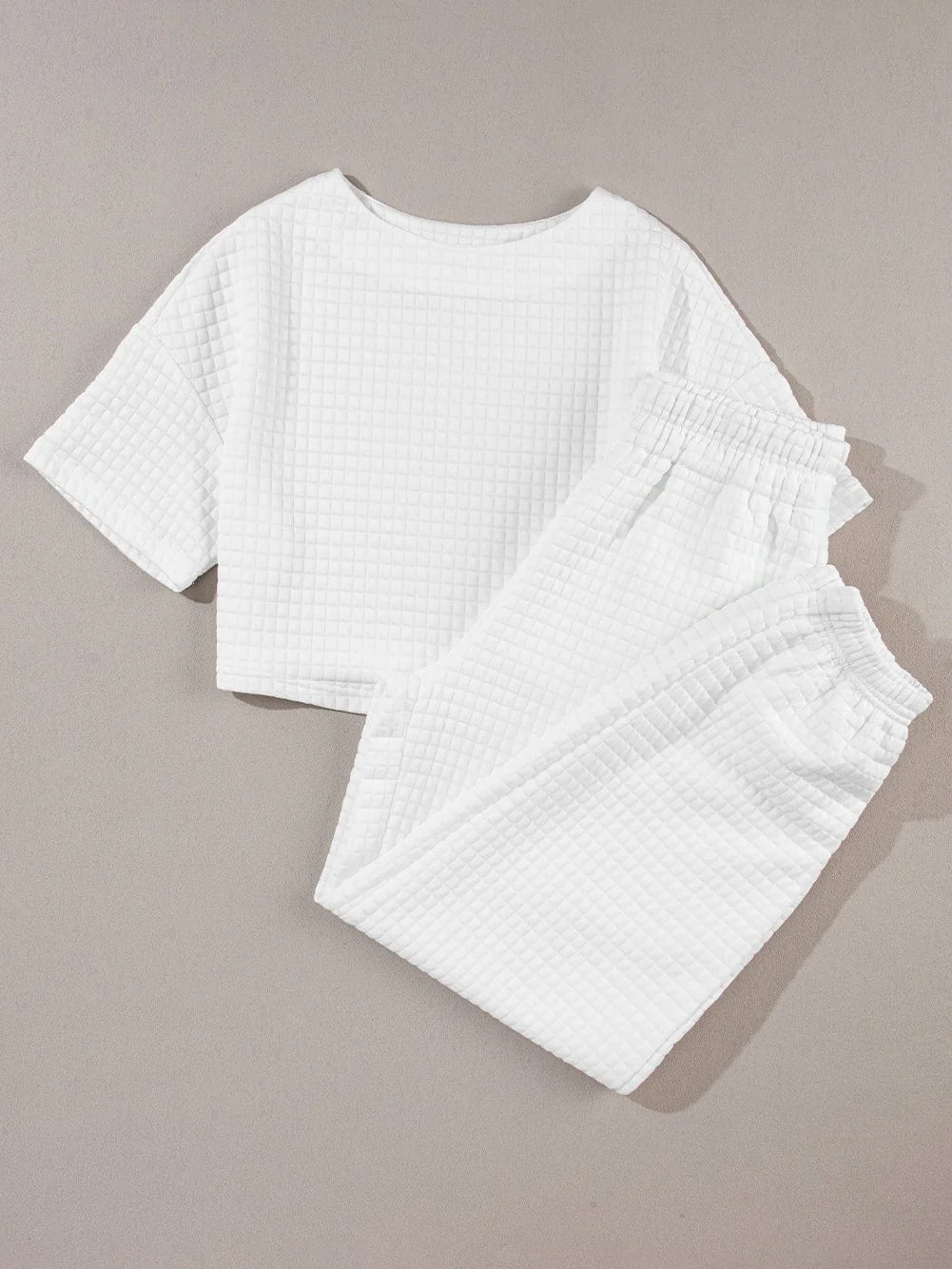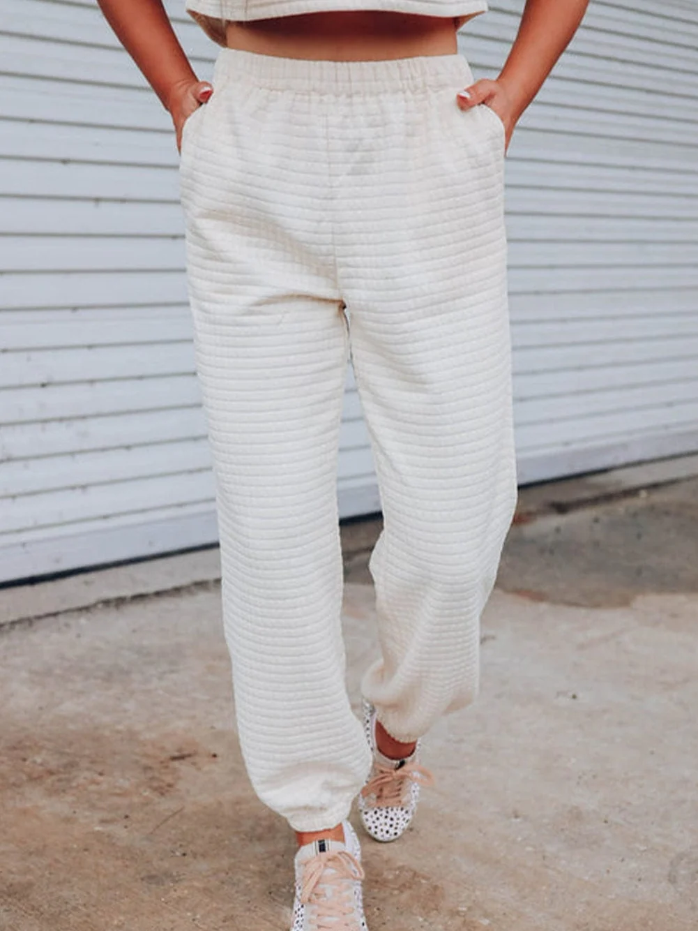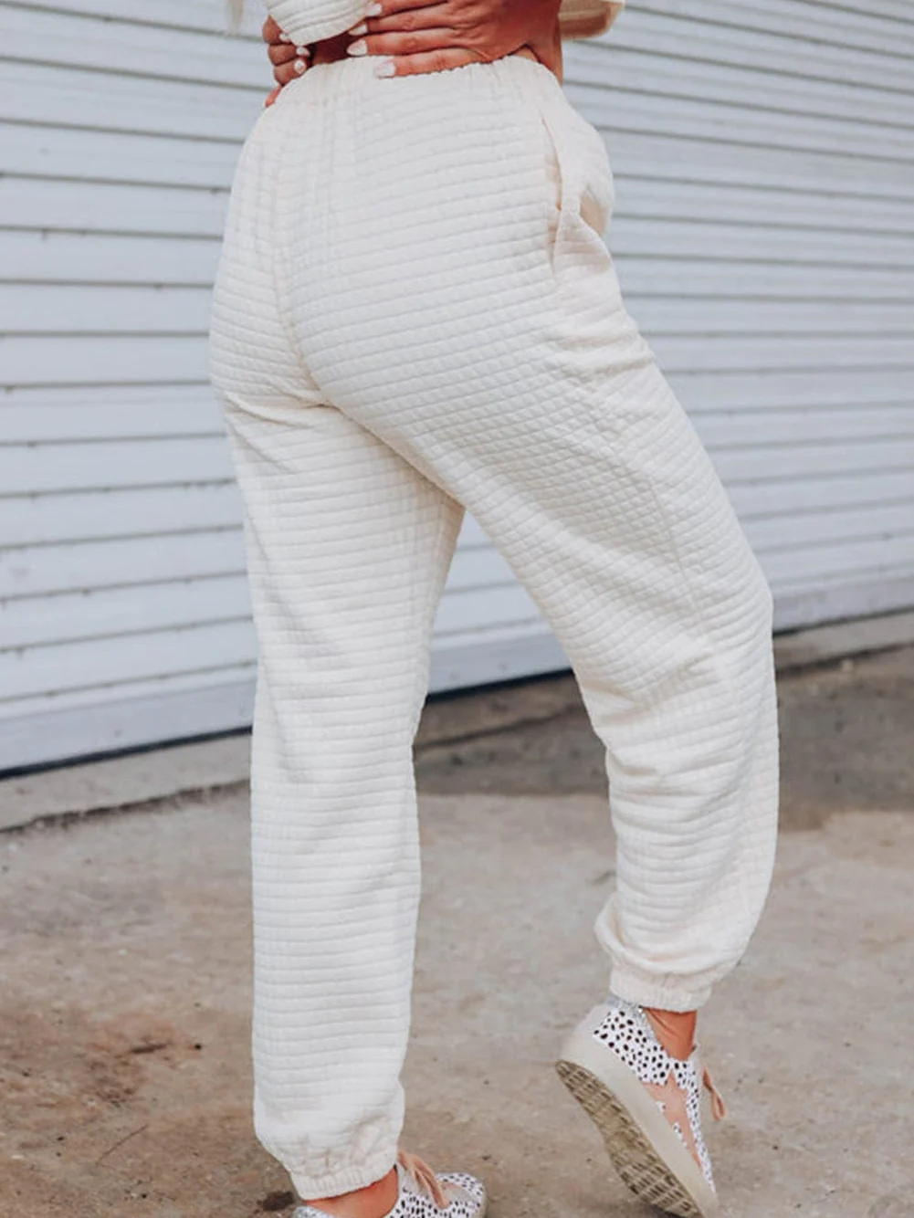 Chic White Textured Lattice Crop Top and Jogger Pants Ensemble
