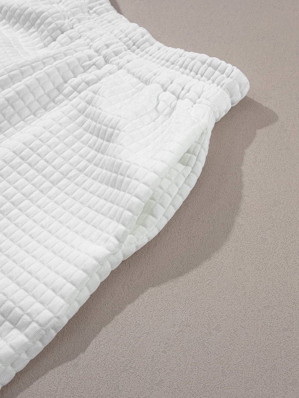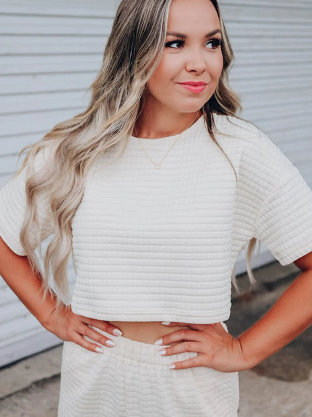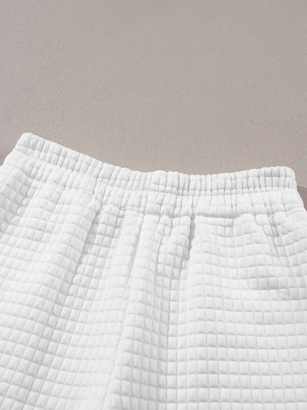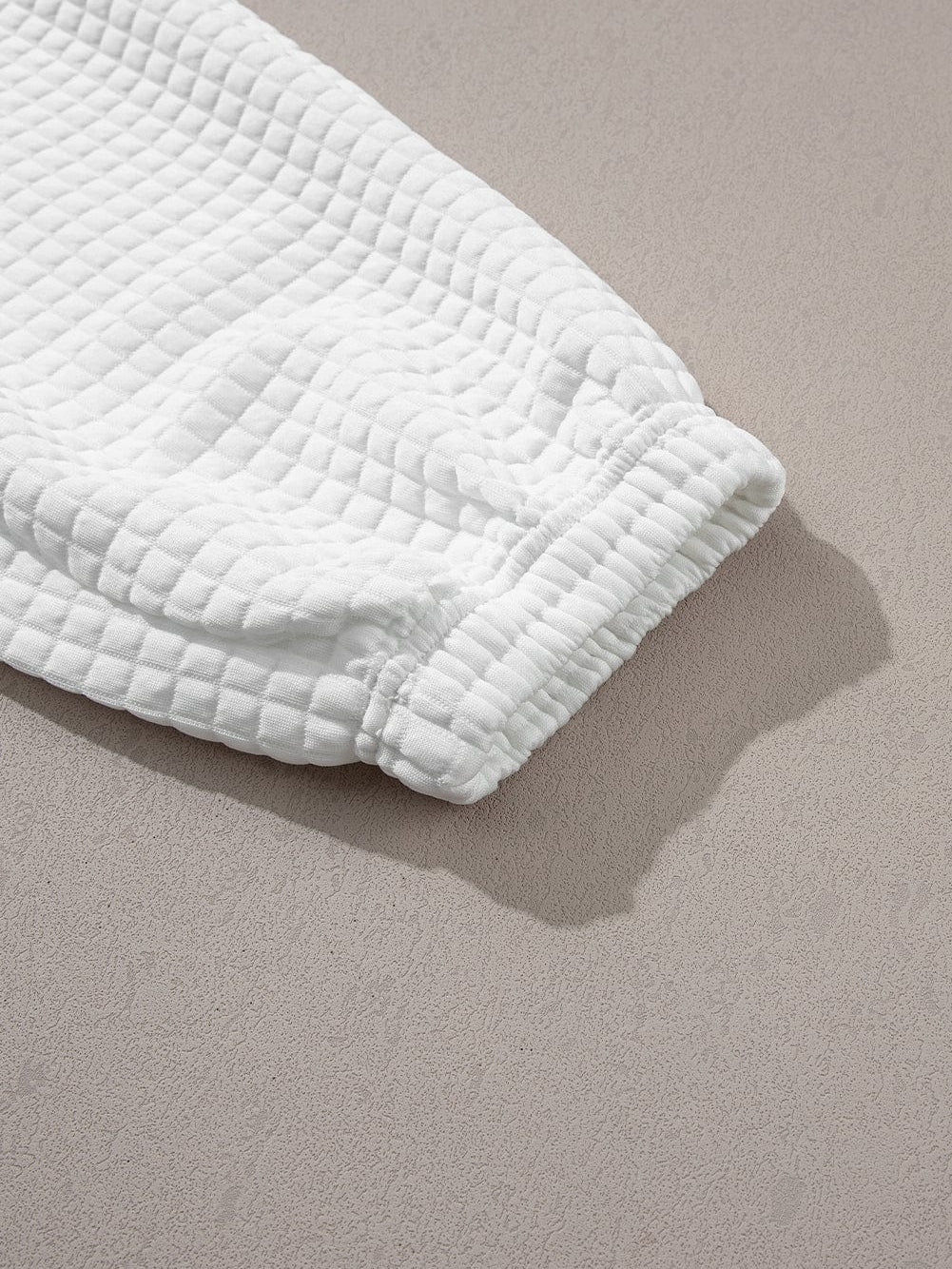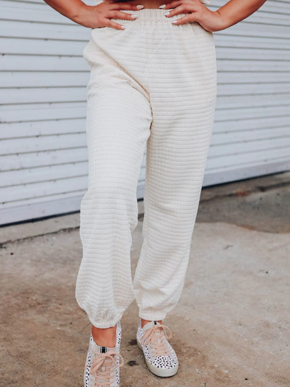 Chic White Textured Lattice Crop Top and Jogger Pants Ensemble