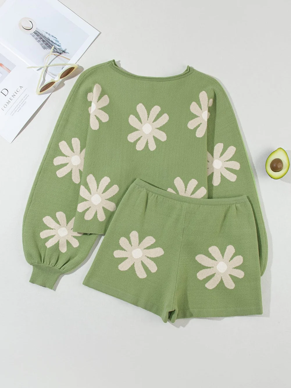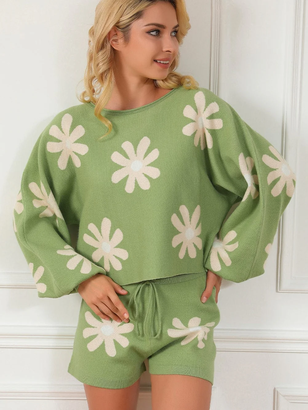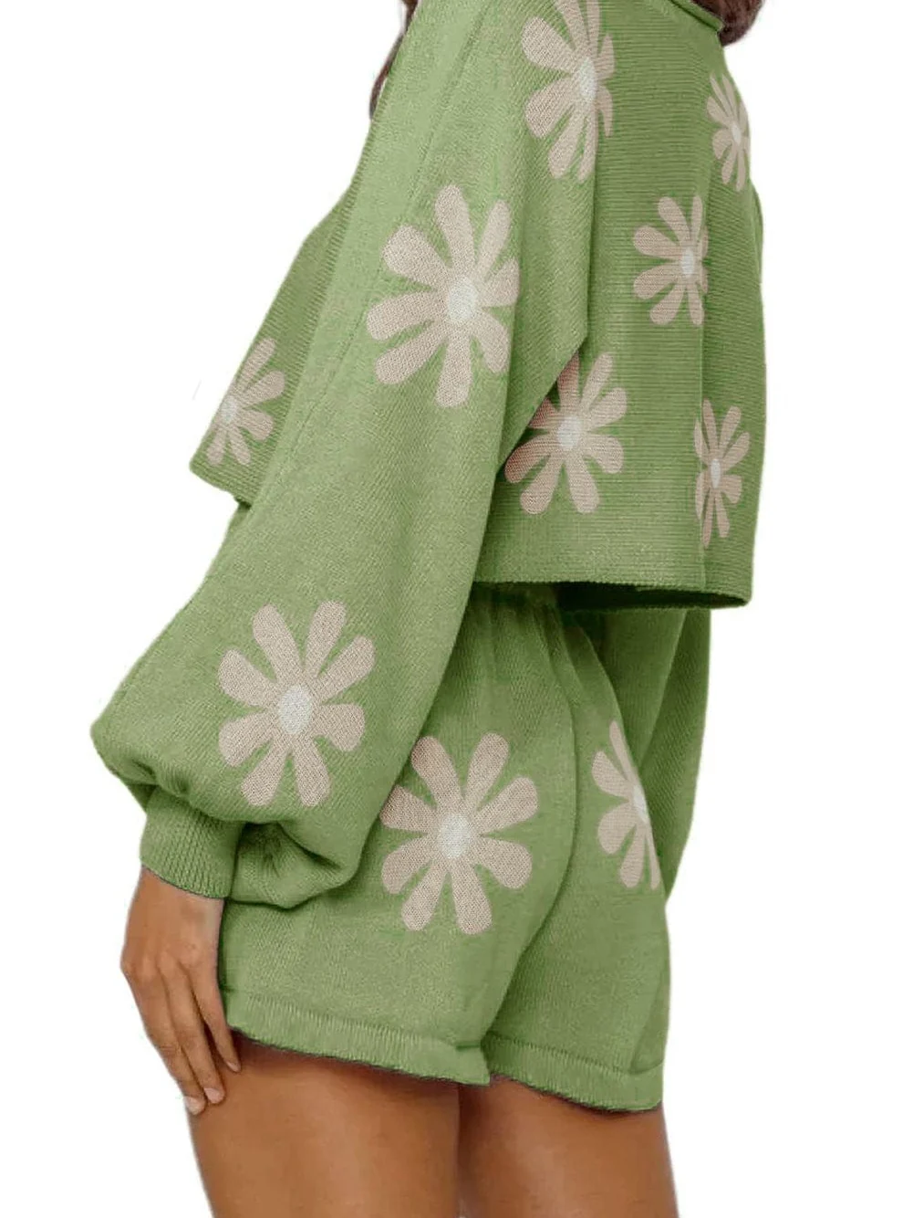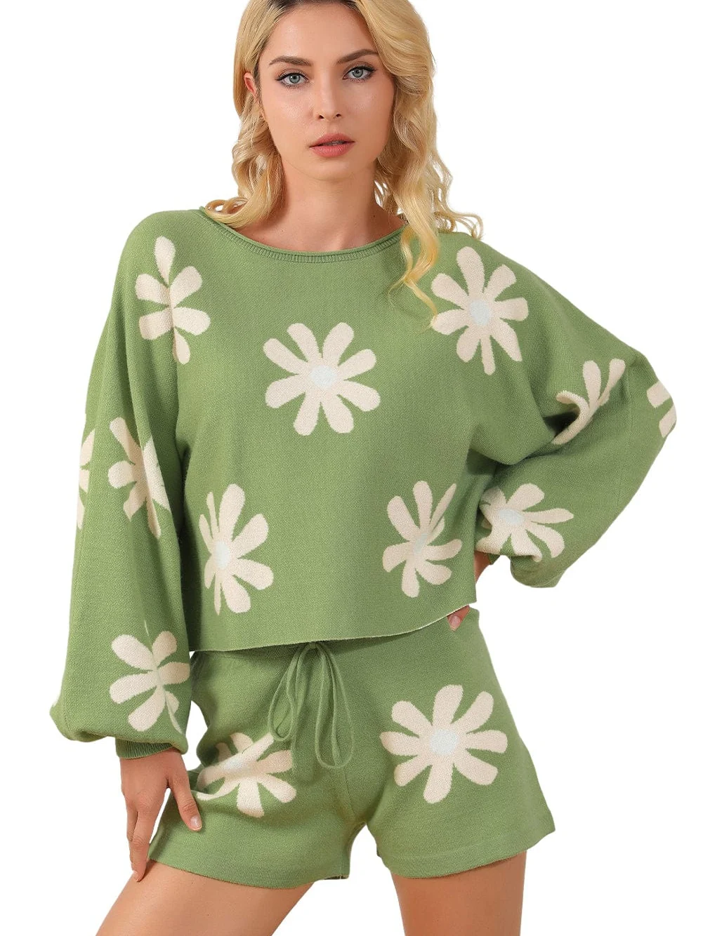 Floral Bubble Sleeve Green Knit Sweater and Shorts Ensemble