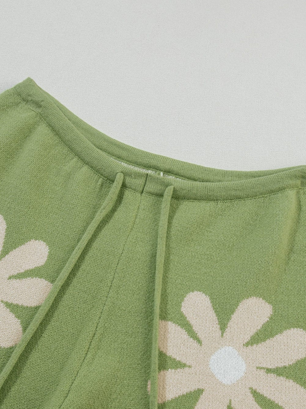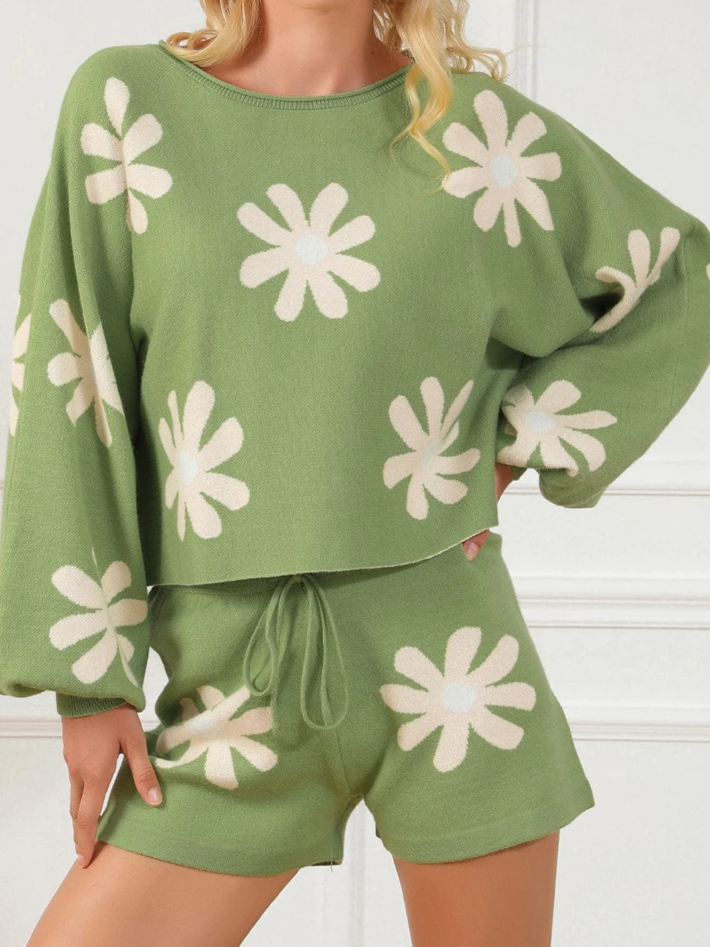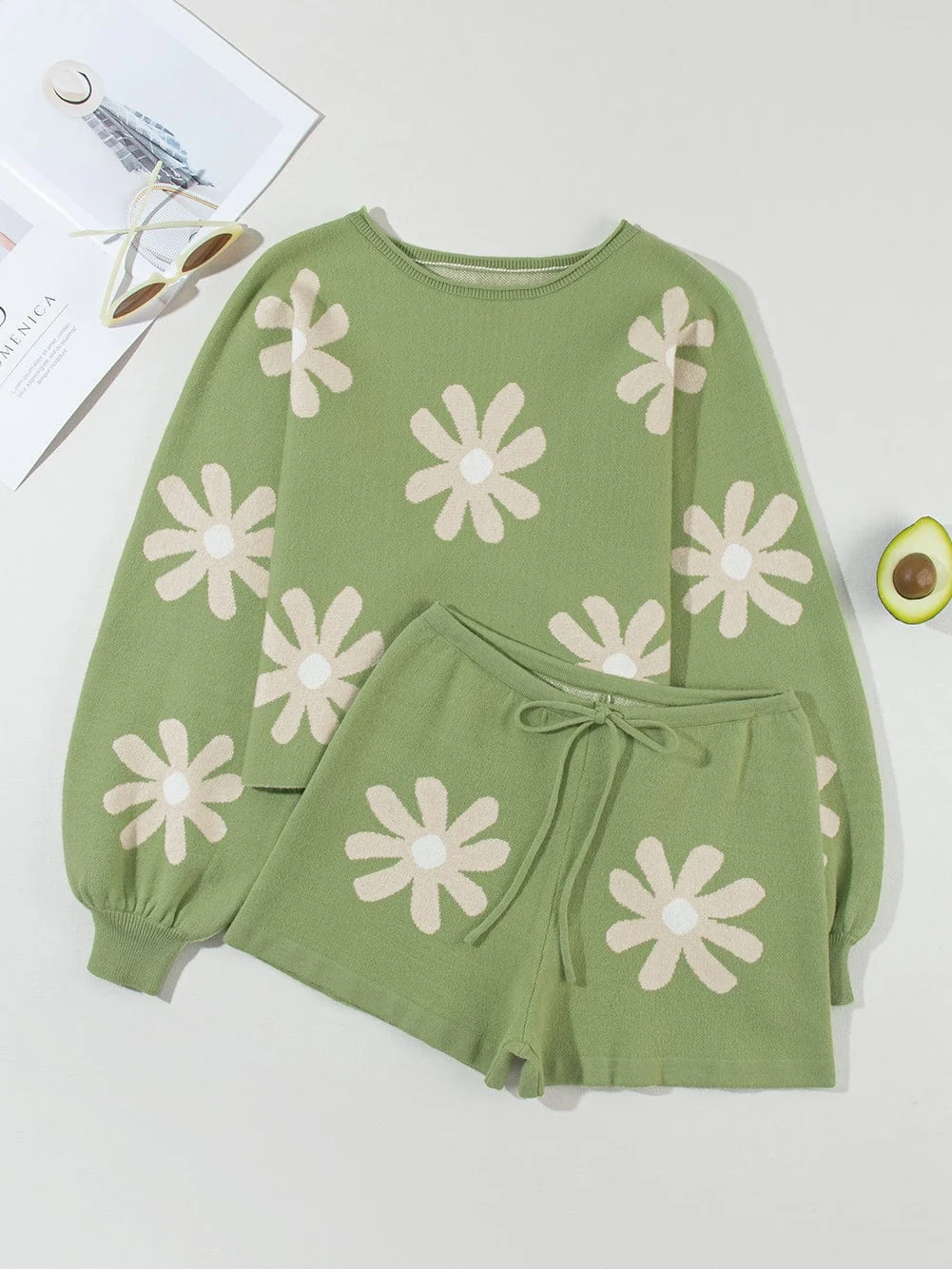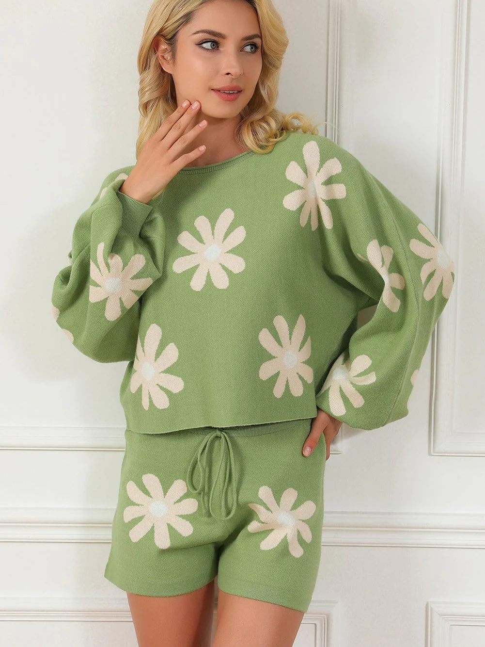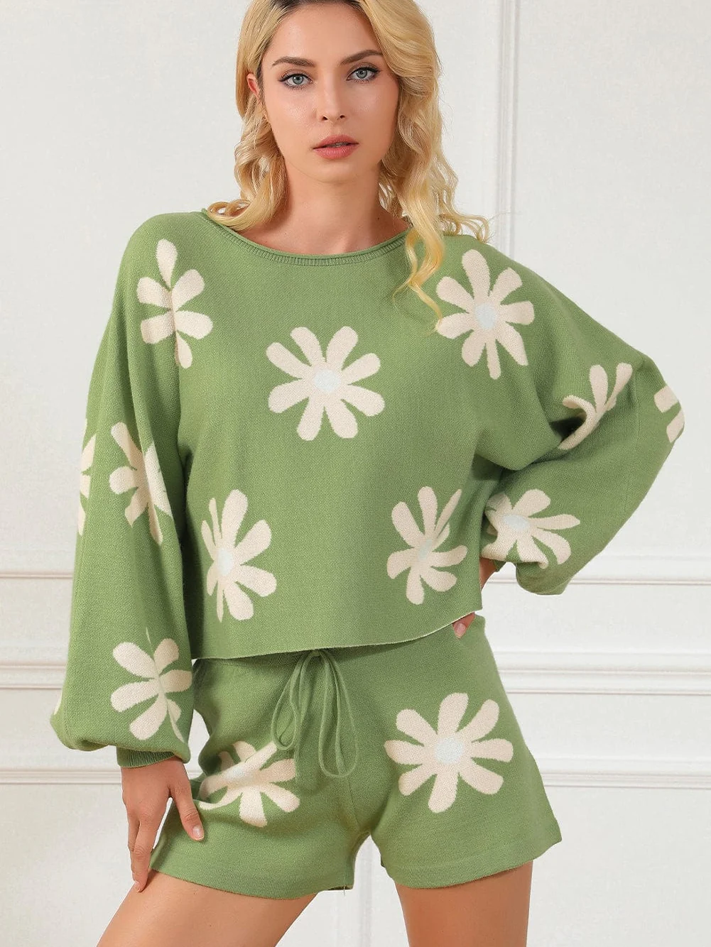 Floral Bubble Sleeve Green Knit Sweater and Shorts Ensemble