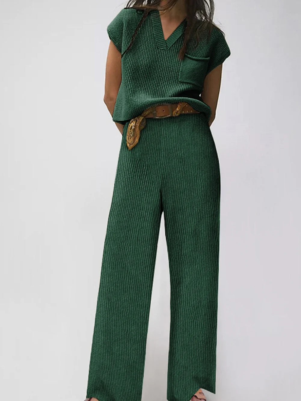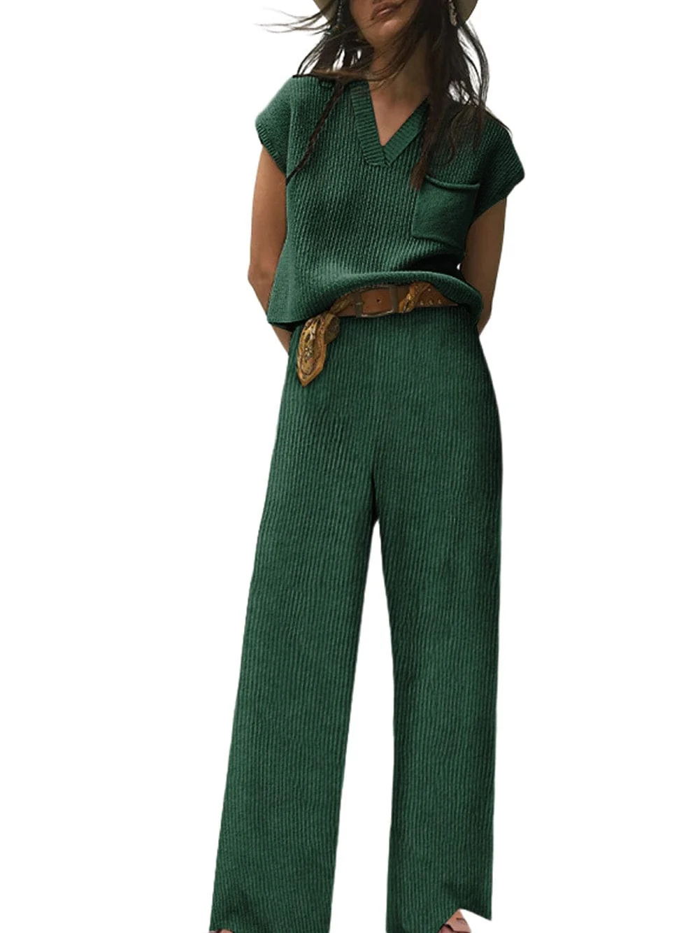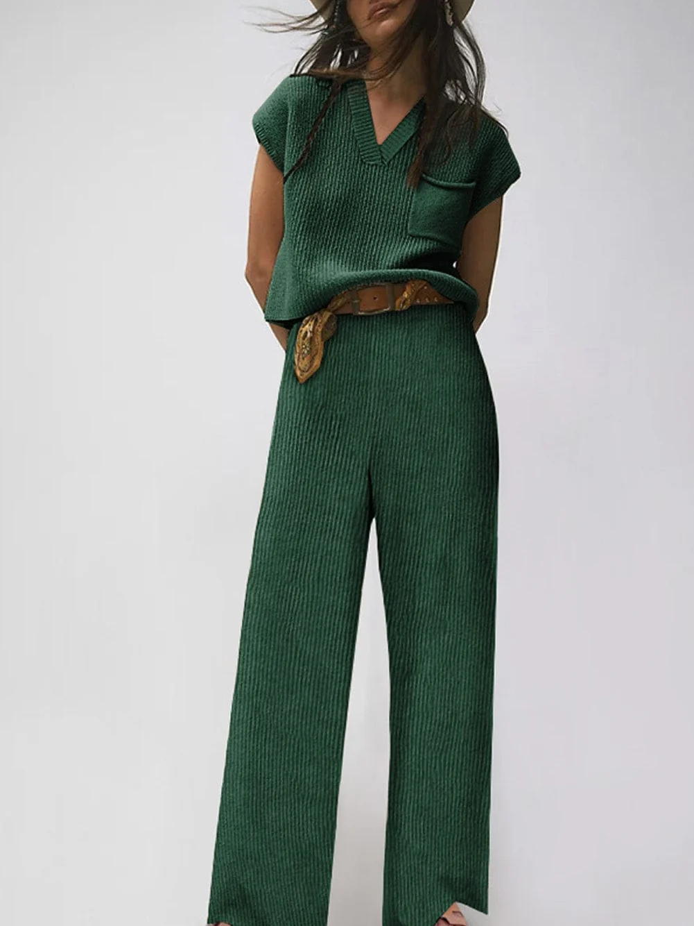 Cozy Green Ribbed Knit Two-Piece Set with V Neck Sweater and Wide Leg Pants