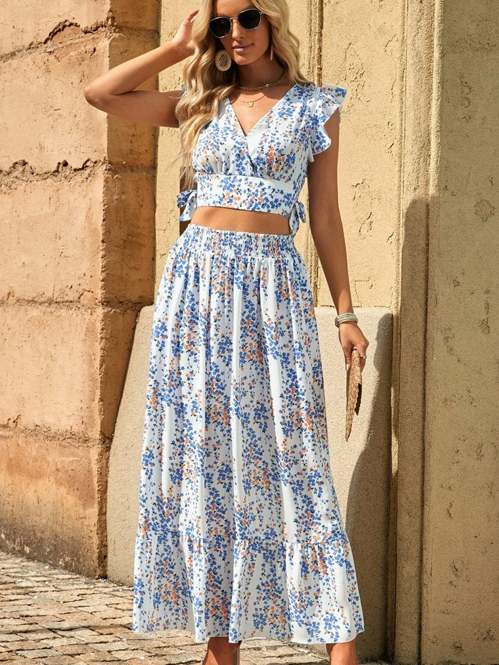 Floral White Bohemian Chic Two Piece Maxi Dress Set