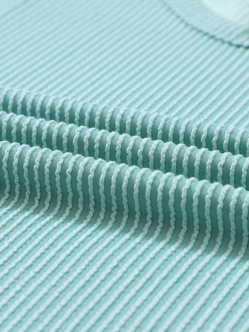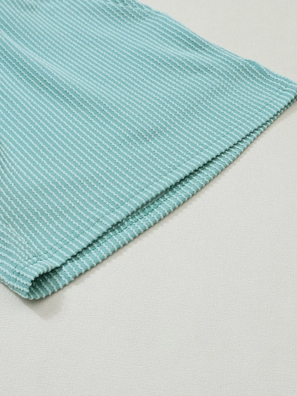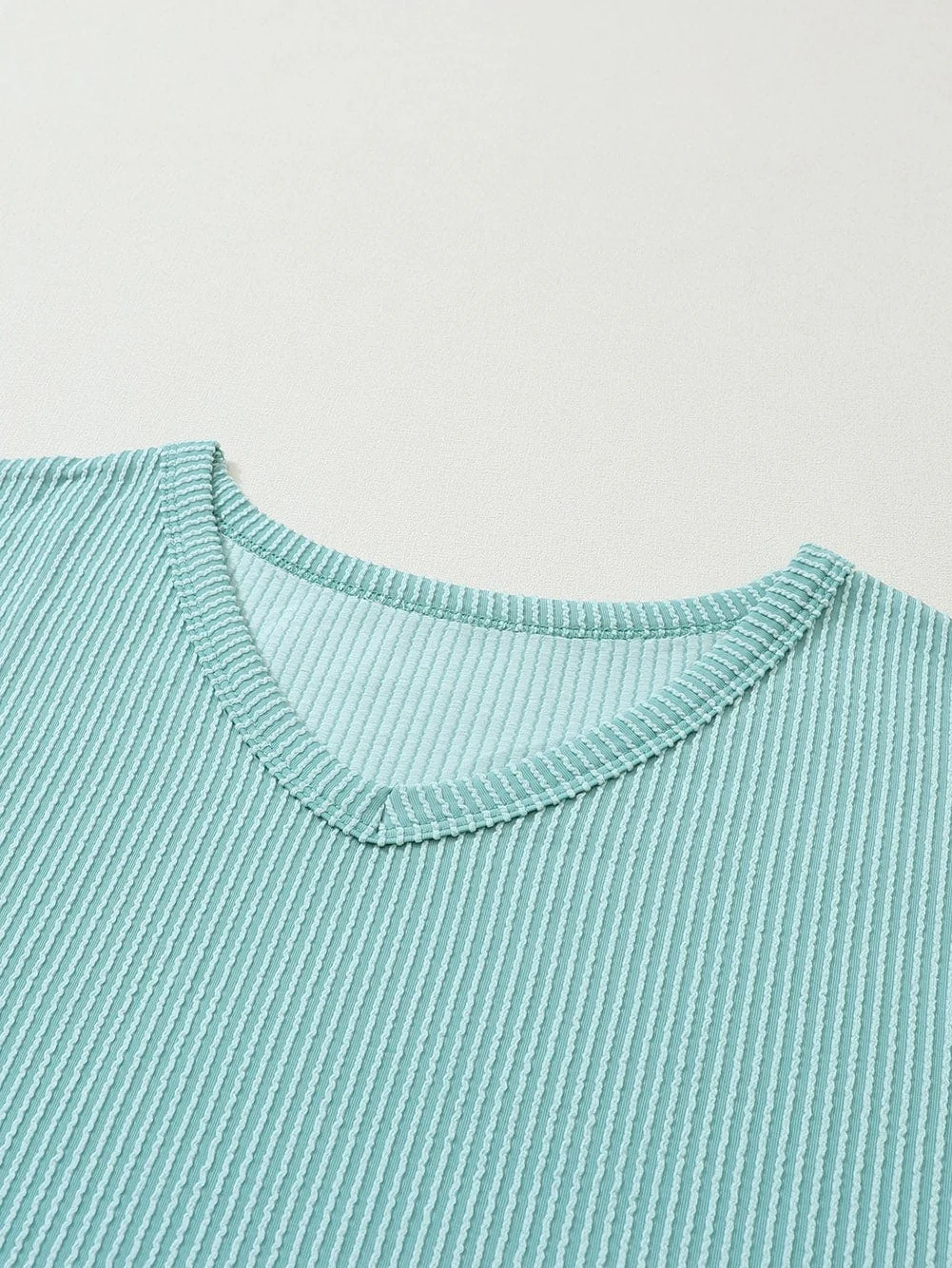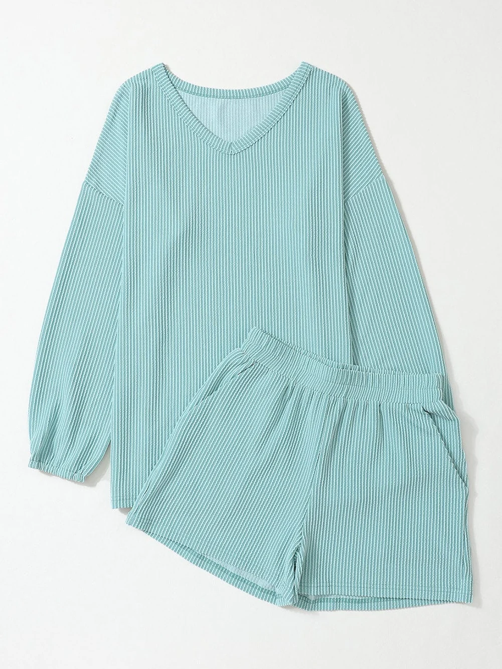Blue Ribbed V Neck Slouchy Top and Shorts Set with Pockets