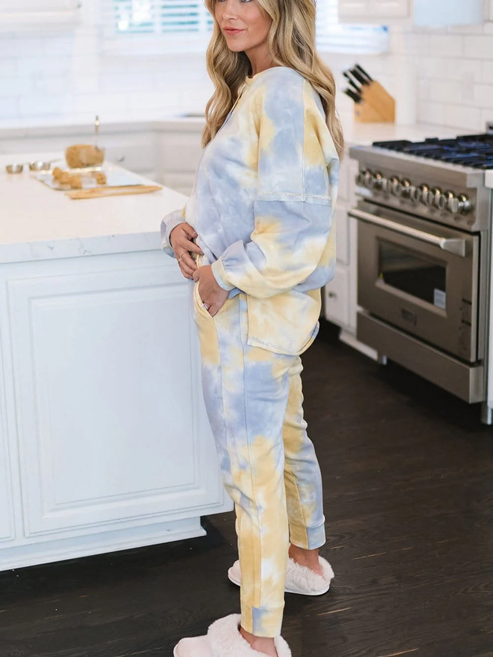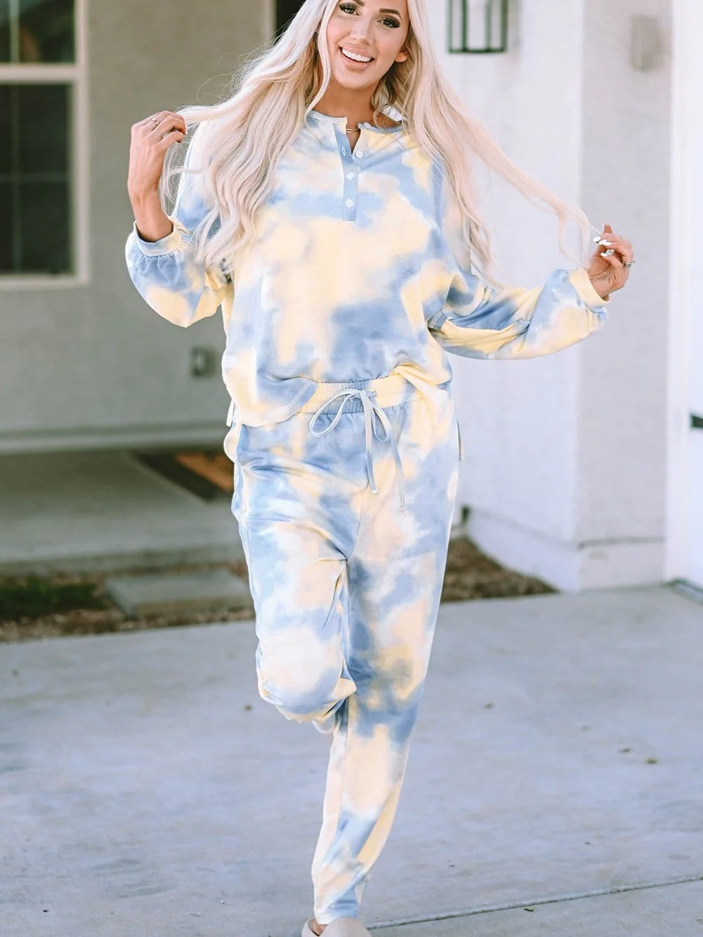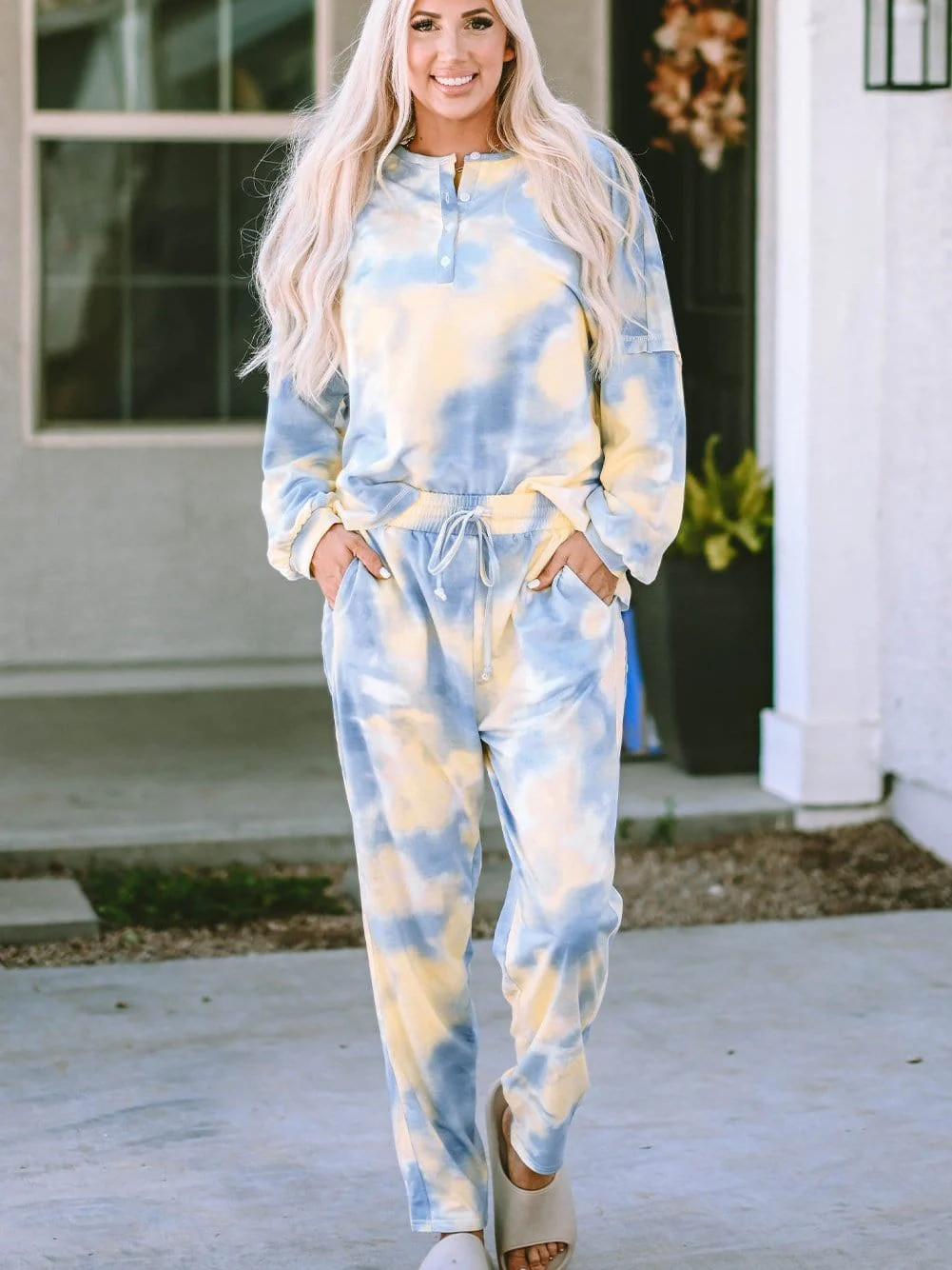 Trendy Multicolored Tie Dye Henley Top and Drawstring Pants Set