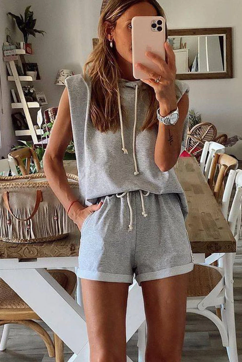 Gray Hooded Tank Top and Shorts Set with Adjustable Drawstring