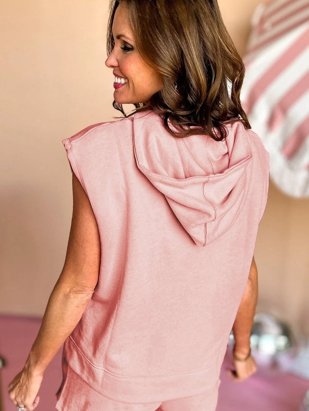 Light Pink Sleeveless Hoodie and High-Waist Shorts Set in Solid Color