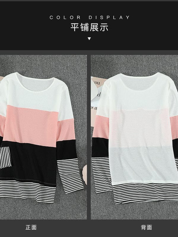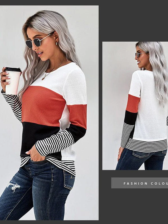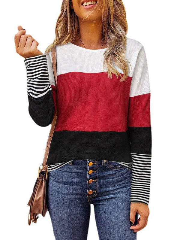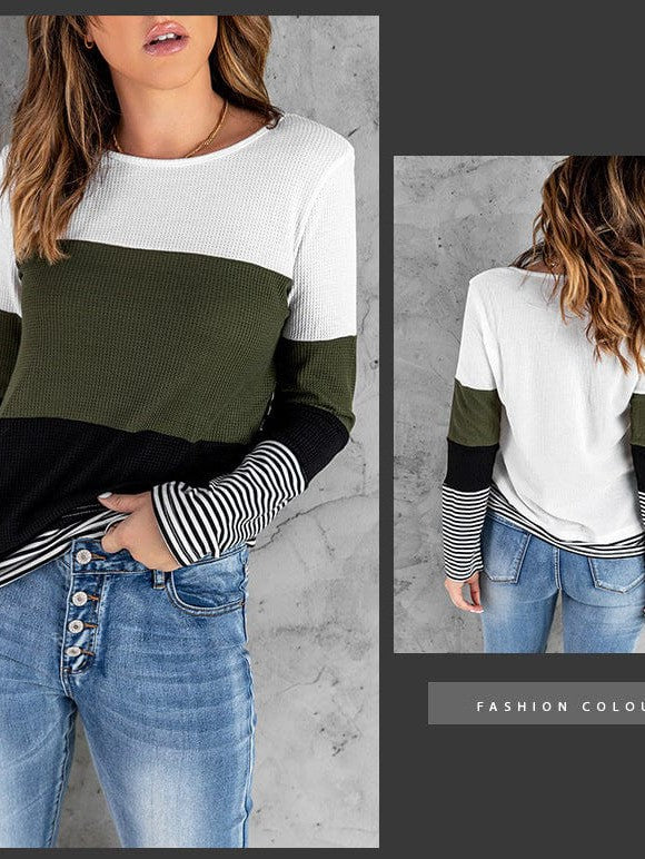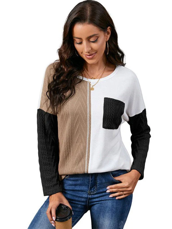 Fashion Round Neck Pullover With Contrasting Colors - Women'S Long Sleeve Loose Slimming Top