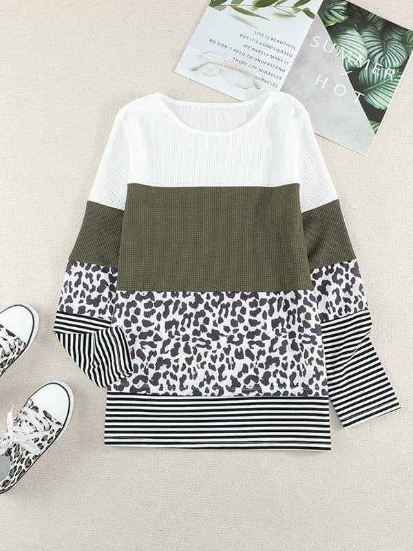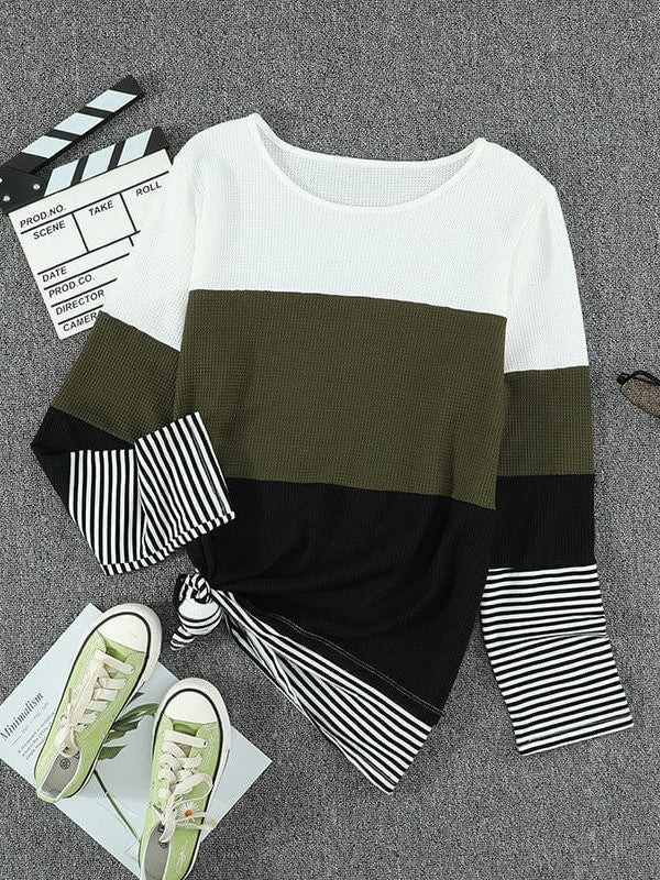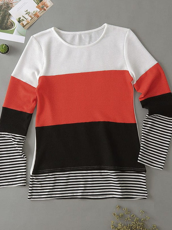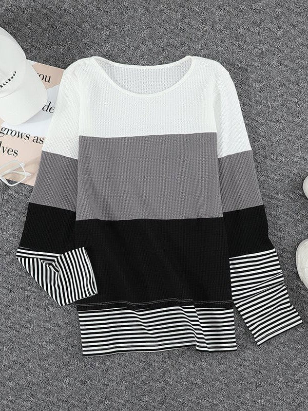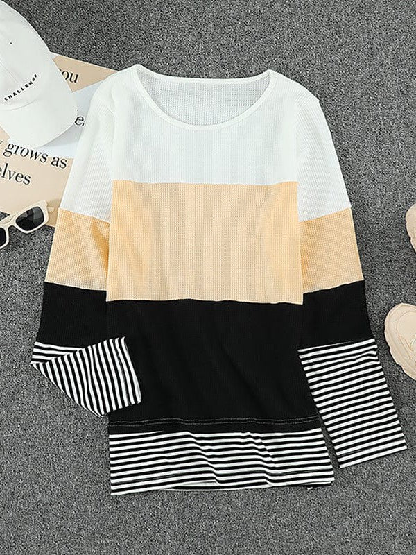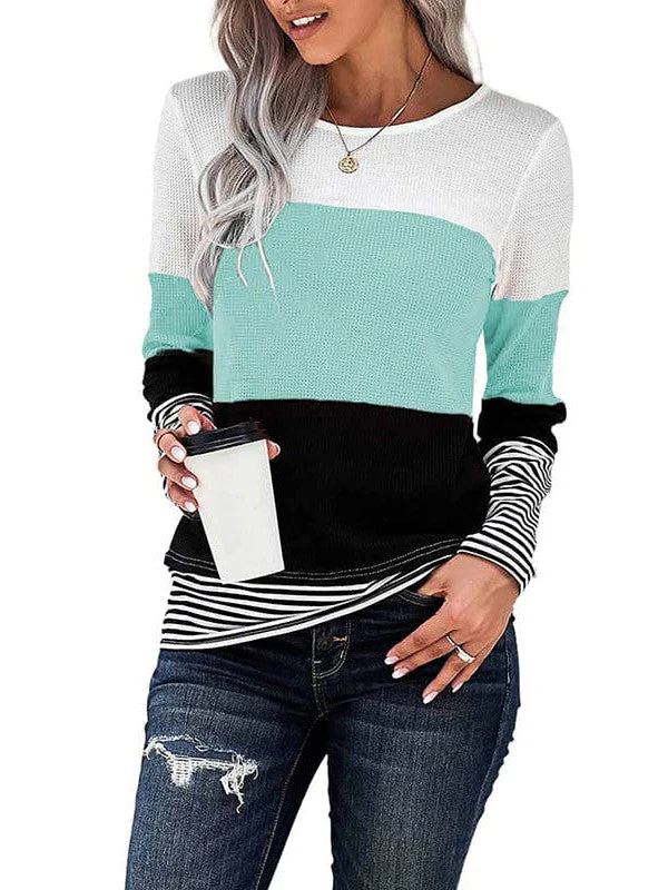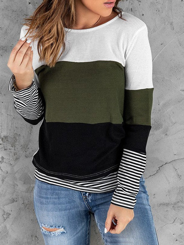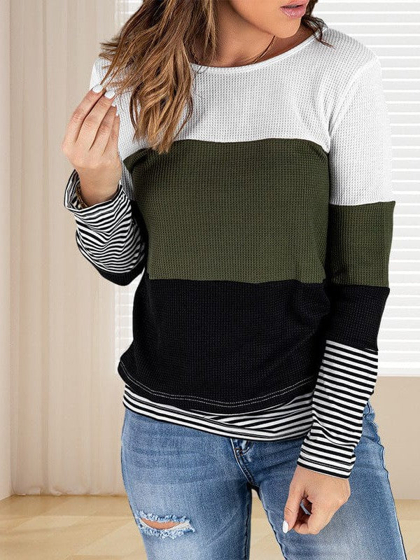 Women'S Striped Waffle Long-Sleeve Pullover Top With Round Neck