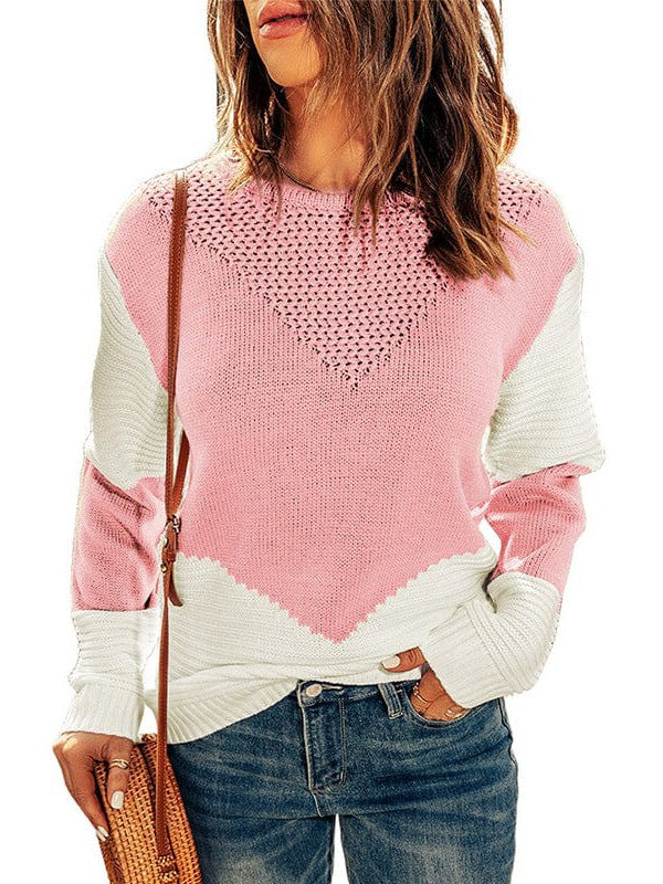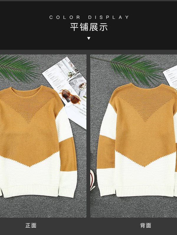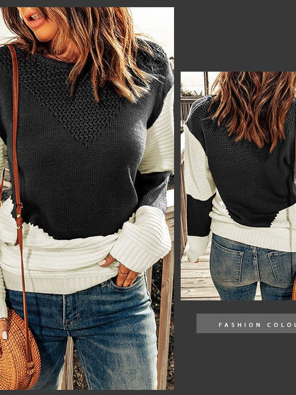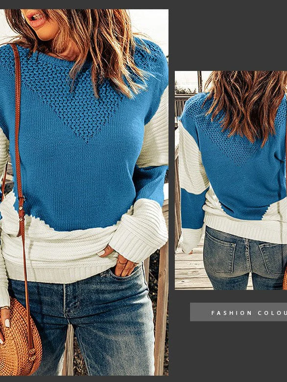 Women'S Loose Fit Color Block Sweater With Crew Neck And Long Sleeves