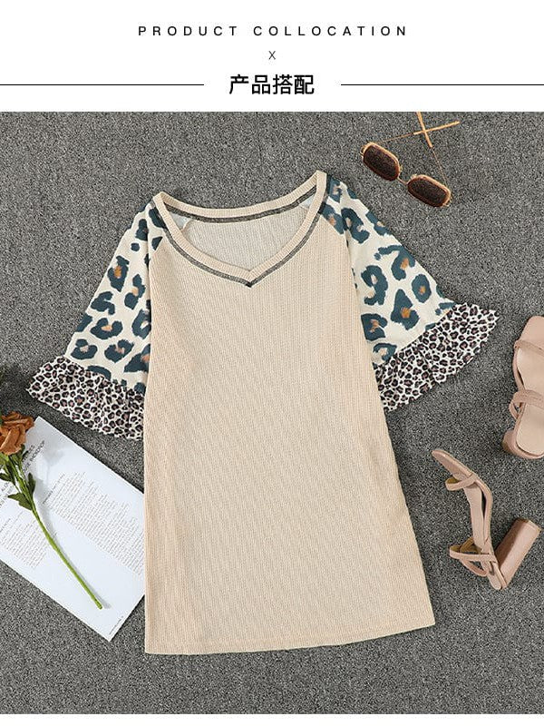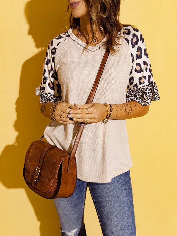 Leopard Print Quarter-Sleeve V-Neck Pullover With Solid Color Stitching Top