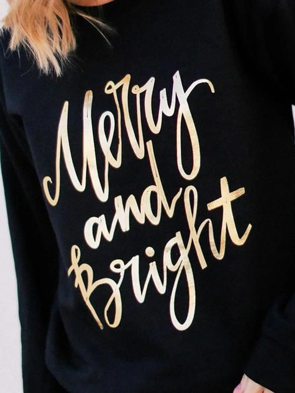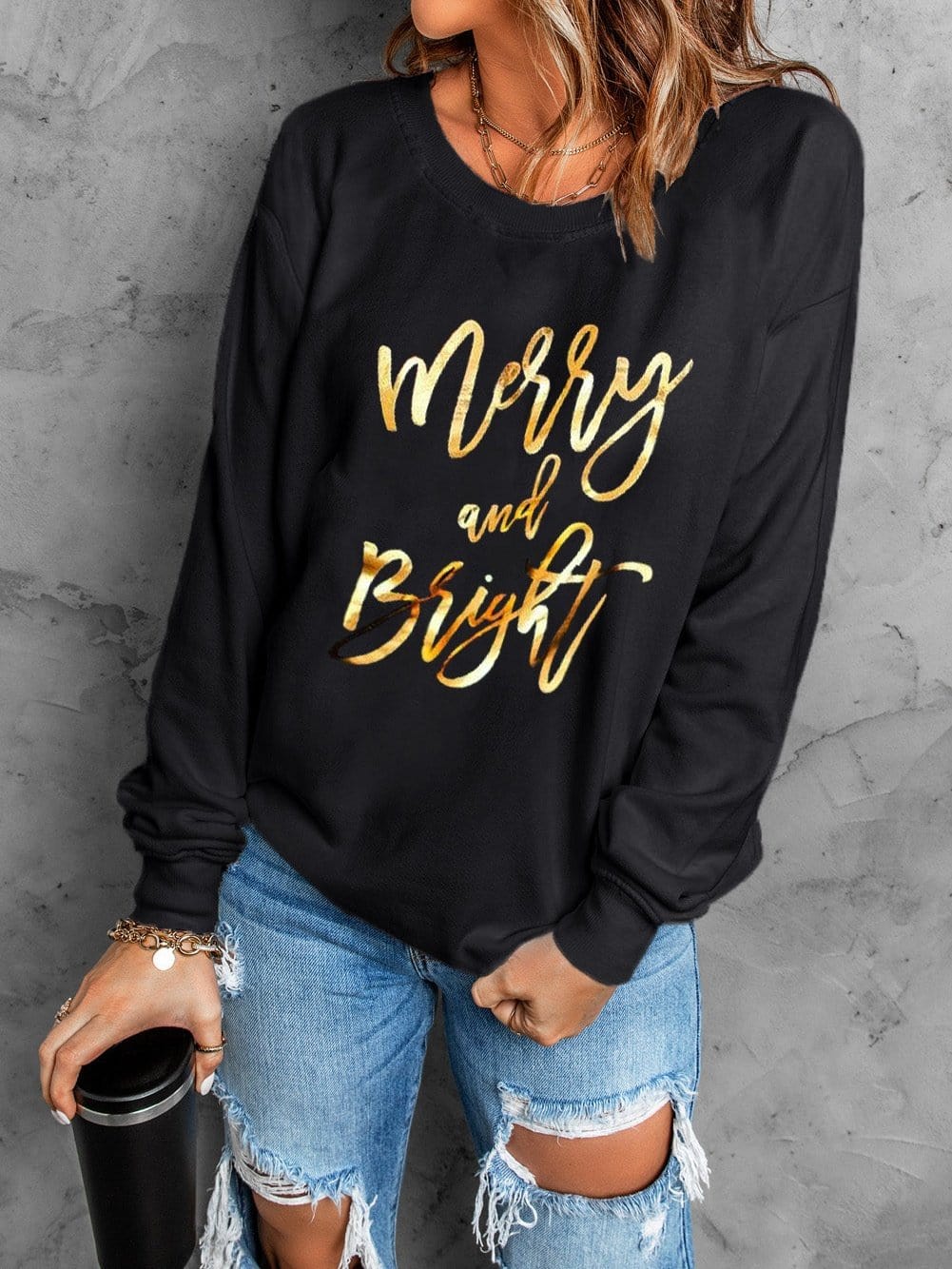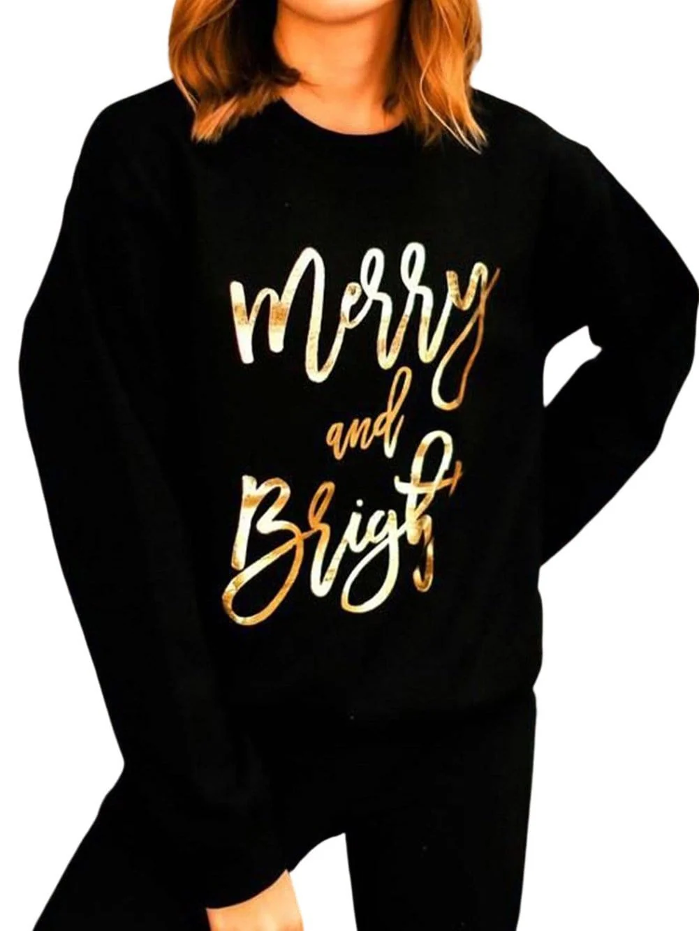Merry & Bright Black Letter Print Sweater with Round Neck