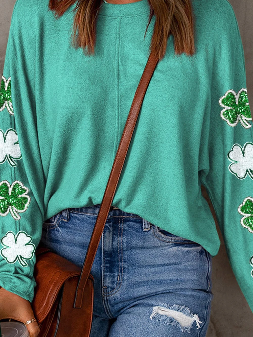 Emerald Green Sequin Four-Leaf Clover Patched Sweater Top