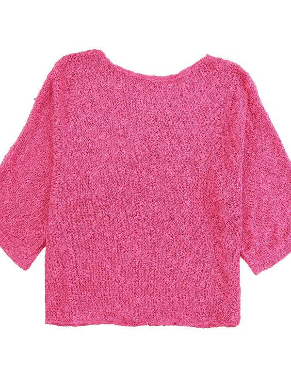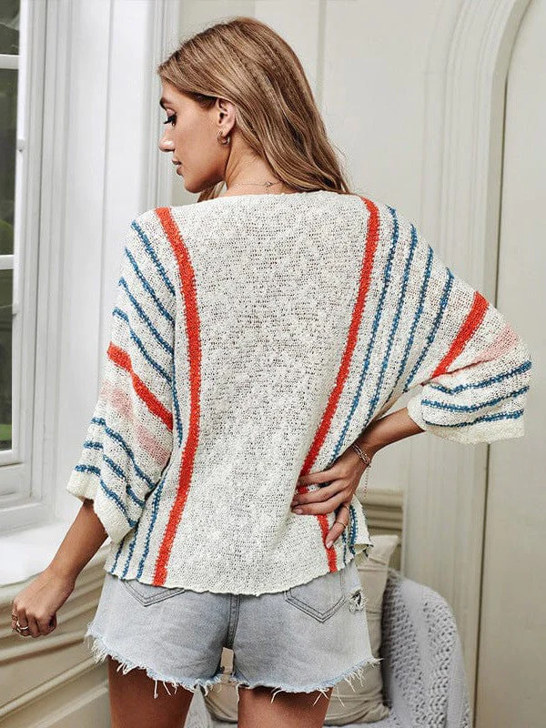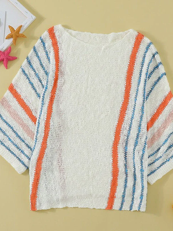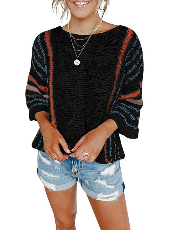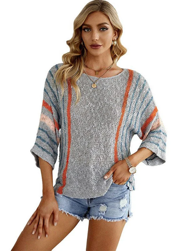 Striped Knit Quarter-Sleeve Sweater For Women With Round Neck
