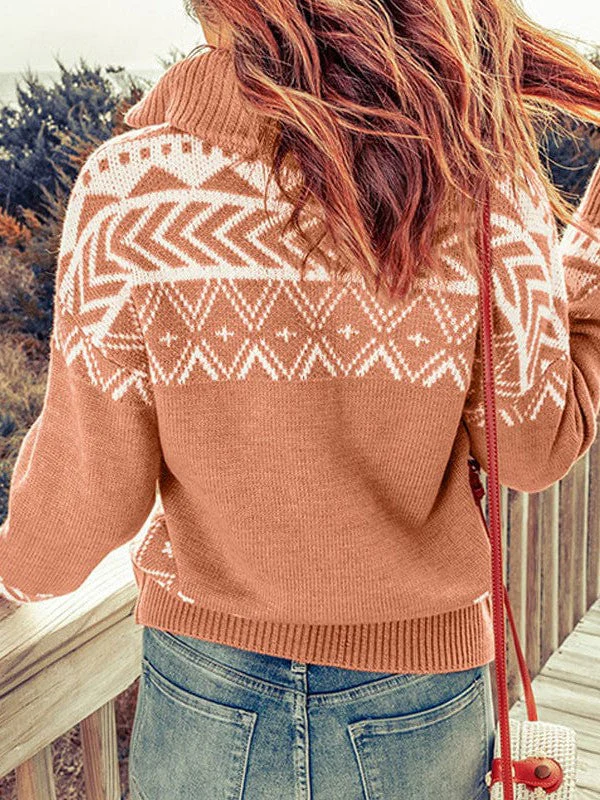 Loose Fit Geometric Stand Collar Sweater With Zipper Detail For Women