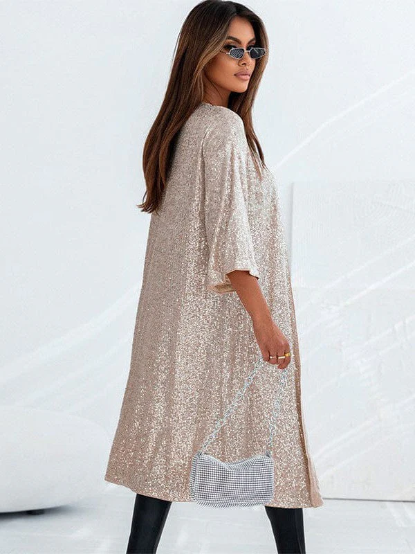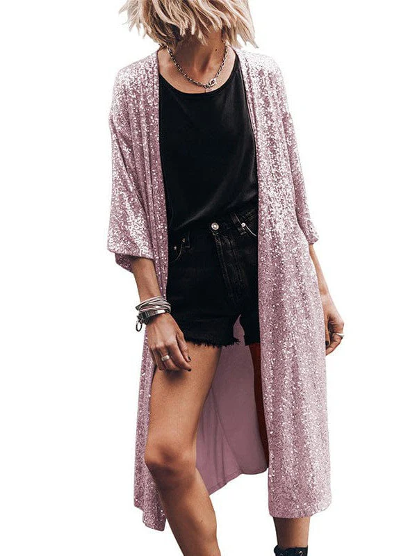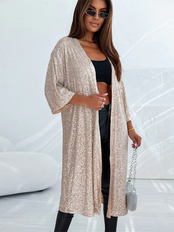 Sequined Three-Quarter Sleeve Cardigan With Casual Style And Long Length