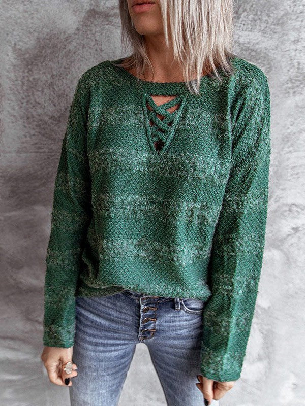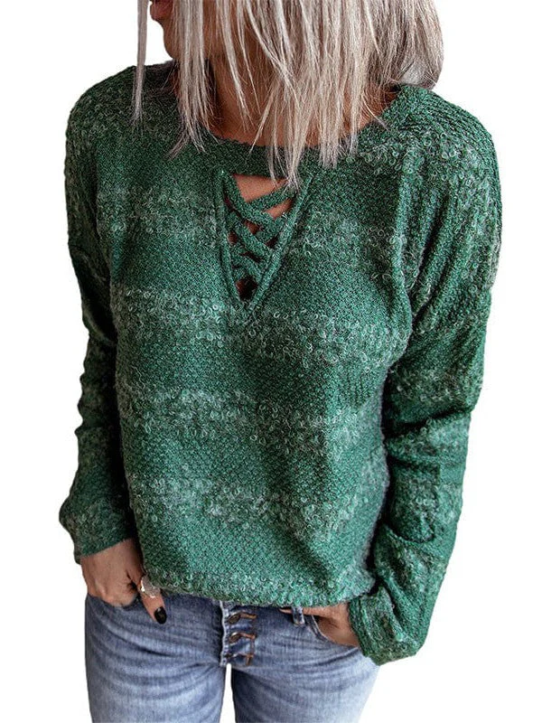Cross Hollow Woolen Sweater With Long Sleeve For Women In Green