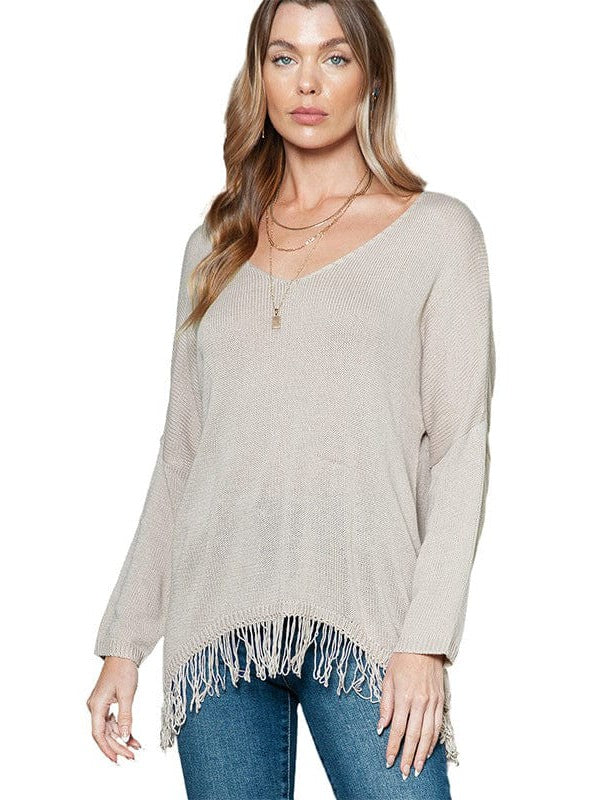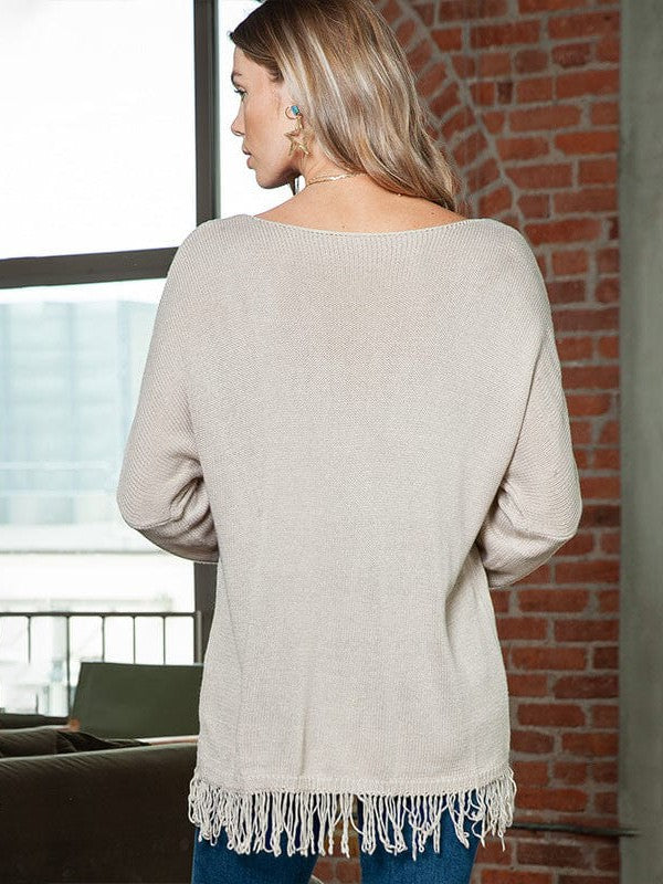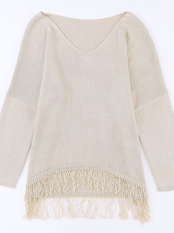 Women'S V-Neck Off-Shoulder Loose Sweater With Tassel Details