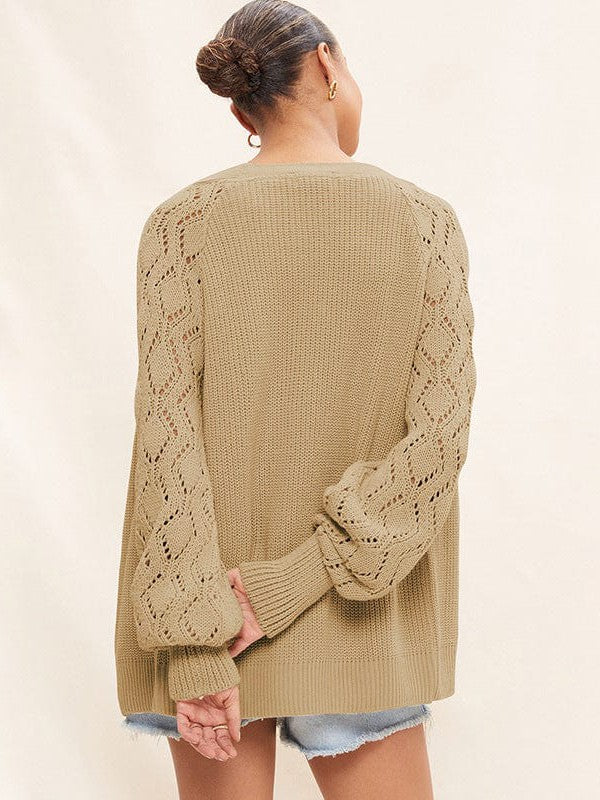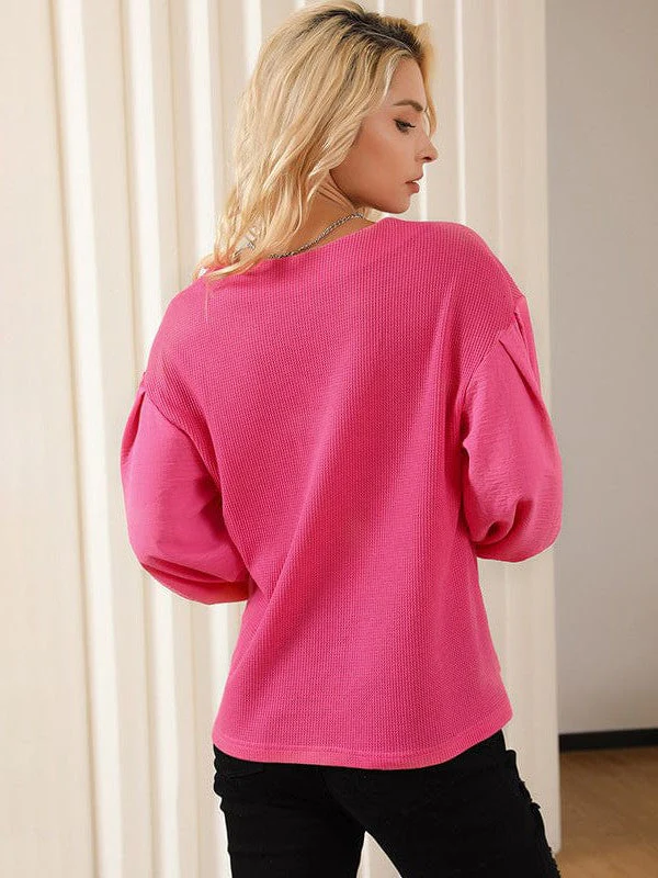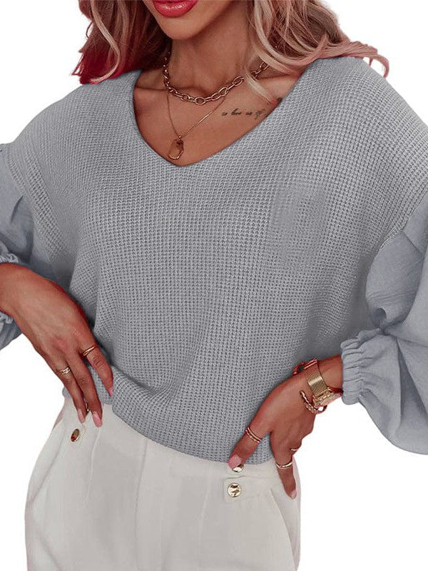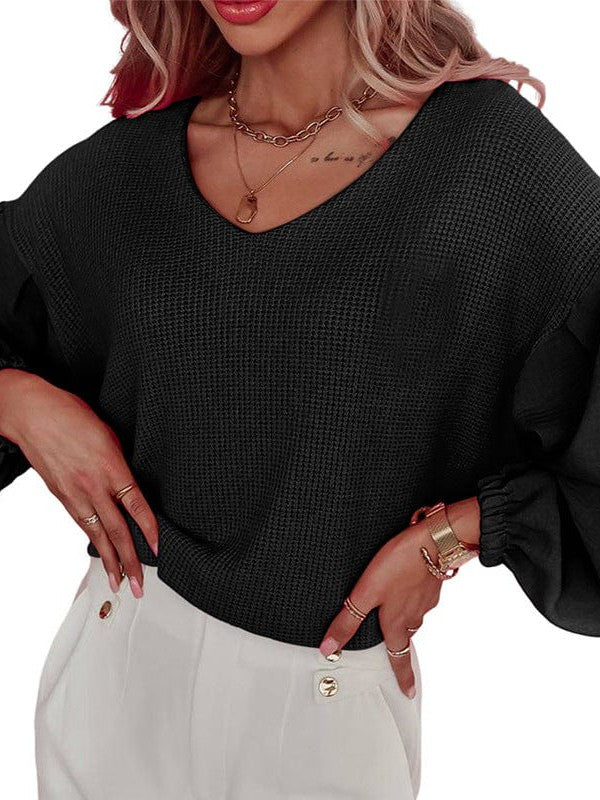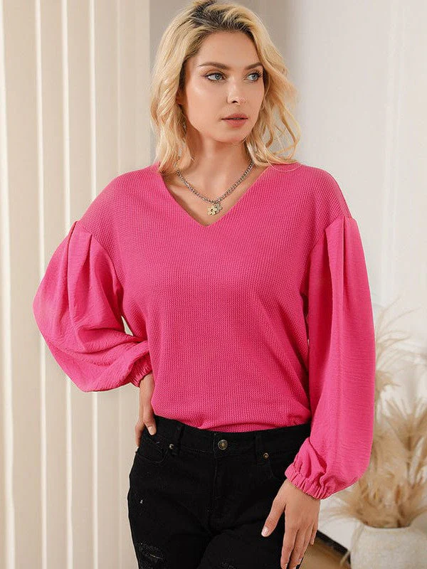 V-Neck Lantern Sleeve Solid Color Pullover Top For Women