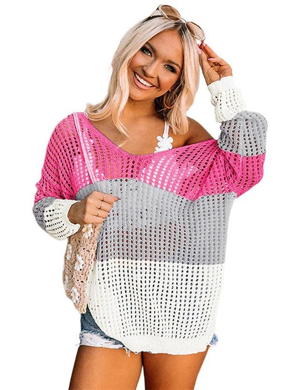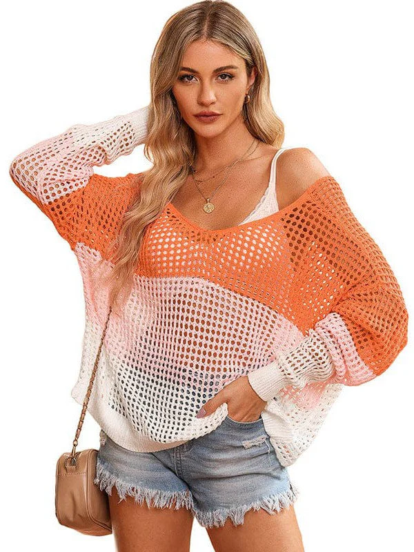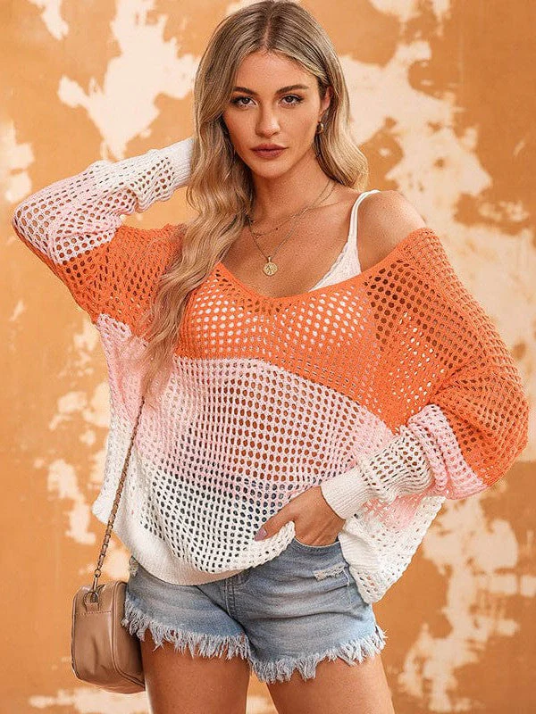 Colorful Twist Backless Knitted Sweater With Hollow Design And Long Sleeves, A Casual Style Top For Women