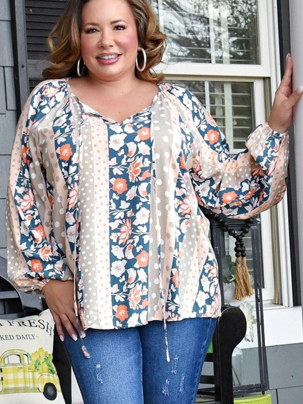 Multicolor Plus Size Mixed Print Split Neck Blouse