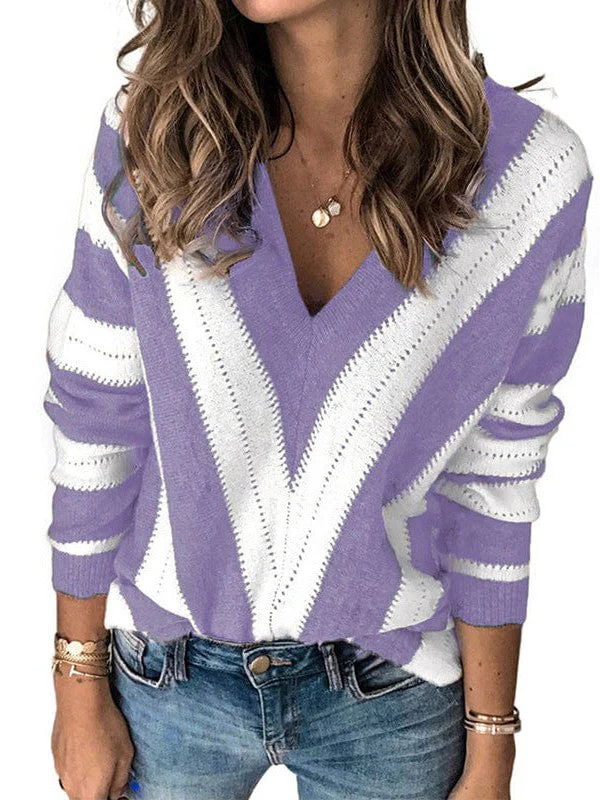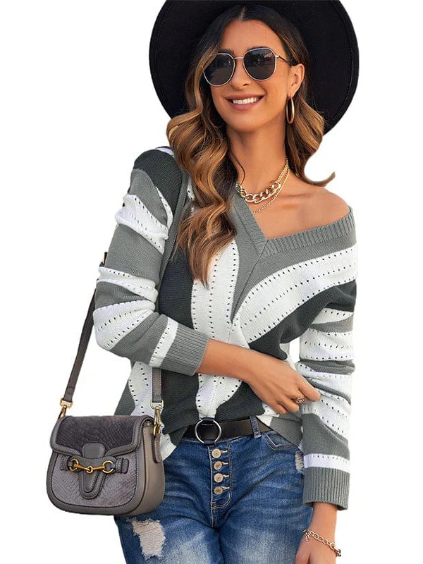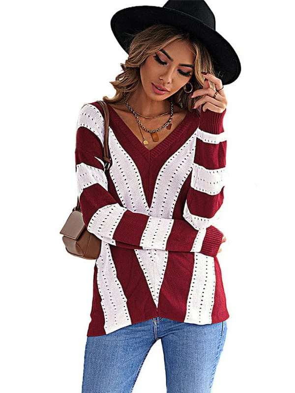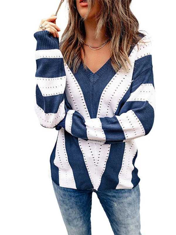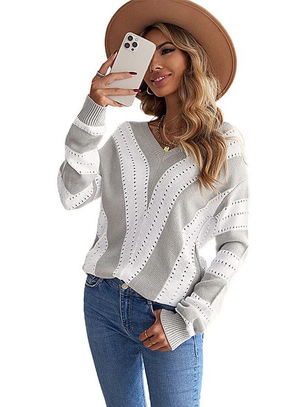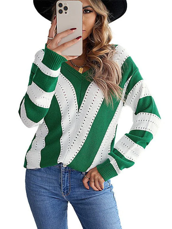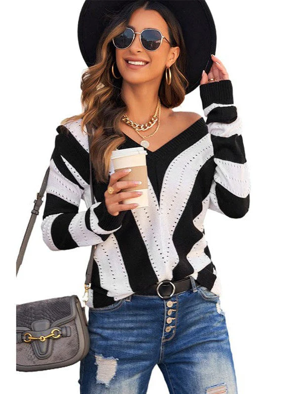 Simple Striped Knit Outerwear For Women With Long Sleeves And Contrast Bottom Detail