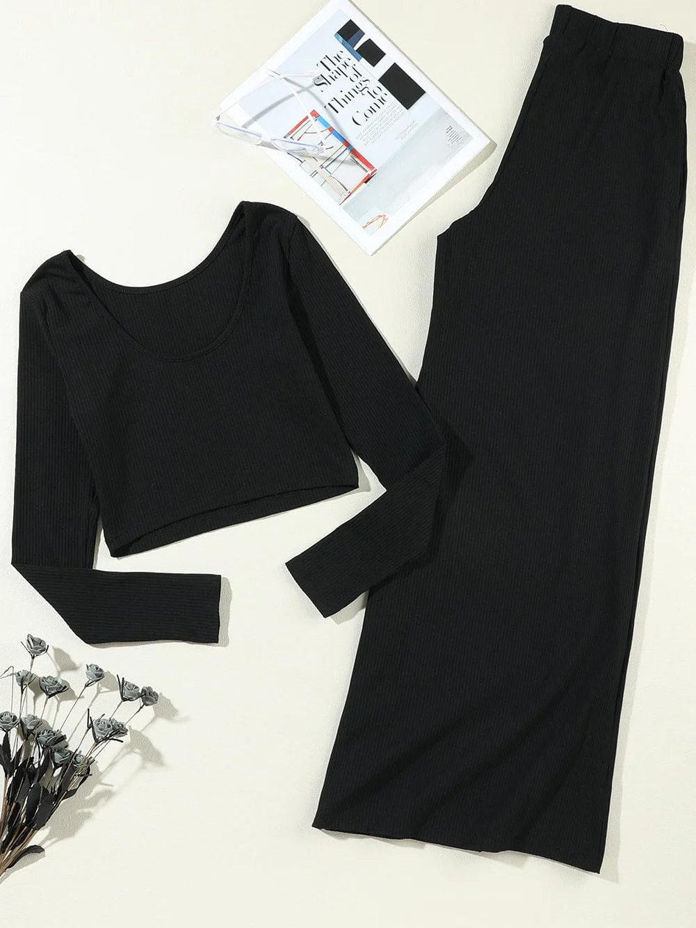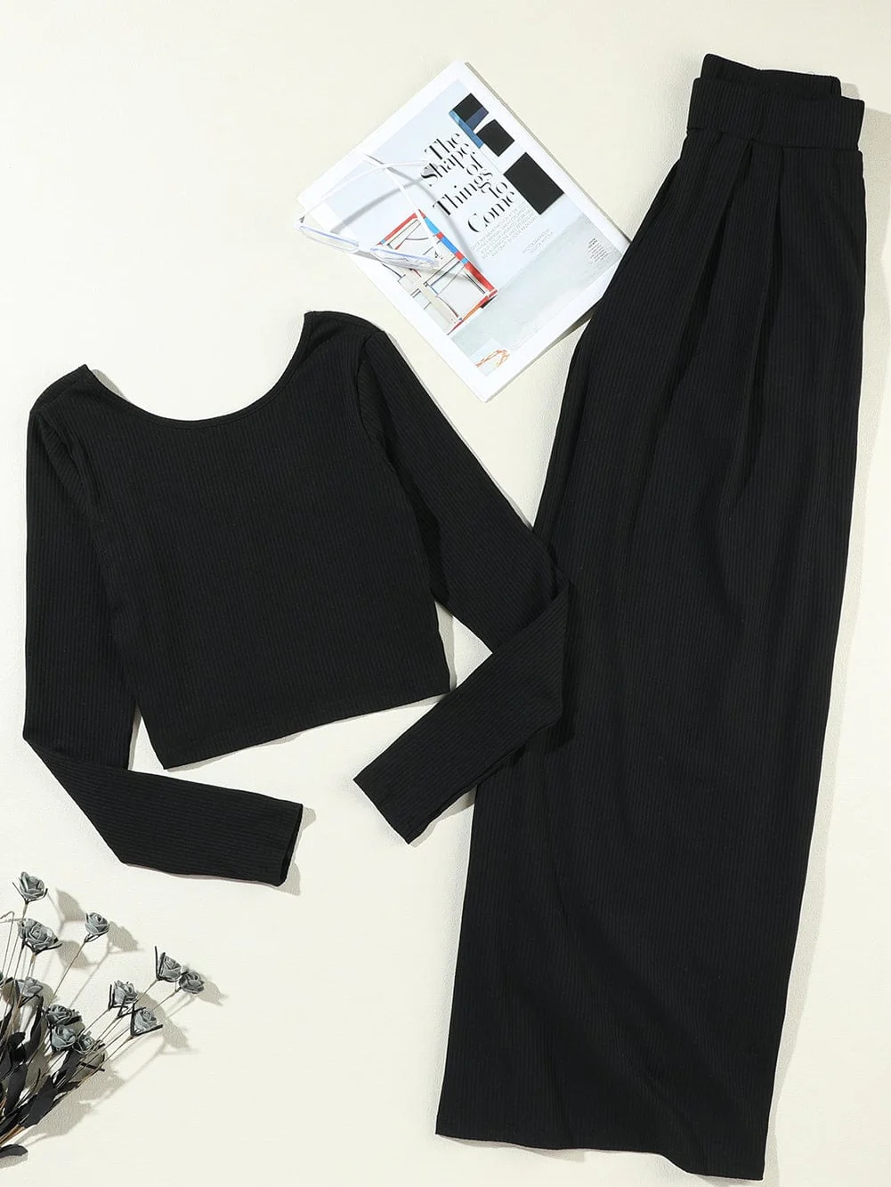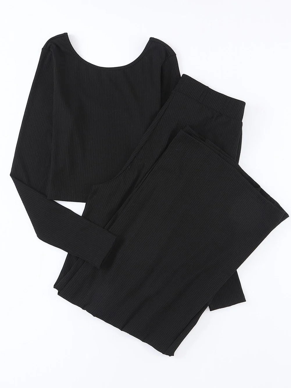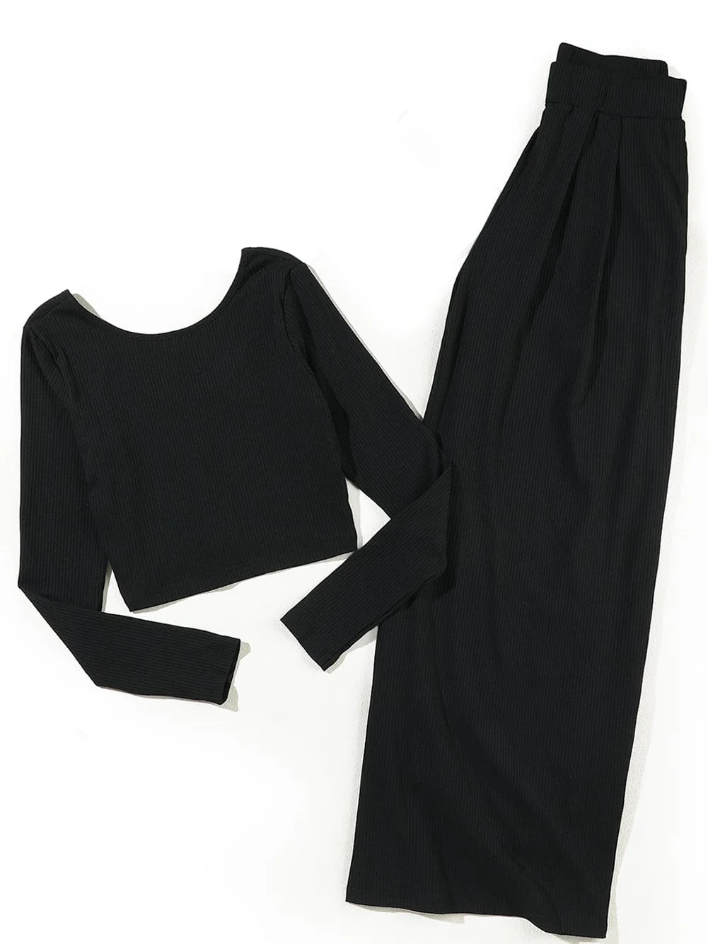 Black Ribbed Crop Top and High Waist Pants Set with Stylish Flare